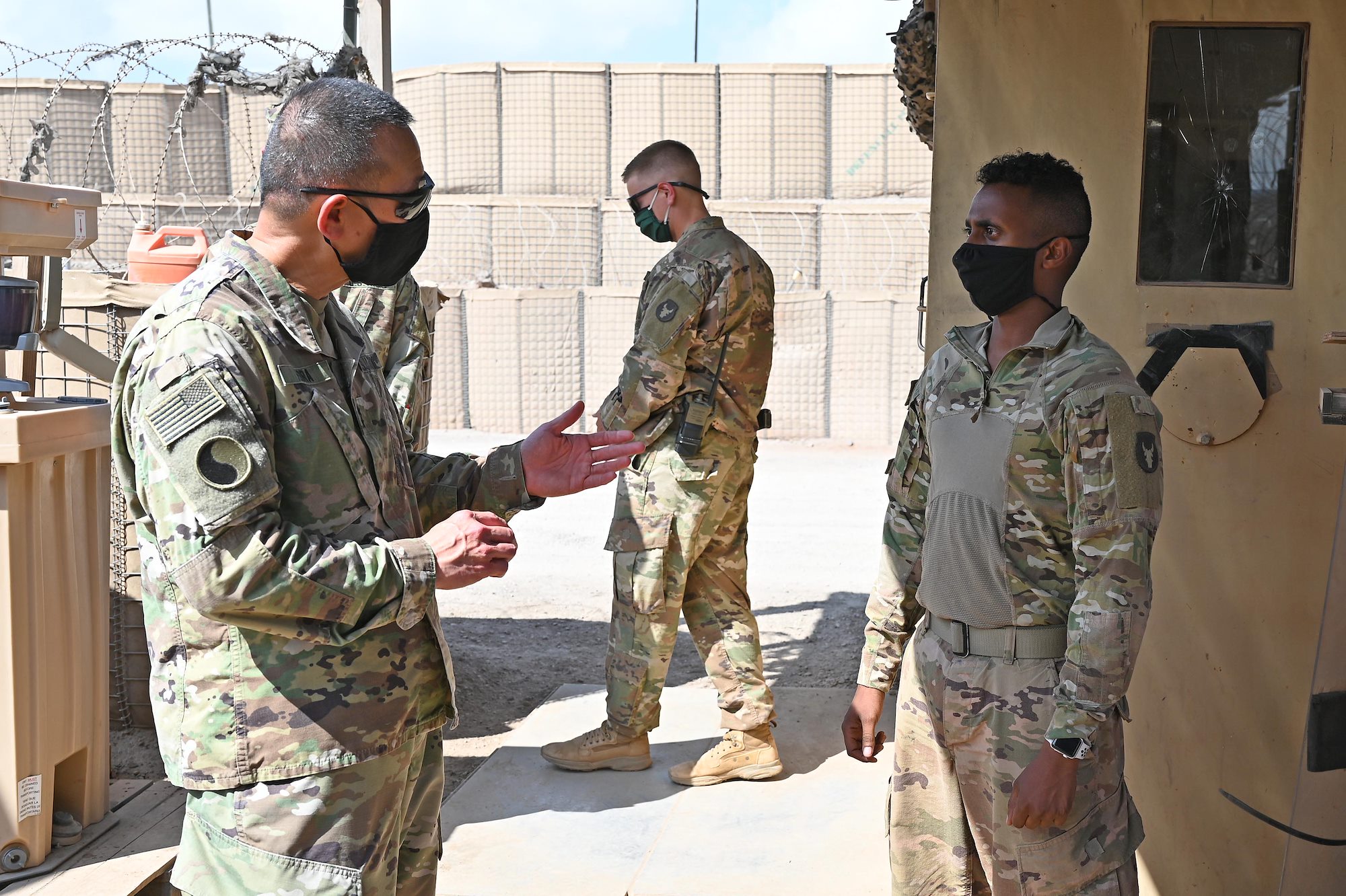 U.S. Army Maj. Gen. Lapthe C. Flora, commanding general, Combined Joint Task Force-Horn of Africa (CJTF-HOA), speaks with U.S. Army Spc. Mohammed Ali, a Soldier with Task Force Bayonet, while visiting Chabelley Airfield, Djibouti, Oct. 31, 2020. Flora spent the afternoon getting a first-hand look at force protection measures and thanking serves members for their continued service. (U.S. Army National Guard photo by Sgt. Brandon Julson)