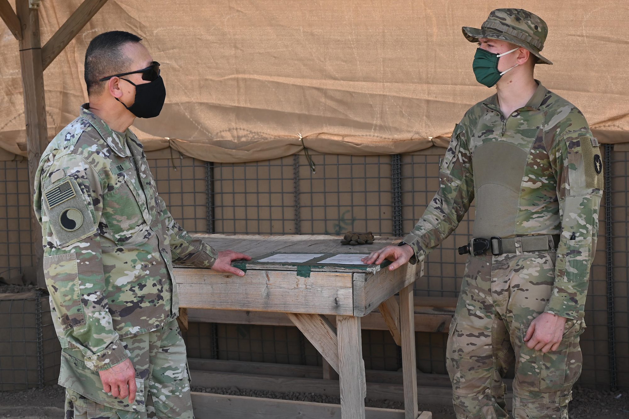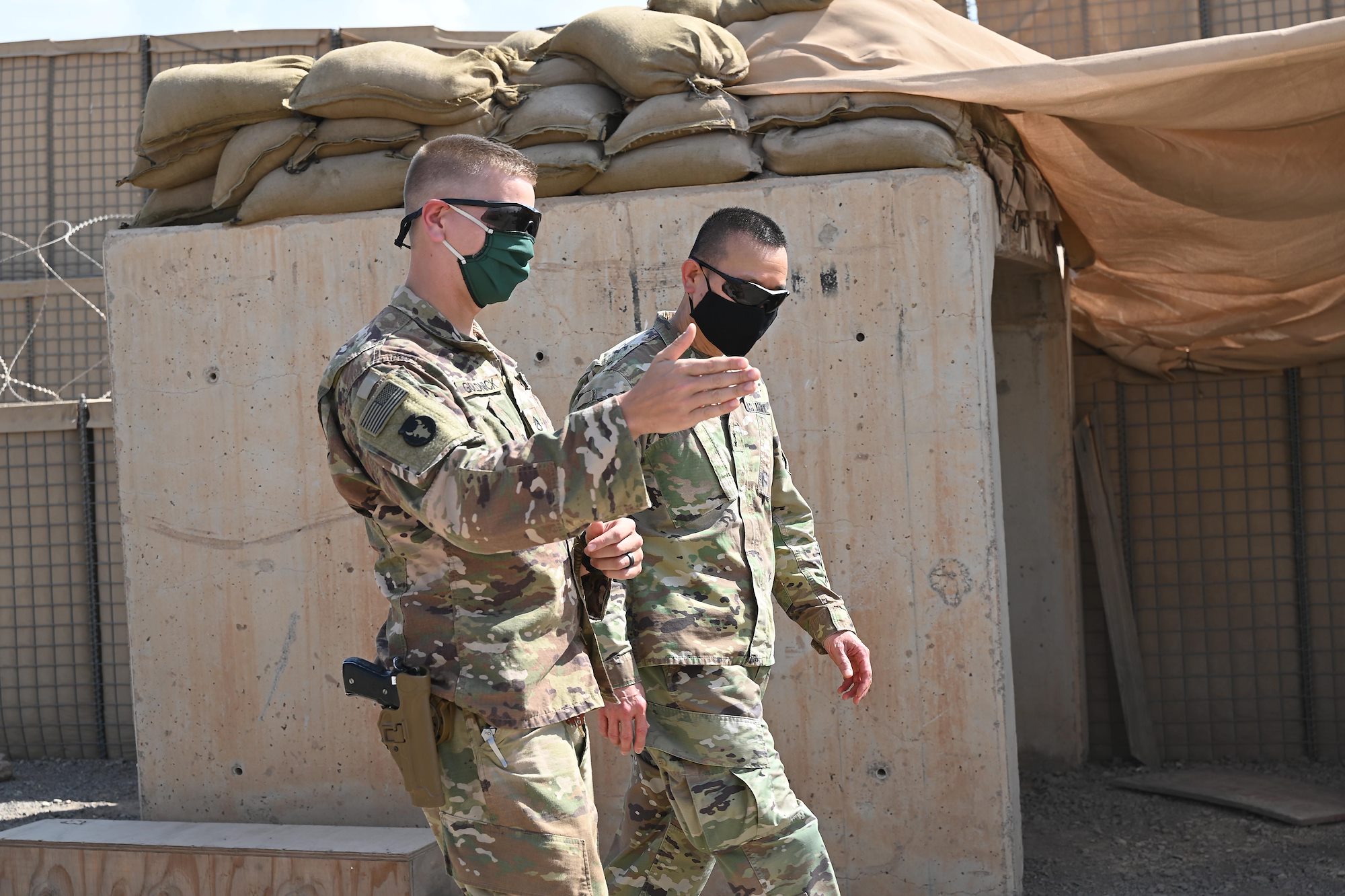 U.S. Army Staff Sgt. Justin Goldnick, an 11B infantryman squad leader with Task Force Bayonet, speaks with U.S. Army Maj. Gen. Lapthe C. Flora, commanding general, Combined Joint Task Force-Horn of Africa (CJTF-HOA), during his visit to Chabelley Airfield, Djibouti, Oct. 31, 2020. Flora spent the afternoon getting a first-hand look at force protection measures and thanking serves members for their continued service. (U.S. Air Force photo by Tech. Sgt. Dana J. Cable)