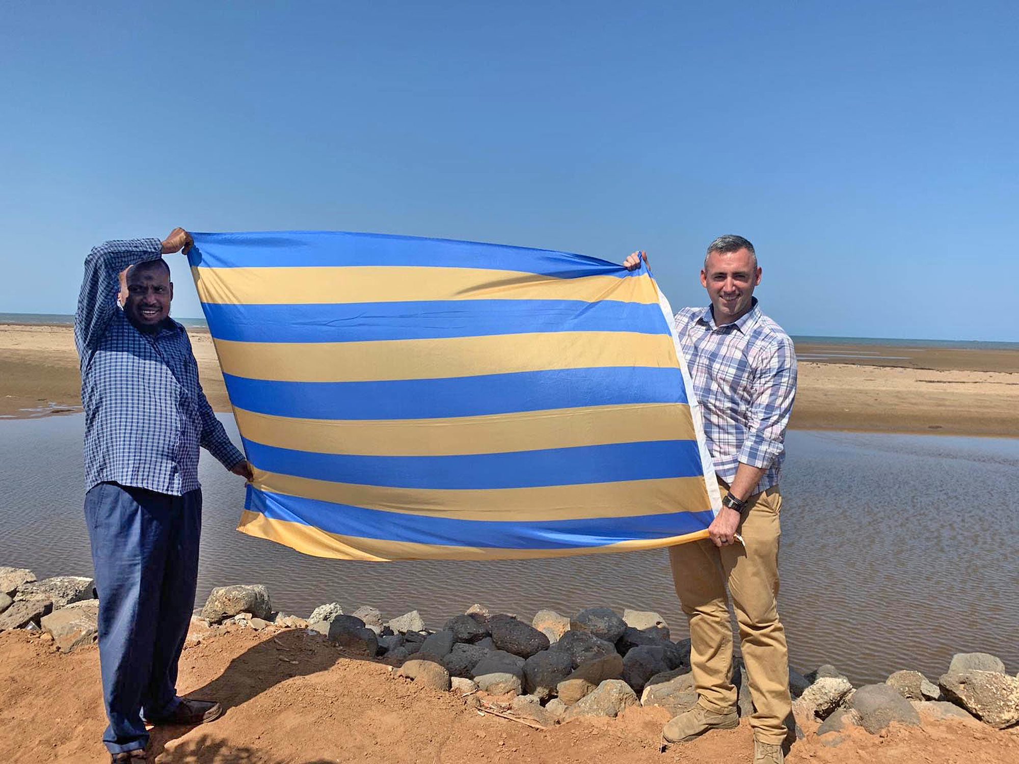 U.S. Army Capt. Jake Day, information operations deputy director and special technical operations chief, Combined Joint Task Force–Horn of Africa (CJTF-HOA), poses for a photo holding the flag of Salisbury, Maryland with Abdi-Chaib Nour Youssouf, the Sous Prefect of Damerjog, Djibouti, during a meeting at Douda Beach, Djibouti, Oct. 4, 2020. In his civilian capacity, Day serves, as Mayor of Salisbury, Maryland. Day is one of only three full-time mayors to have deployed in support of the Global War on Terrorism. (Courtesy photo)