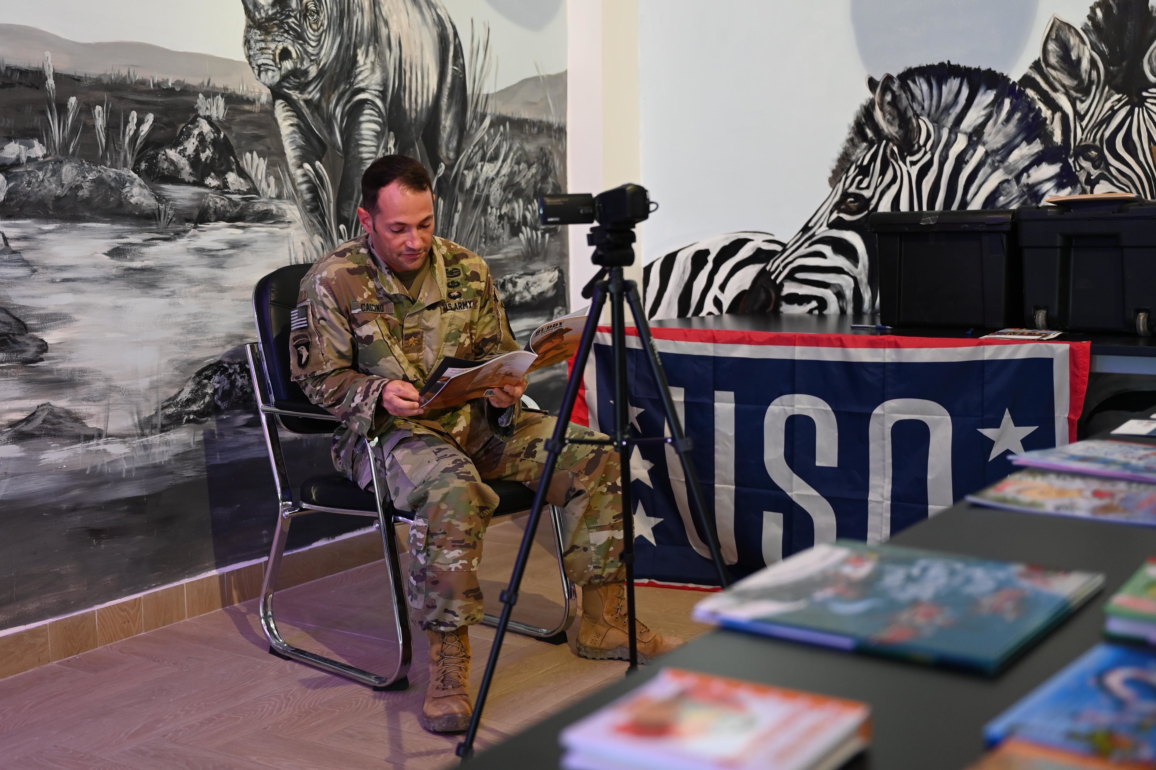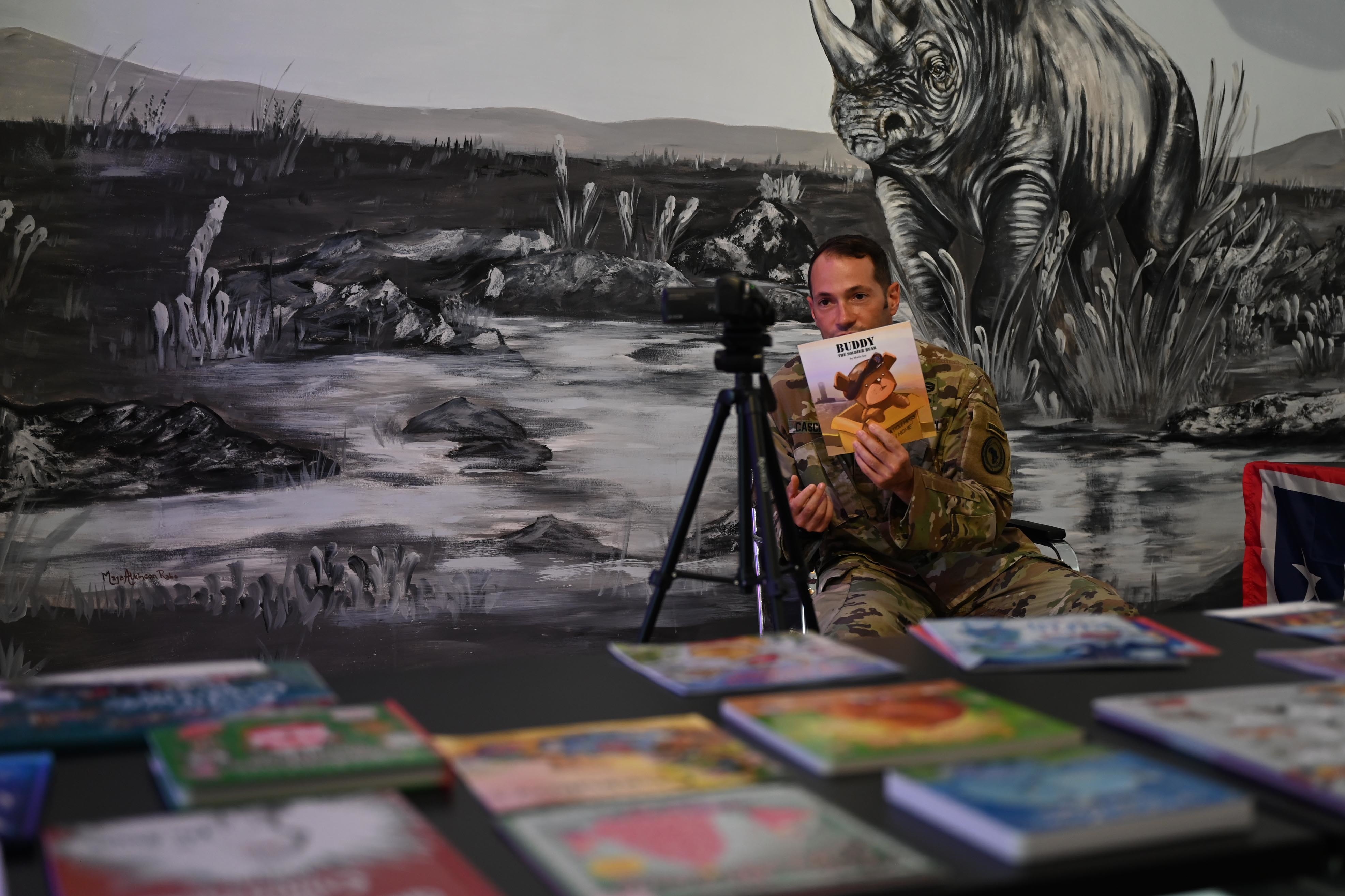 U.S. Army Maj. Louis Cascion, office of security cooperation director, Combined Joint Task Force – Horn of Africa (CJTF-HOA) reads a book to his children utilizing the Bob Hope Legacy Reading program during a USO event in at Africa, Nov. 11, 2020. The USO is a nonprofit organization that has supported U.S. service members and their families for nearly 80 years. (U.S. Air Force photo by Tech. Sgt. Dana J. Cable)