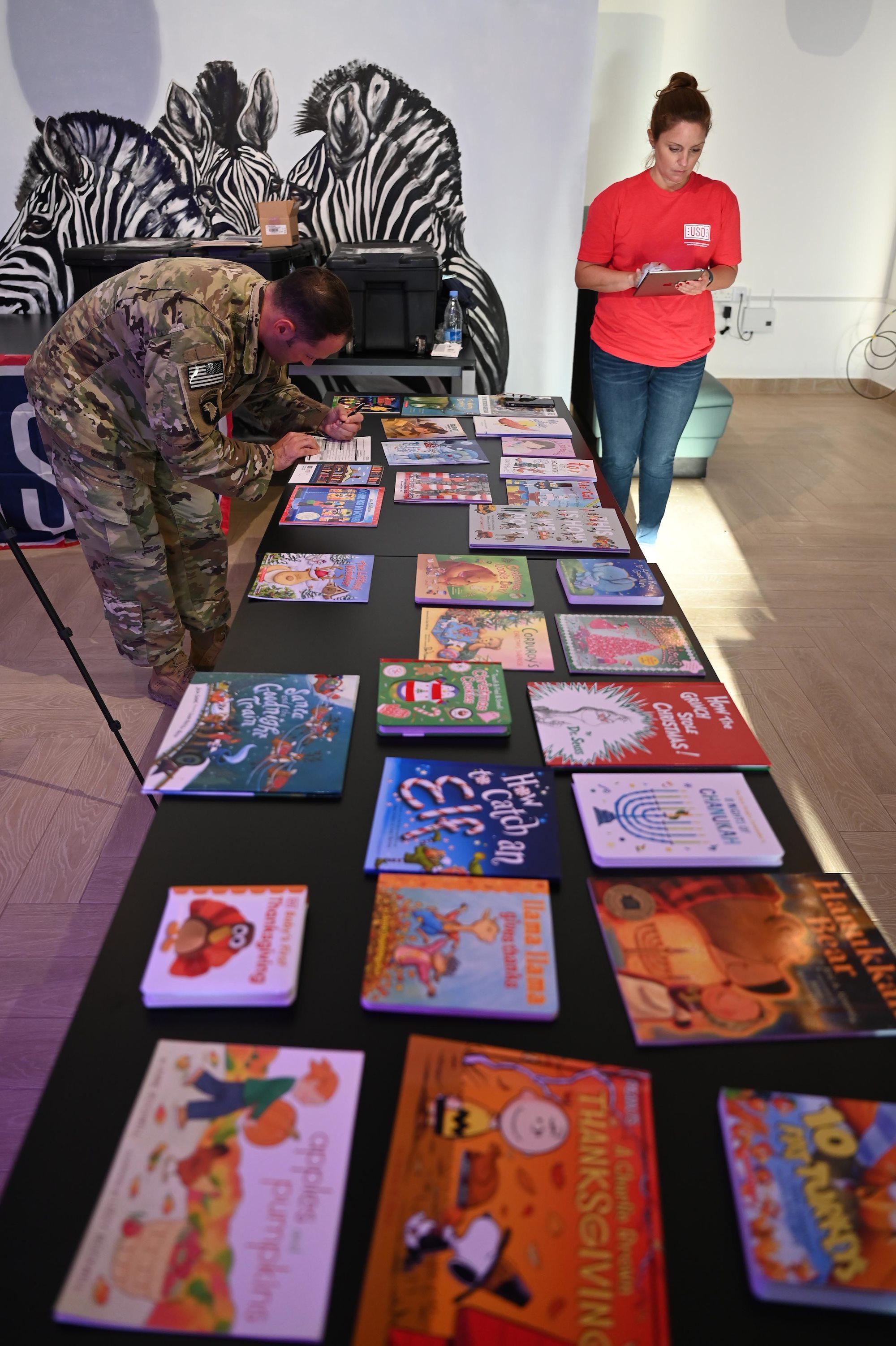 U.S. Army Maj. Louis Cascion, office of security cooperation director, Combined Joint Task Force – Horn of Africa (CJTF-HOA) writes a note to his children after recording himself reading a book to his children during a USO event in at Africa, Nov. 11, 2020. The USO is a nonprofit organization that has supported U.S. service members and their families for nearly 80 years. (U.S. Air Force photo by Tech. Sgt. Dana J. Cable)