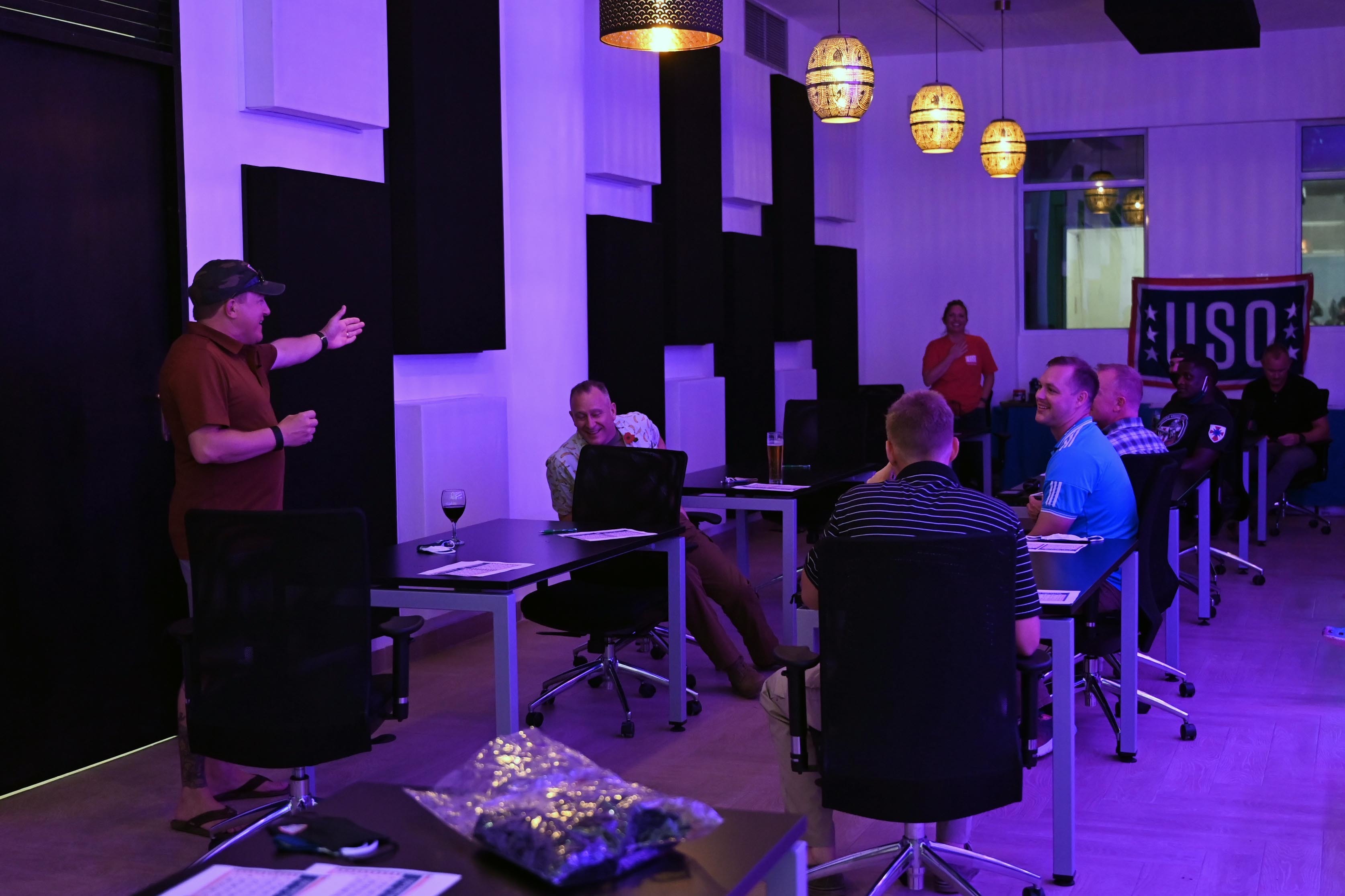 U.S. Navy Command Master Chief Alex Hebert, senior enlisted leader, Combined Joint Task Force – Horn of Africa and Holly Coffer, USO Camp Lemonnier manager, speak to service members during a USO event in East Africa, Nov. 11, 2020. The USO is a nonprofit organization that has supported U.S. service members and their families for nearly 80 years. (U.S. Air Force photo by Tech. Sgt. Dana J. Cable)
