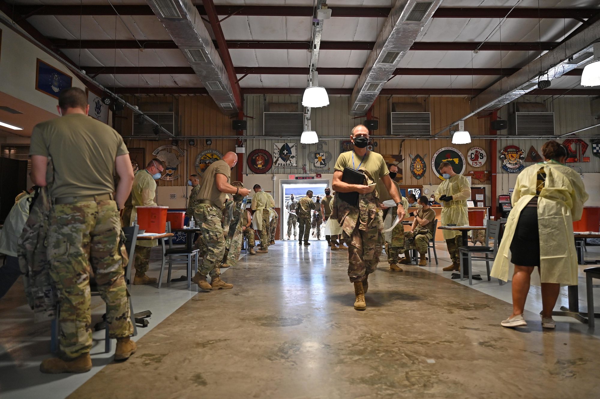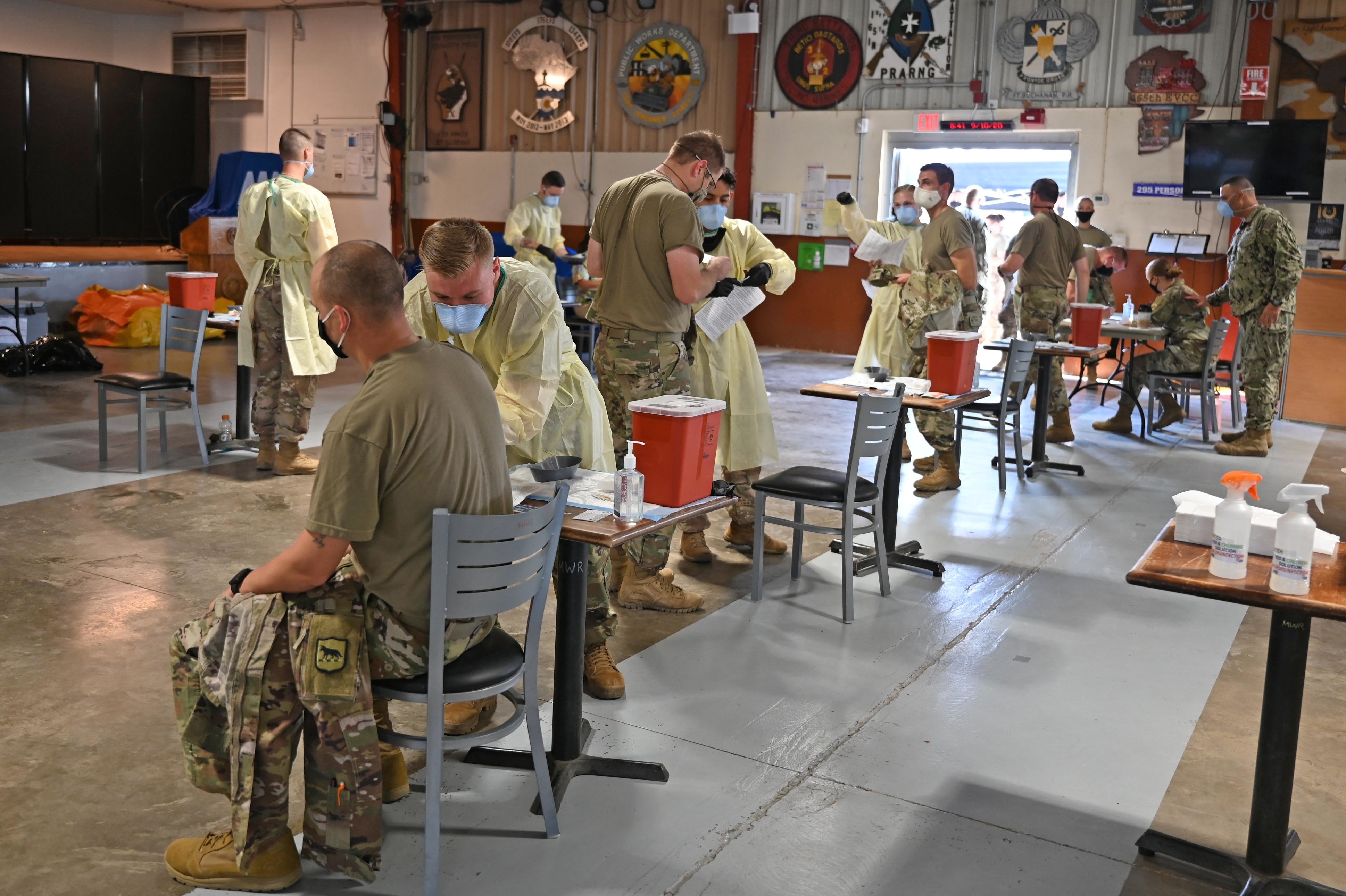 U.S. Army Soldiers receive their flu shots while in-processing at Camp Lemonnier, Djibouti, Oct. 9, 2020. Nearly 200 Soldiers from the 196th Maneuver Enhancement Brigade (MEB), of Sioux Falls, South Dakota Army National Guard became the new headquarters staff after arriving at Combined Joint Task Force – Horn of Africa (CJTF-HOA), Sept. 25, 2020. (U.S. Air Force photo by Staff Sgt. Dana J. Cable)