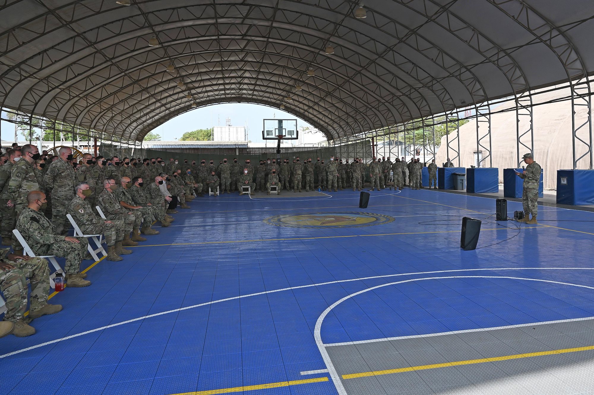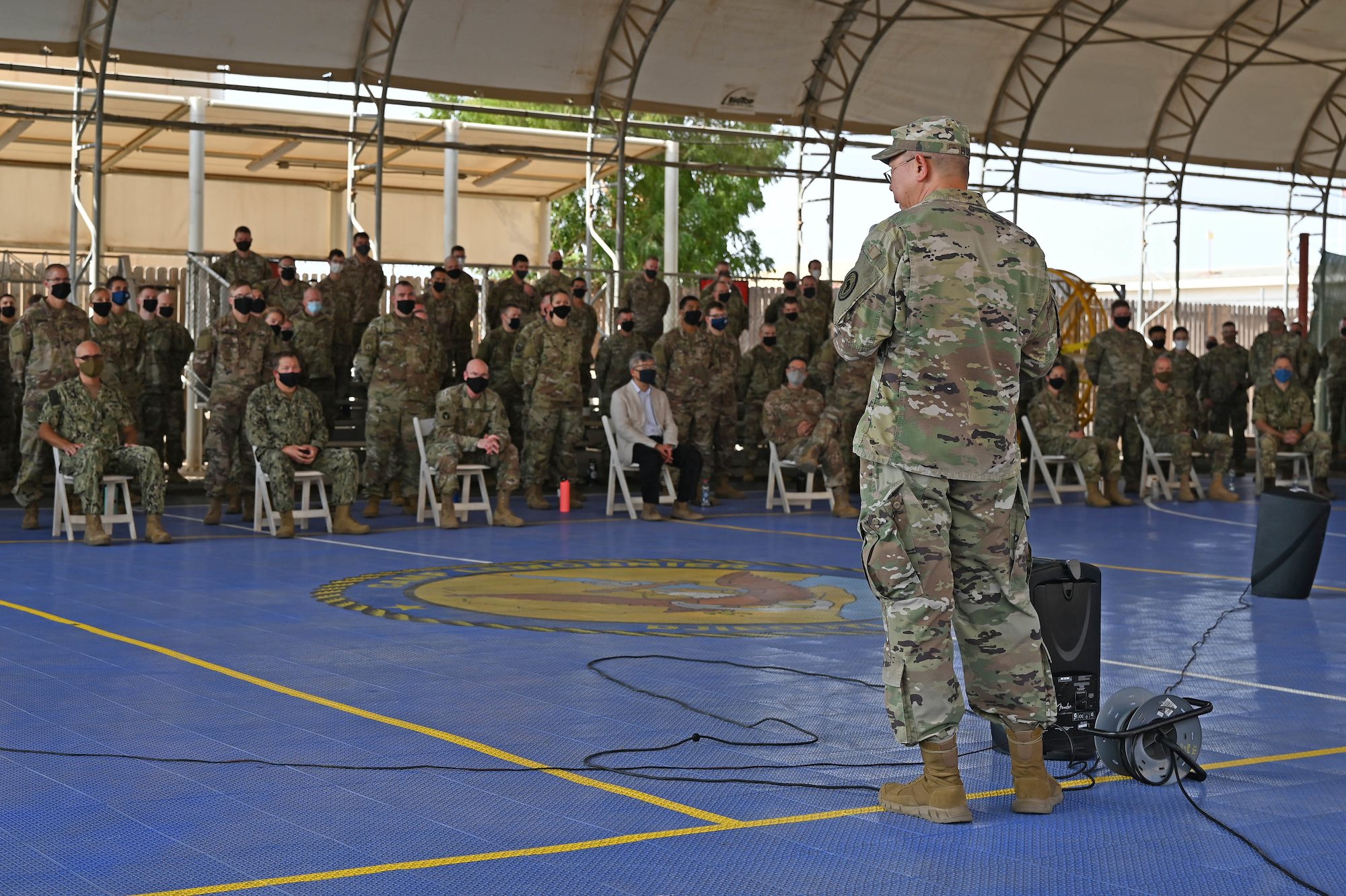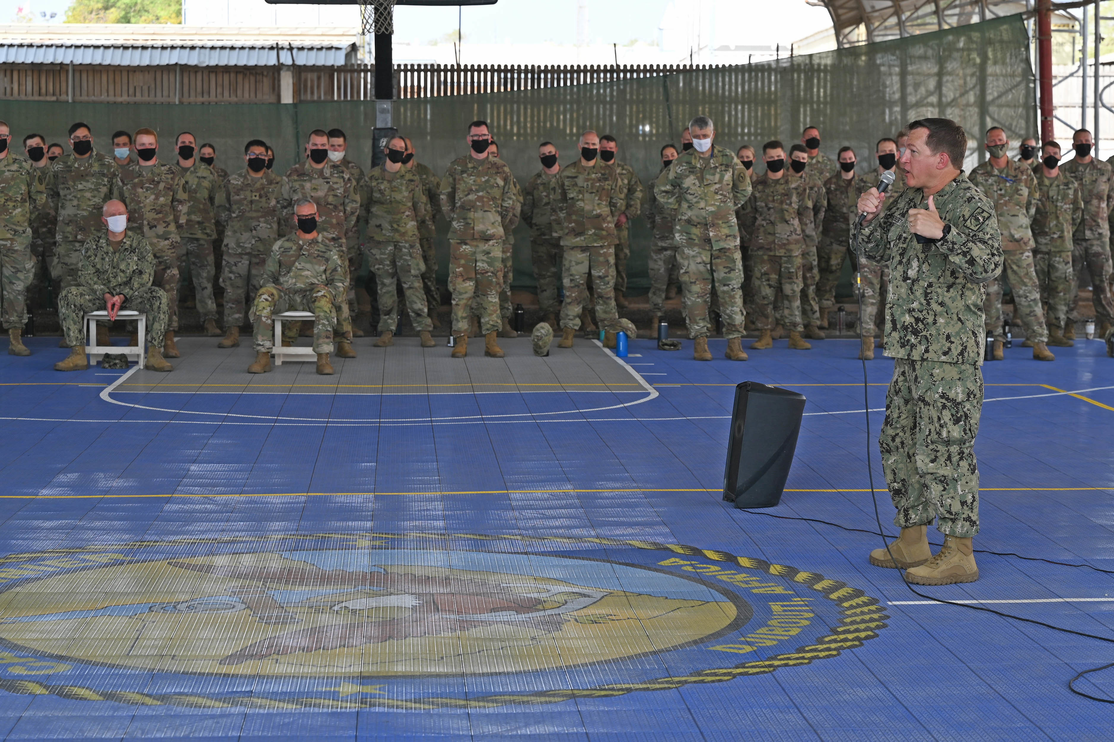 U.S. Navy Command Master Chief Petty Officer Alex Hebert, command senior enlisted leader, Combined Joint Task Force-Horn of Africa (CJTF-HOA), addresses the new HOA staff at Camp Lemonnier, Djibouti, Oct. 10, 2020. Nearly 200 Soldiers from the 196th Maneuver Enhancement Brigade (MEB), of Sioux Falls, South Dakota Army National Guard became the new headquarters staff after arriving at Combined Joint Task Force – Horn of Africa (CJTF-HOA), Sept. 25, 2020. (U.S. Air Force photo by Staff Sgt. Dana J. Cable)