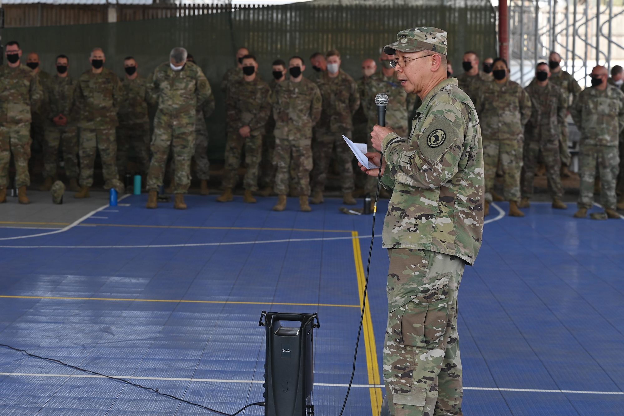 U.S. Army Maj. Gen. Lapthe C. Flora, commanding general, Combined Joint Task Force-Horn of Africa (CJTF-HOA), addresses the new HOA staff at Camp Lemonnier, Djibouti, Oct. 10, 2020. Nearly 200 Soldiers from the 196th Maneuver Enhancement Brigade (MEB), of Sioux Falls, South Dakota Army National Guard became the new headquarters staff after arriving at Combined Joint Task Force – Horn of Africa (CJTF-HOA), Sept. 25, 2020. (U.S. Air Force photo by Staff Sgt. Dana J. Cable)