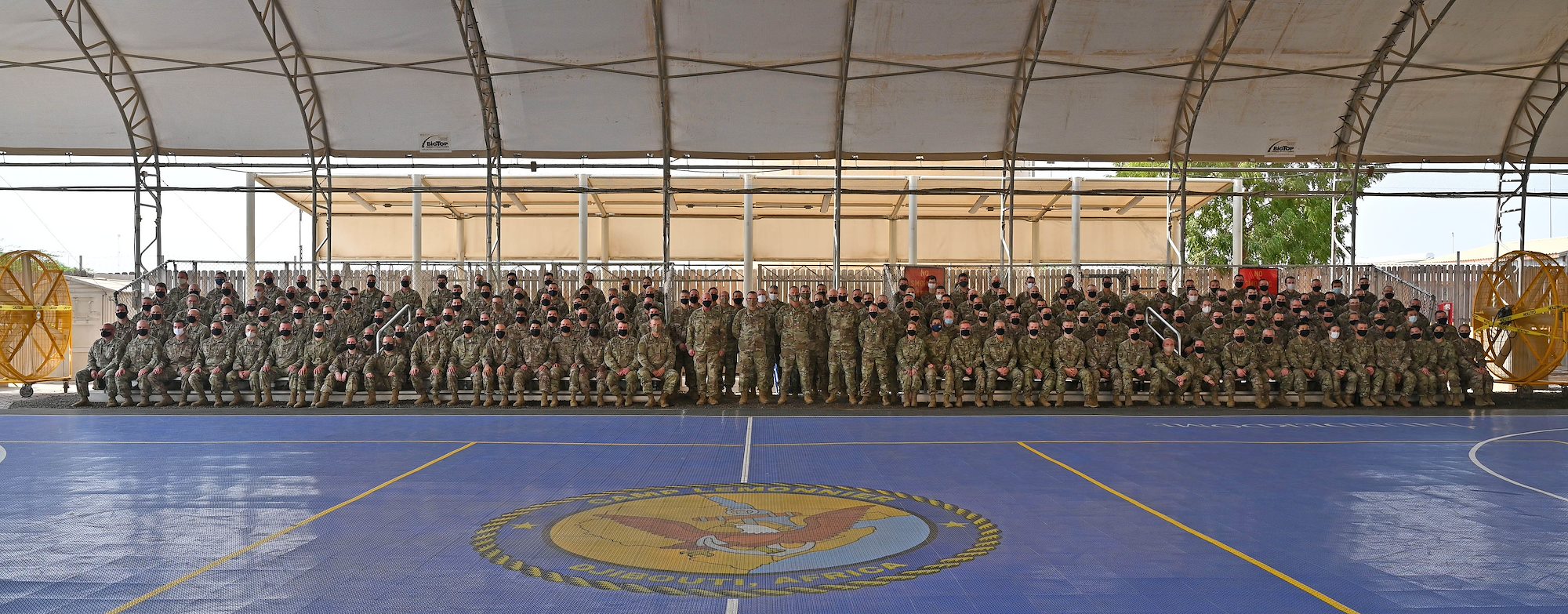 The new Combined Joint Task Force –Horn of Africa staff at Camp Lemonnier, Djibouti, Oct. 10, 2020. Nearly 200 Soldiers from the 196th Maneuver Enhancement Brigade (MEB), of Sioux Falls, South Dakota Army National Guard became the new headquarters staff after arriving at Combined Joint Task Force – Horn of Africa (CJTF-HOA), Sept. 25, 2020. (U.S. Air Force photo by Staff Sgt. Dana J. Cable)