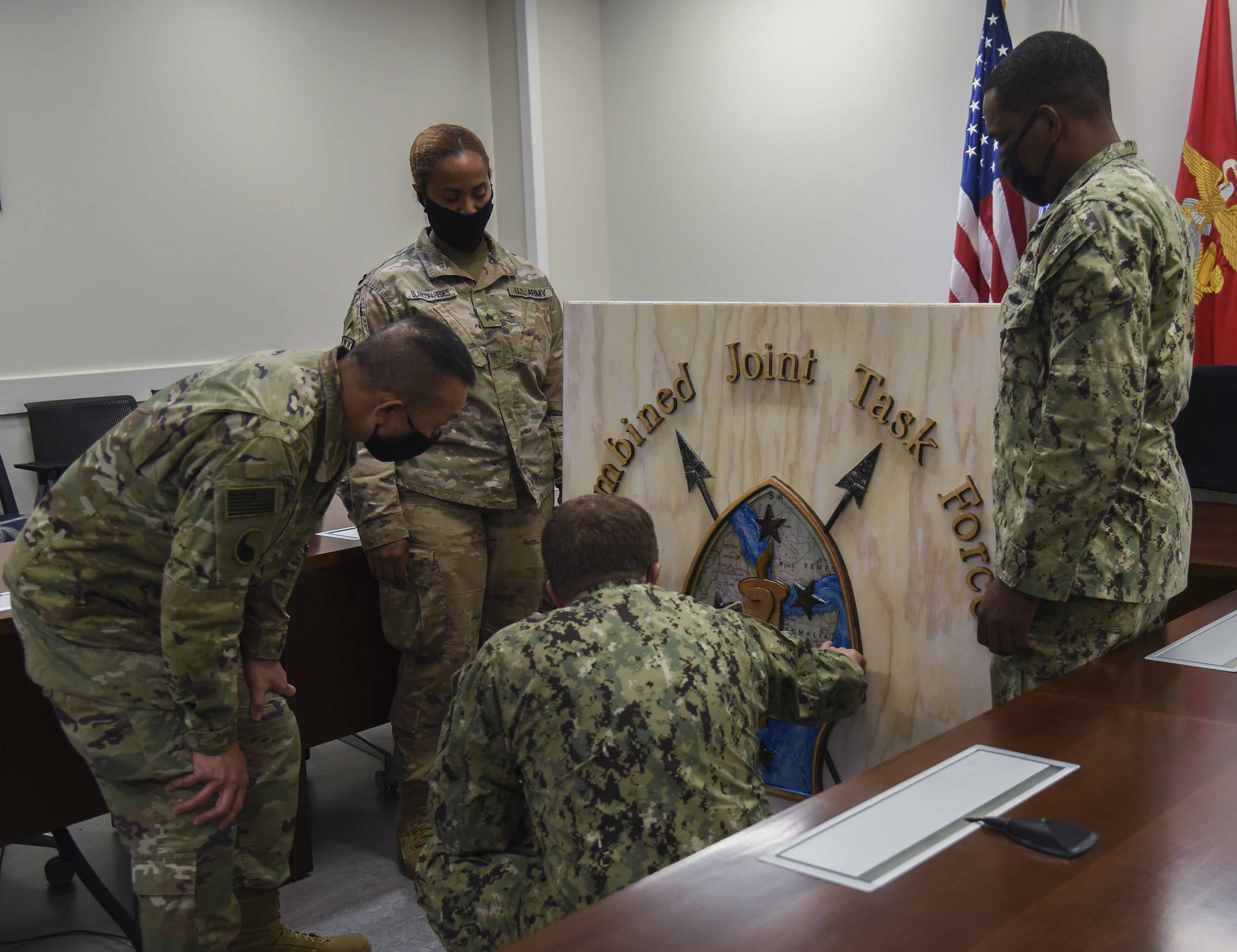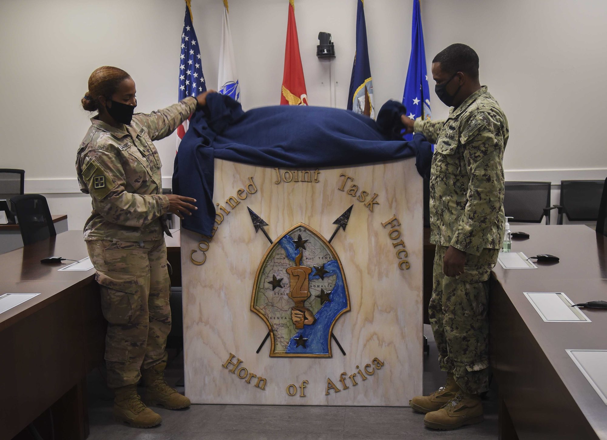 U.S. Army Sgt. Joyce Blanco Parades, heavy equipment operator, 760th Engineer Vertical Construction Company, and U.S. Navy Petty Officer 2nd Class Jody Sambury, self-help leading petty officer, Public Works Department, unveil a plaque with the Combined Joint Task Force – Horn of Africa logo at the CJTF-HOA headquarters building, Oct. 13, 2020, Camp Lemonnier, Djibouti. The plaque was commissioned by the outgoing and incoming senior enlisted leaders for CJTF-HOA and will be displayed on the wall in the commander’s conference room. (U.S. Air Force Photo by Senior Airman Kristin Savage)