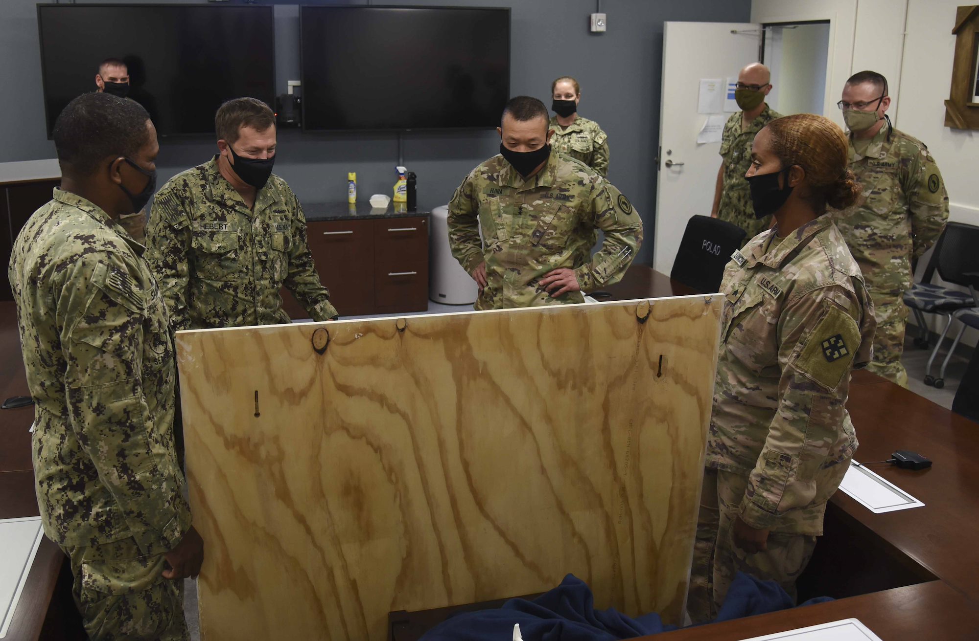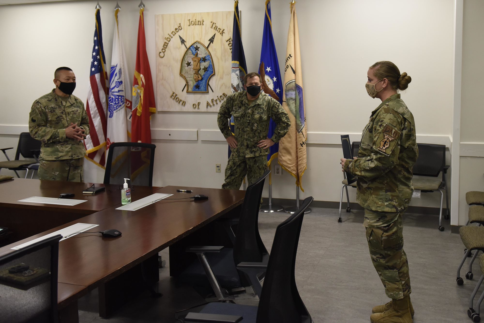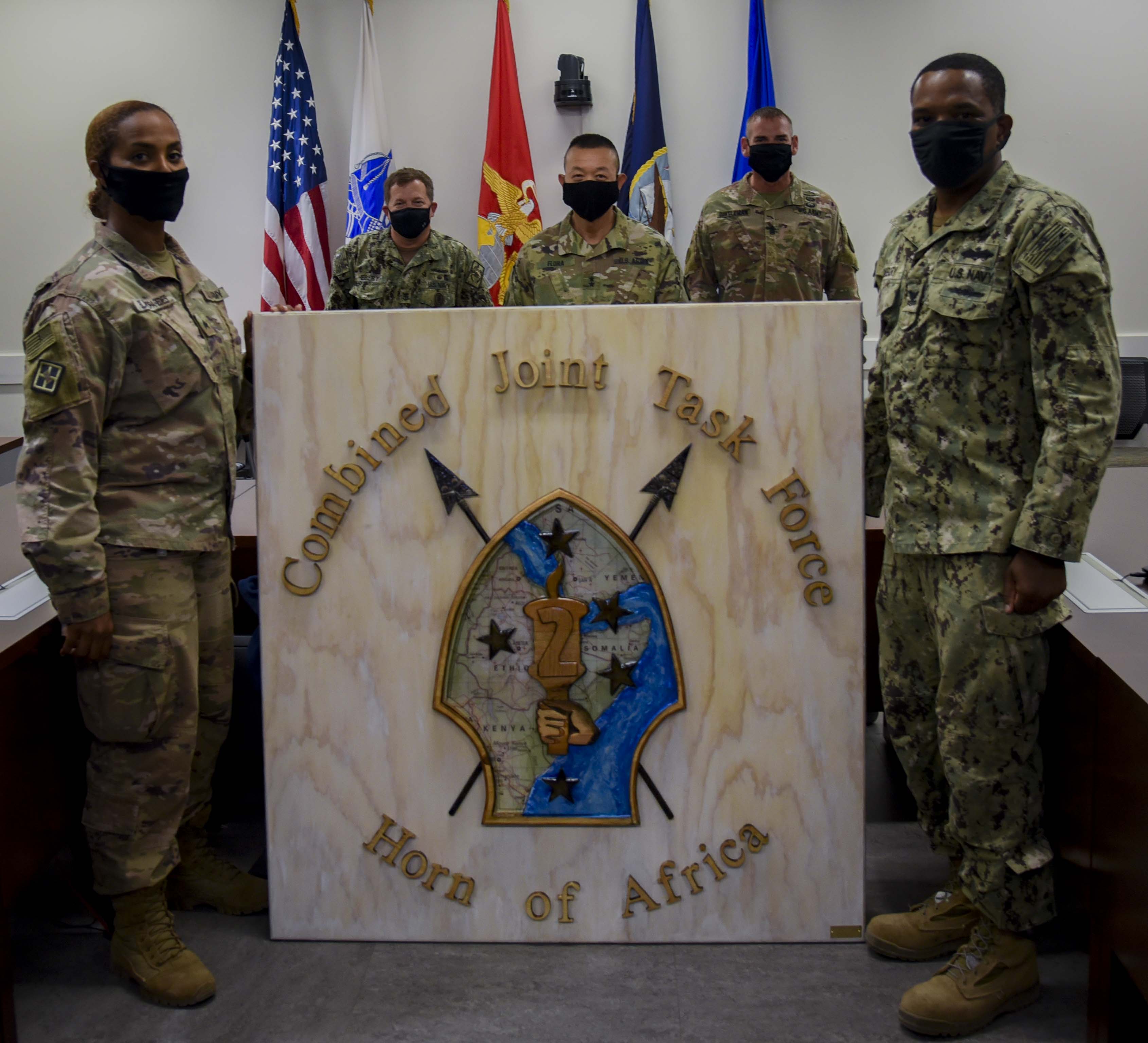 U.S. Army Maj. Gen. Lapthe C. Flora, commanding general, Combined Joint Task Force – Horn of Africa (CJTF-HOA), and Command Master Chief Petty Officer Alex Hebert, senior enlisted leader, CJTF-HOA, admire a new plaque for the commander’s conference after its unveiling at the CJTF-HOA headquarters building, Oct. 13, 2020, at Camp Lemonnier, Djibouti. The incoming and outgoing senior enlisted leaders kept the plaque’s creation a secret so they could surprise Flora during the unveiling. (U.S. Air Force Photo by Senior Airman Kristin Savage)