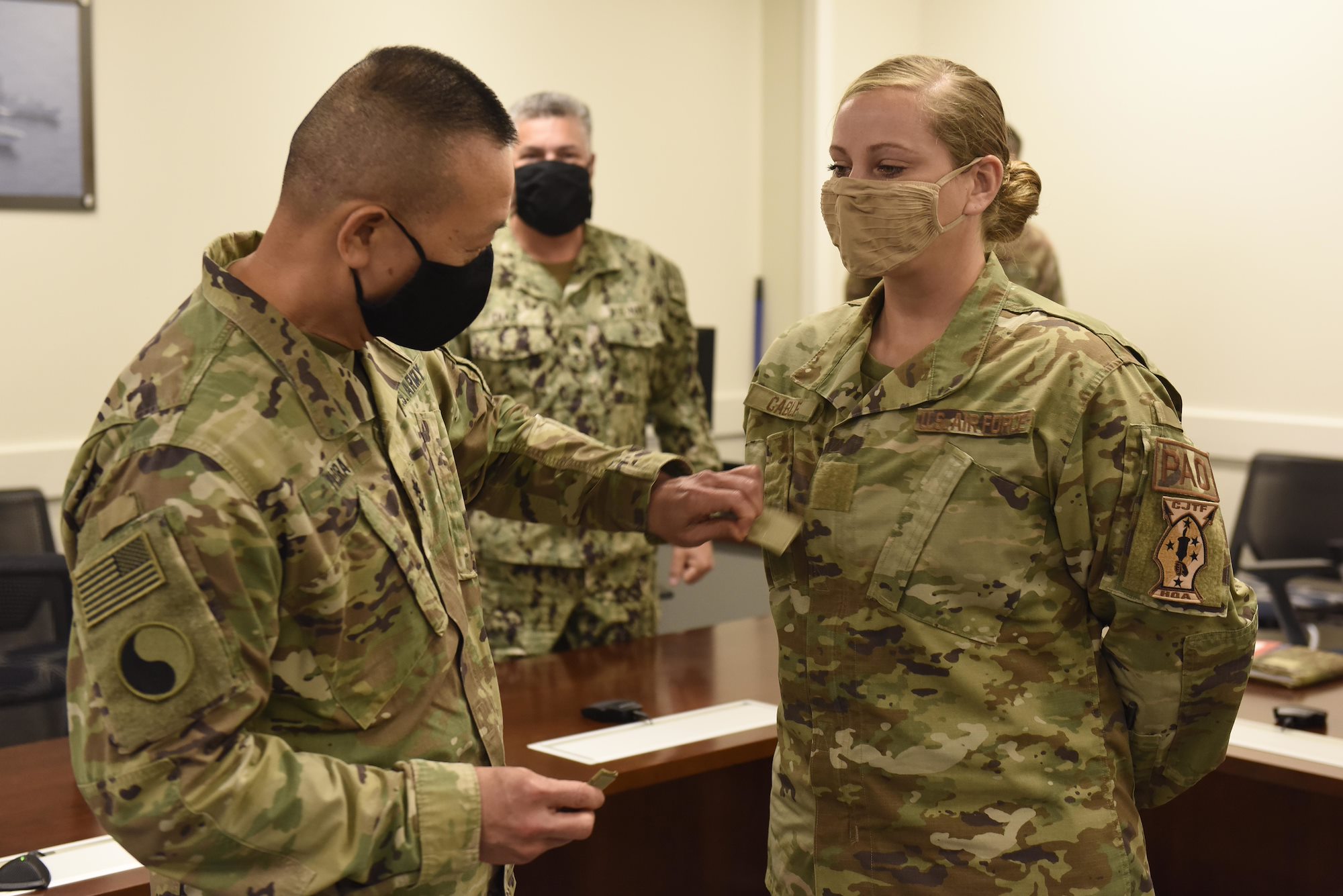 U.S. Army Maj. Gen. Lapthe C. Flora, commanding general, Combined Joint Task Force – Horn of Africa, removes the staff sergeant stripes from now U.S. Air Force Tech. Sgt. Dana Cable, public affairs production chief, CJTF-HOA, during a surprise Stripes for Exceptional Performers promotion notification at CJTF-HOA headquarters, Oct. 22, 2020. The STEP program allots only 180 stripes Air Force-wide, per year, and allows commanders to promote Airmen to the ranks of staff and technical sergeant, without a test or a board. (U.S. Air Force photo by Master Sgt. Mike Andriacco)