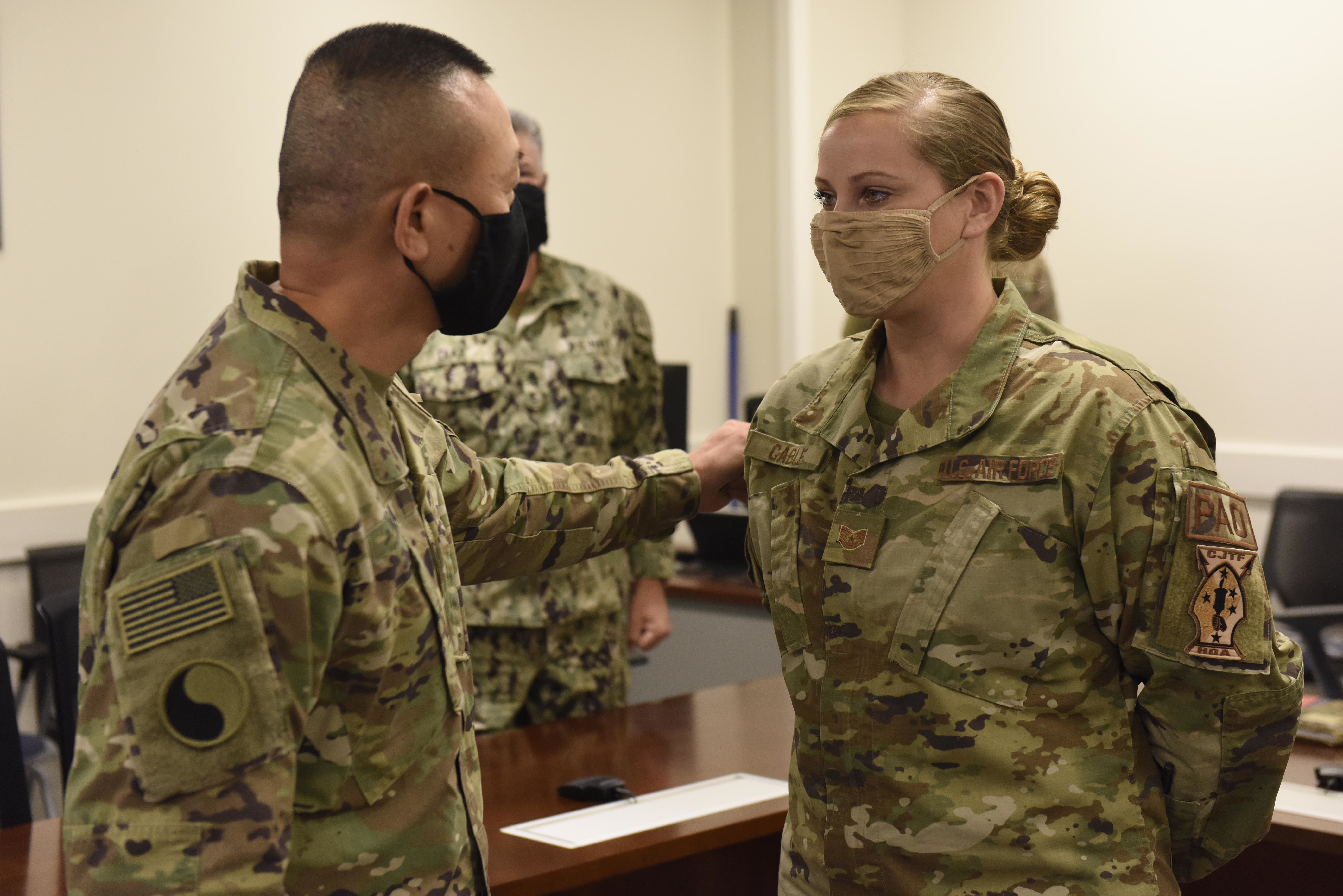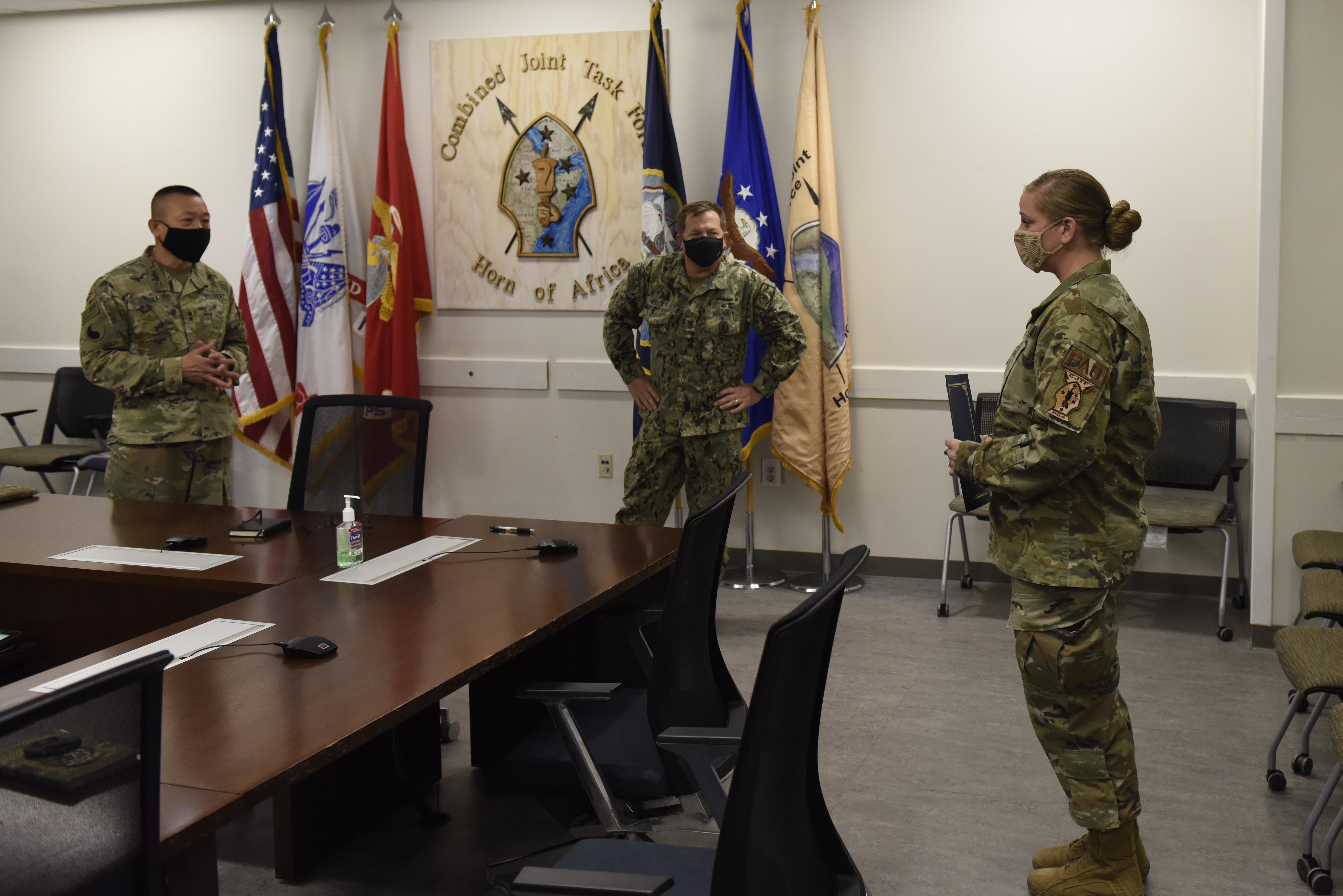 U.S. Army Maj. Gen. Lapthe C. Flora, commanding general, Combined Joint Task Force – Horn of Africa, and U.S. Navy Command Master Chief Petty Officer Alex Hebert, command senior enlisted leader, CJTF-HOA, congratulate U.S. Air Force Tech. Sgt. Dana Cable, public affairs production chief, CJTF-HOA, on her promotion during a surprise Stripes for Exceptional Performers promotion notification at CJTF-HOA headquarters, Oct. 22, 2020. The STEP program allots only 180 stripes Air Force-wide, per year, and allows commanders to promote Airmen to the ranks of staff and technical sergeant, without a test or a board. (U.S. Air Force photo by Master Sgt. Mike Andriacco)