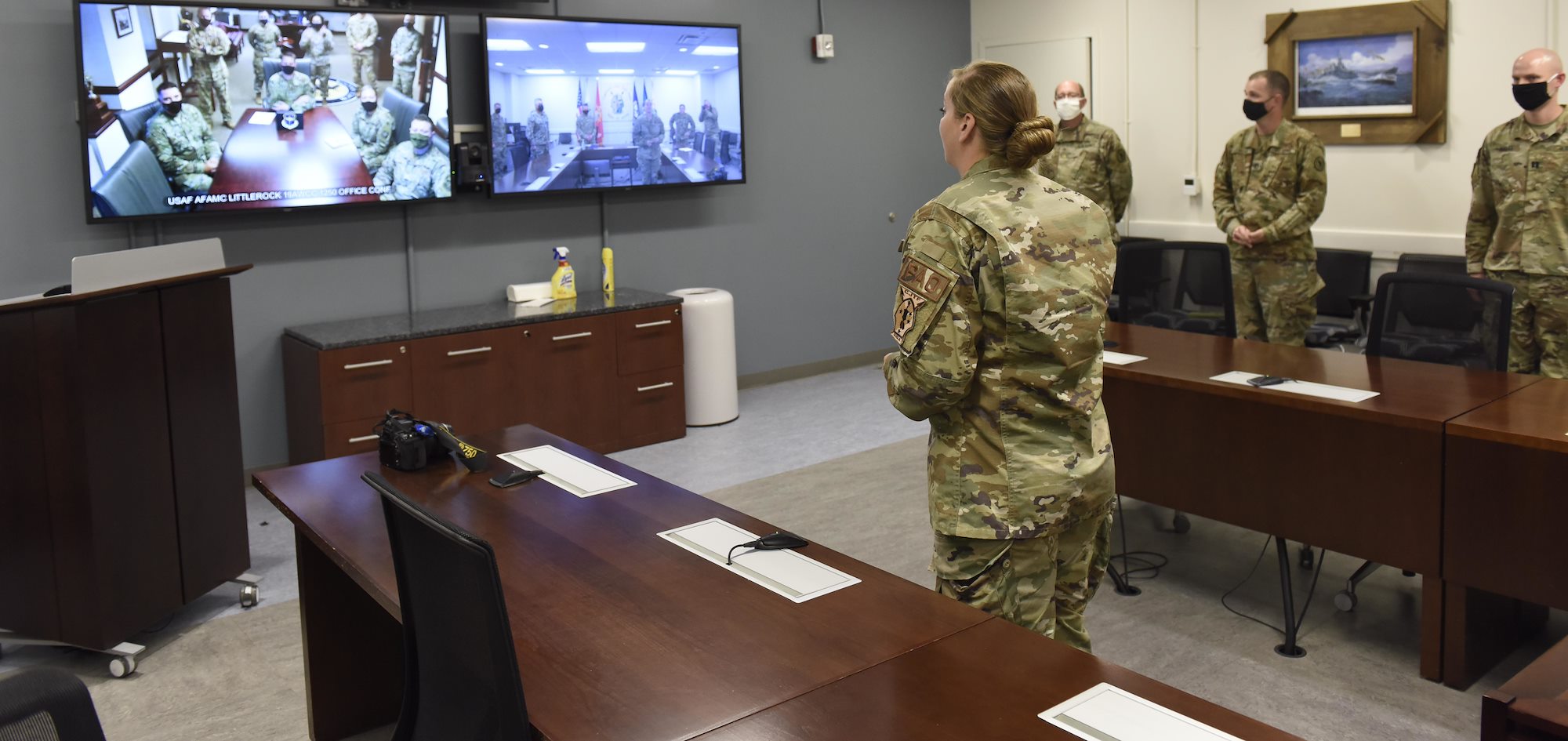 U.S. Air Force Tech. Sgt. Dana Cable, public affairs production chief, Combined Joint Task Force – Horn of Africa, thanks 19th Airlift Wing and Team Little Rock leadership during a surprise Stripes for Exceptional Performers promotion notification at the CJTF-HOA headquarters, Oct. 22, 2020. The STEP program allots only 180 stripes Air Force-wide, per year, and allows commanders to promote Airmen to the ranks of staff and technical sergeant, without a test or a board. (U.S. Air Force photo by Master Sgt. Mike Andriacco)