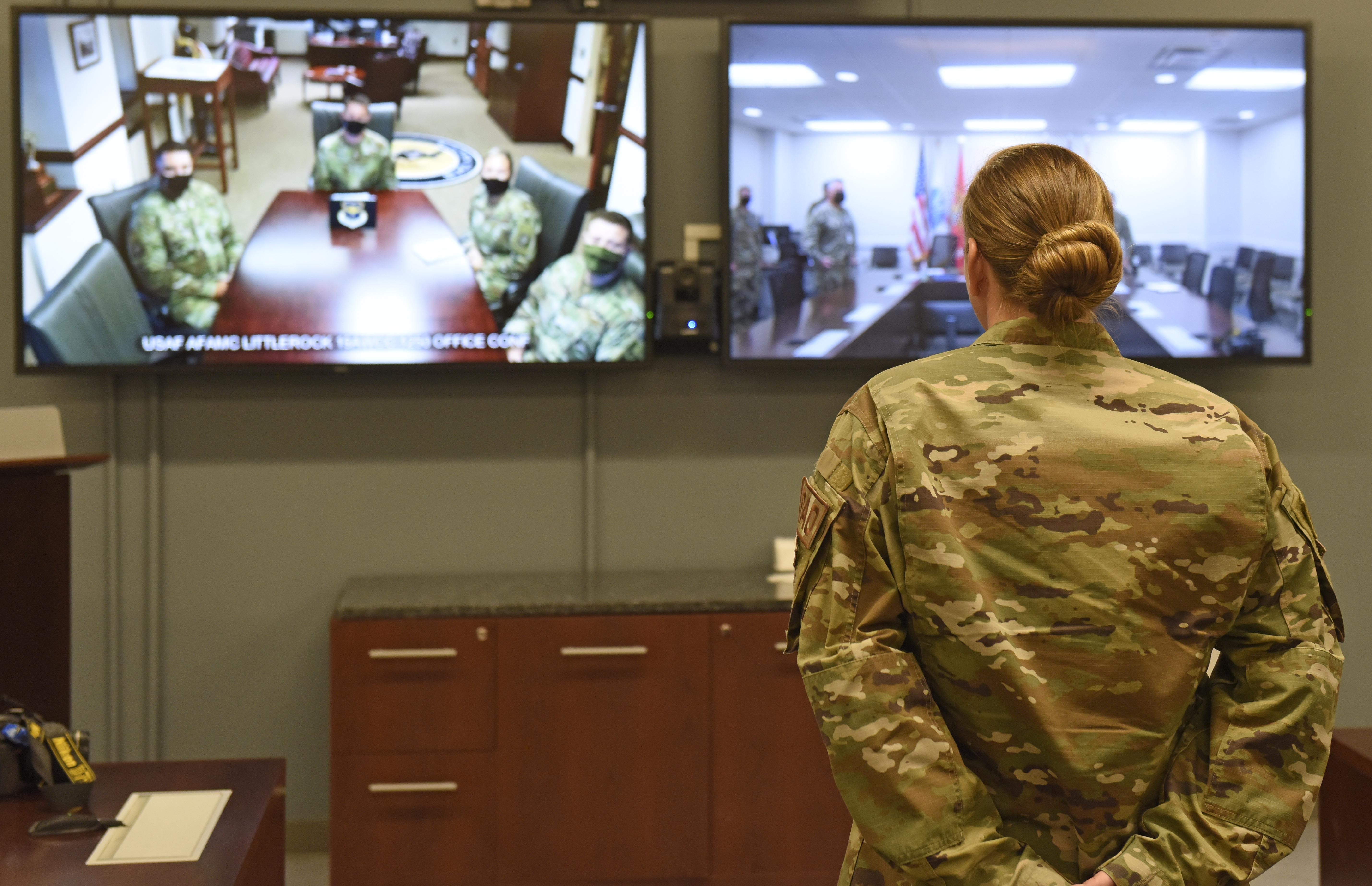 U.S. Air Force Staff. Sgt. Dana Cable, public affairs production chief, Combined Joint Task Force – Horn of Africa, stands before U.S. Col. John Schutte, 19th Airlift Wing commander as he notifies Cable of her promotion to technical sergeant under the Stripes for Exceptional Performers program during a video teleconference at CJTF-HOA headquarters, Oct. 22, 2020. The STEP program allots only 180 stripes Air Force-wide, per year, and allows commanders to promote Airmen to the ranks of staff and technical sergeant, without a test or a board. (U.S. Air Force photo by Master Sgt. Mike Andriacco)