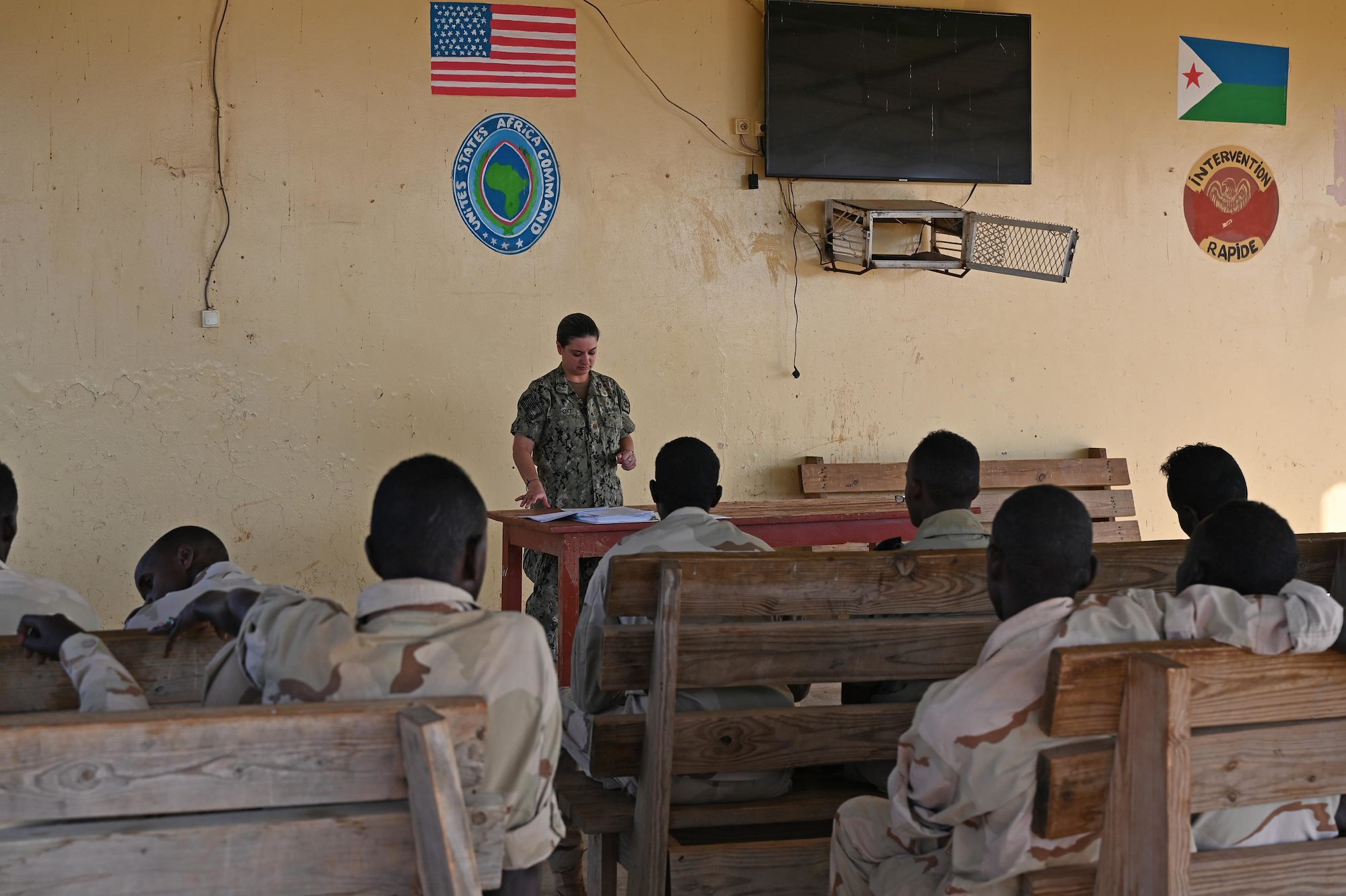 U.S. Navy Lt. Cmdr. Alison Hoyt, chief of operational law, Combined Joint Task Force - Horn of Africa (CJTF-HOA), briefs Soldiers from the Armed Forces of Djibouti (FAD) Bataillon d'intervention rapide (BIR), on Rules of Engagement and Law of War Issues at the BIR base, Oct. 21, 2020. The BIR is a FAD advanced infantry battalion, trained and equipped by CJTF-HOA. Its primary mission is to train and serve as a quick reaction force to accomplish specified tasks directed by its higher command in the Djiboutian army. (U.S. Air Force photo by Tech. Sgt. Dana J. Cable)