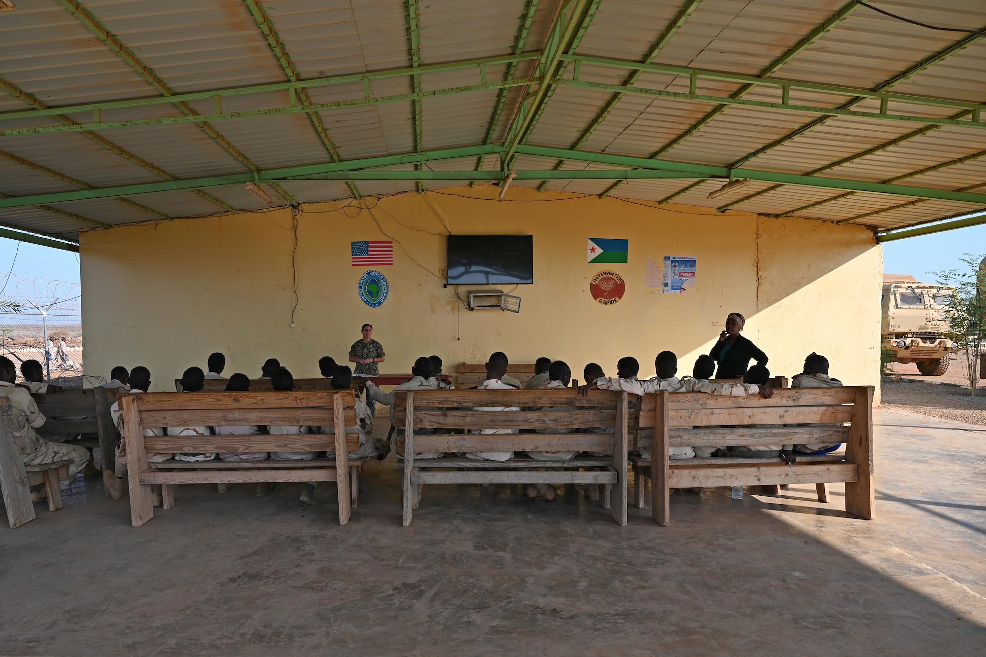 U.S. Navy Lt. Cmdr. Alison Hoyt, chief of operational law, Combined Joint Task Force - Horn of Africa (CJTF-HOA), briefs Soldiers from the Armed Forces of Djibouti (FAD) Bataillon d'intervention rapide (BIR), on Rules of Engagement and Law of War Issues at the BIR base, Oct. 21, 2020. Djiboutian soldiers assigned to the BIR are trained in light infantry tactics, mission planning, weapons training, first aid, land navigation, communication exercises, and additional advanced instruction by U.S. Army soldiers assigned to CJTF-HOA. (U.S. Air Force photo by Tech. Sgt. Dana J. Cable)