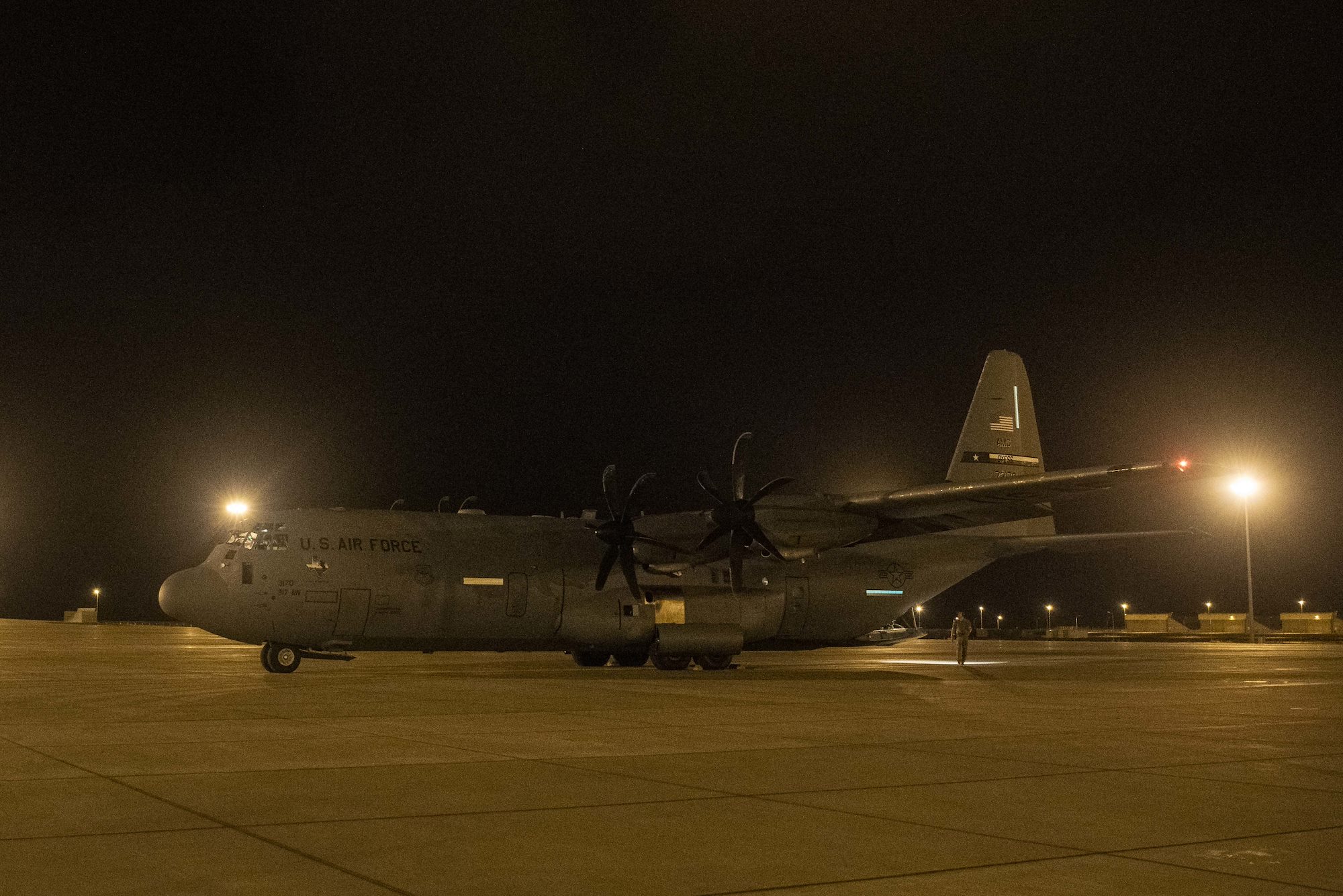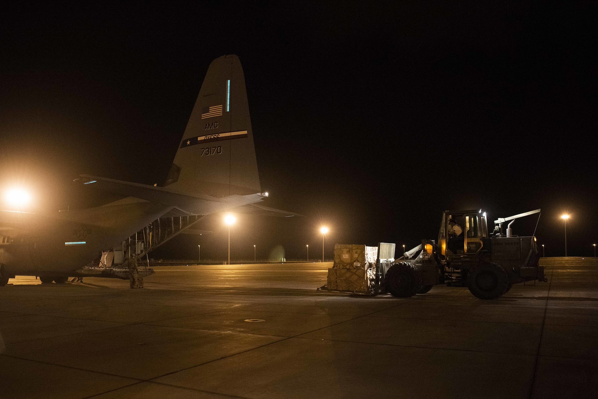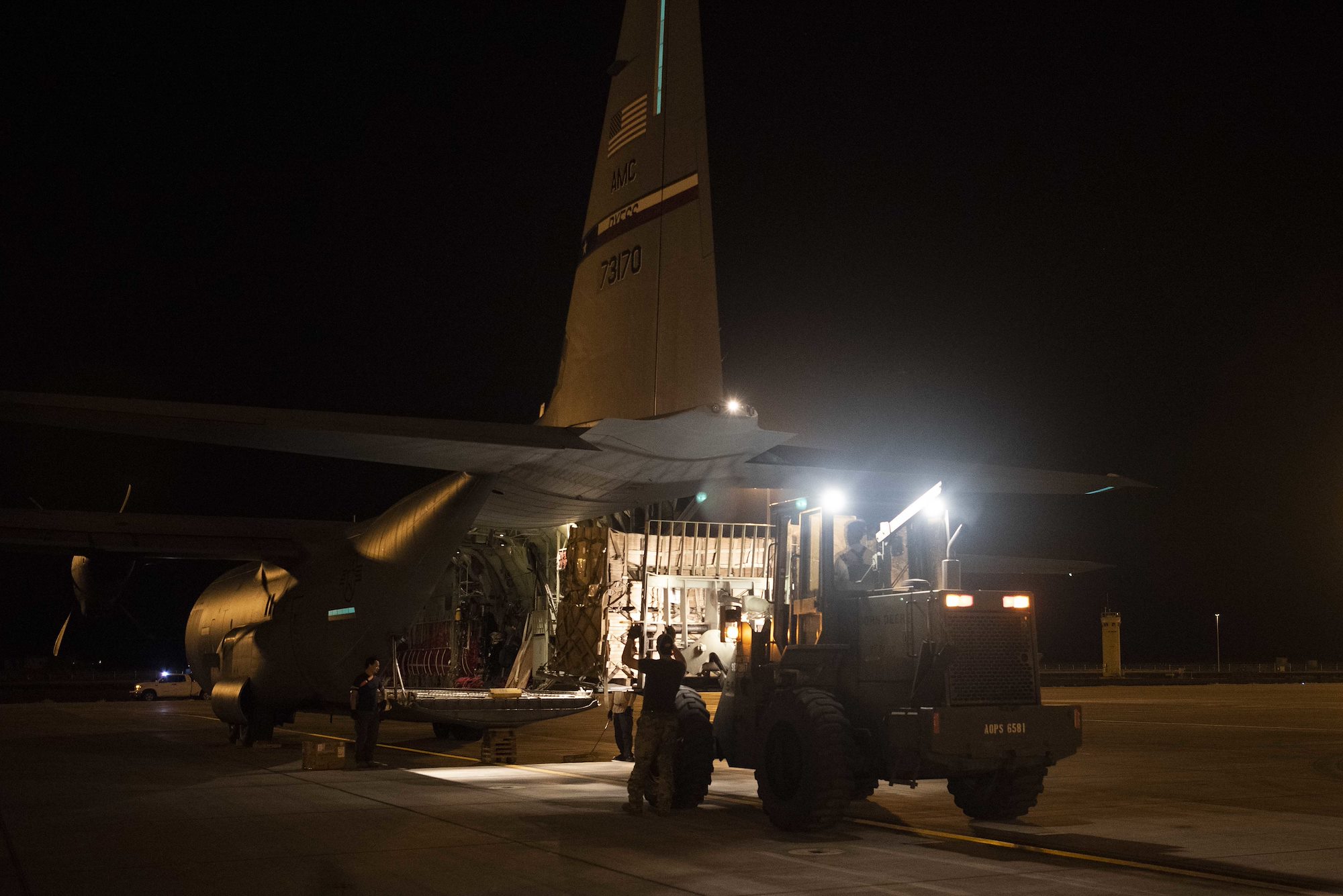A C-130J Super Hercules transports cargo loaded by U.S. Air Force Airmen assigned to the 75th Expeditionary Airlift Squadron (EAS), in Djibouti, Apr. 27, 2020. The 75th EAS provides strategic airlift capabilities across the Combined Joint Task Force-Horn of Africa area of responsibility and is responsible for moving many of the medical supplies pushed to outstations as part of the COVID-19 pandemic response. (U.S. Air Force photo by Tech. Sgt. Ashley Nicole Taylor)