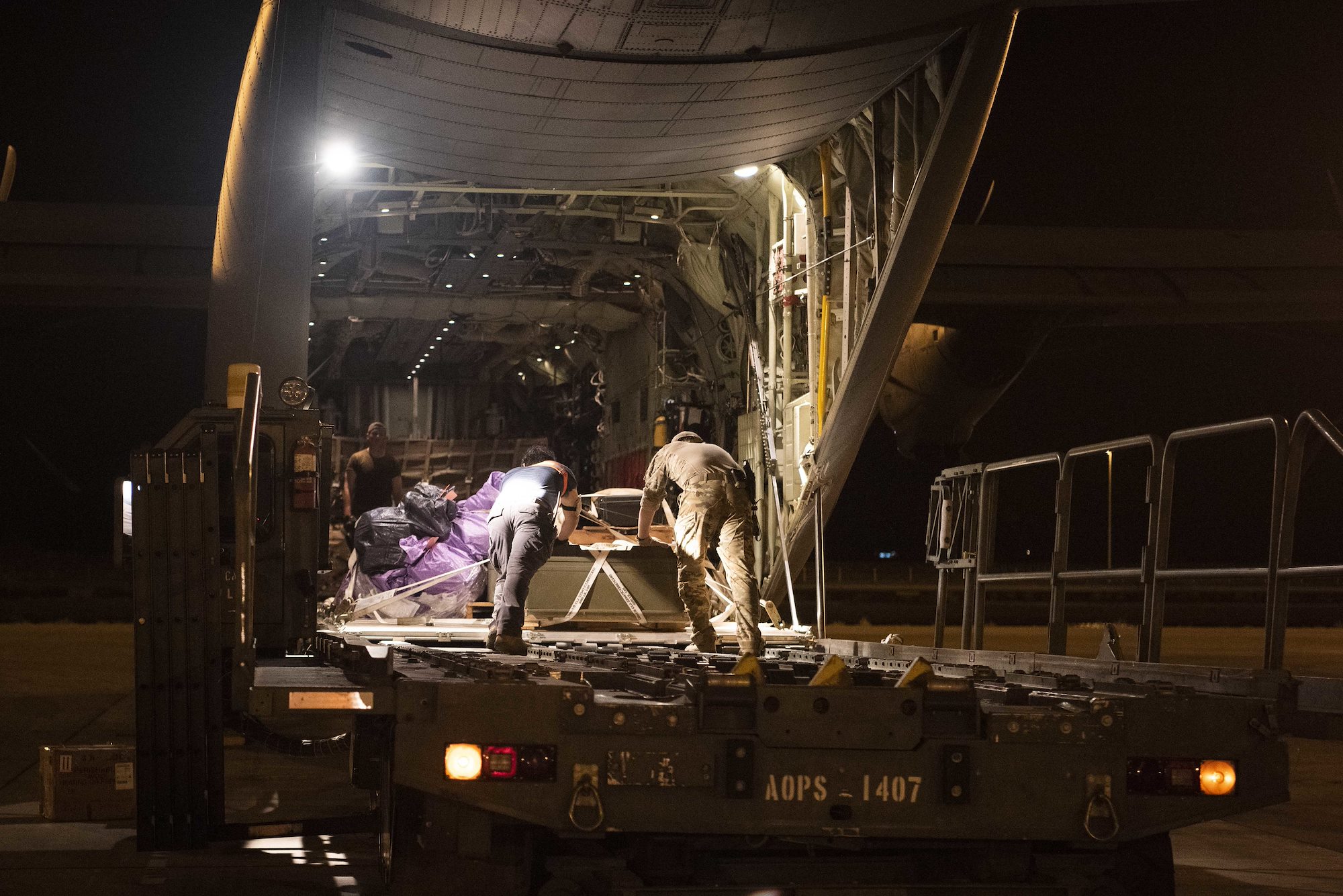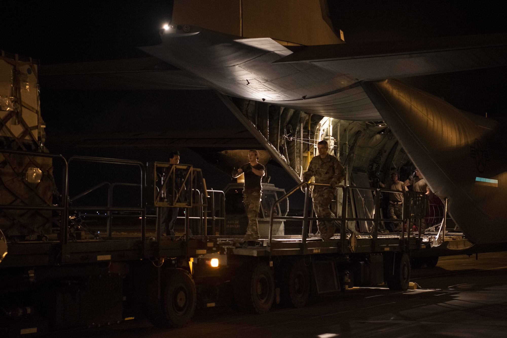 U.S. Air Force Airmen assigned to the 75th Expeditionary Airlift Squadron (EAS), load a C-130J Super Hercules with cargo in Djibouti, Apr. 27, 2020. The 75th EAS provides strategic airlift capabilities across the Combined Joint Task Force-Horn of Africa (CJTF-HOA) area of responsibility and is responsible for moving many of the medical supplies pushed to outstations as part of the COVID-19 pandemic response. (U.S. Air Force photo by Tech. Sgt. Ashley Nicole Taylor)