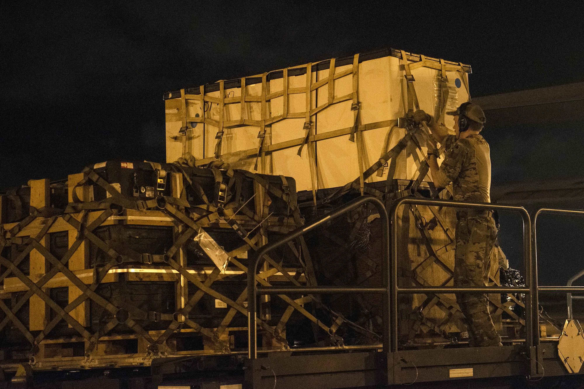 A U.S. Air Force Airman assigned to the 75th Expeditionary Airlift Squadron (EAS), loads a C-130J Super Hercules with cargo in Djibouti, Apr. 27, 2020. The 75th EAS provides strategic airlift capabilities across the Combined Joint Task Force-Horn of Africa (CJTF-HOA) area of responsibility and is responsible for moving many of the medical supplies pushed to outstations as part of the COVID-19 pandemic response. (U.S. Air Force photo by Tech. Sgt. Ashley Nicole Taylor)