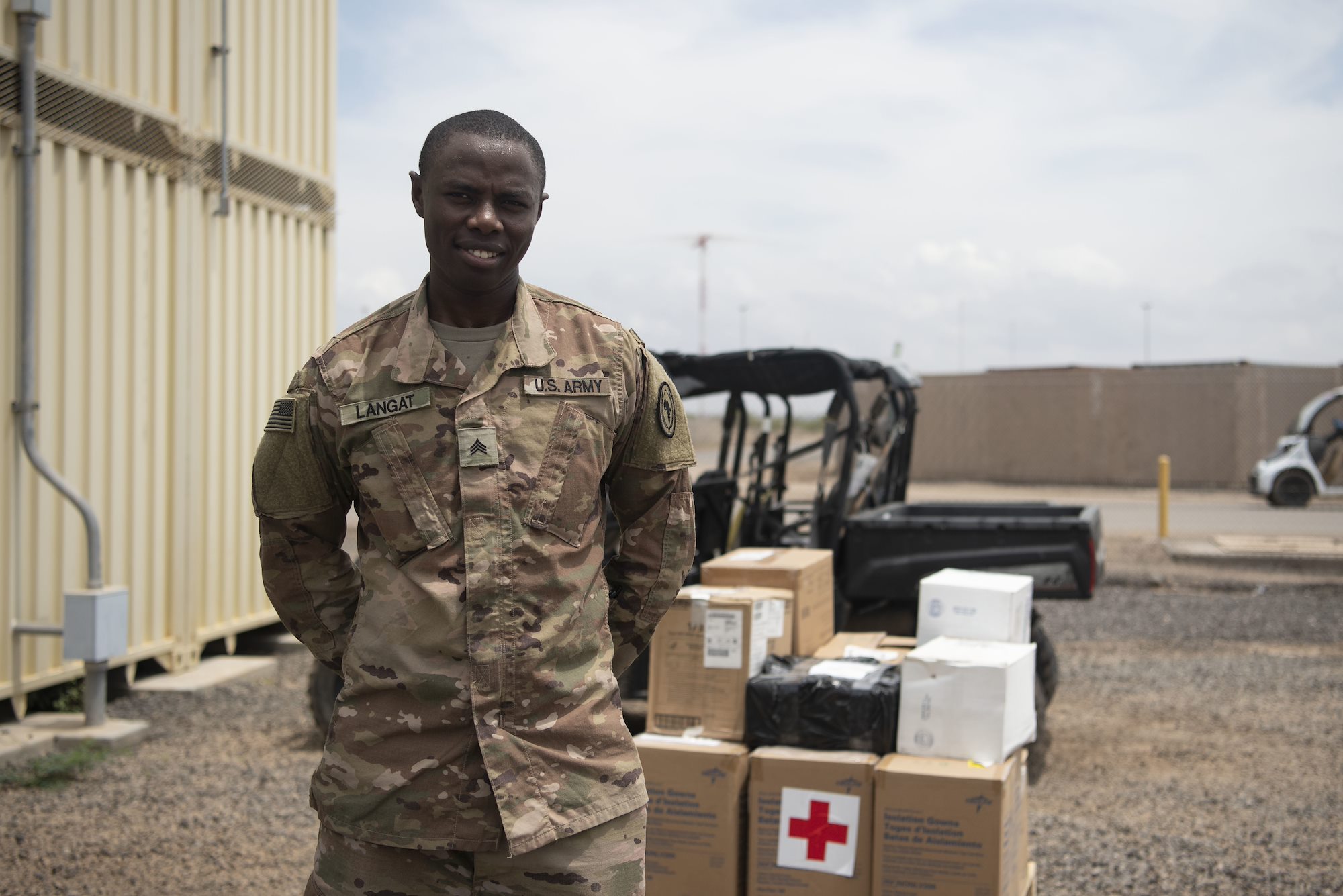U.S. Army Sgt. Enock Langat, medical logistics noncommissioned officer for Combined Joint Task Force-Horn of Africa (CJTF-HOA), stands in front of medical supplies at Camp Lemonnier, Djibouti, Apr. 24, 2020. Since the inception of the COVID-19 outbreak, the MEDLOG team has shipped more than 7,000 surgical masks (facemasks), including 5,000 N95 respirators; 2,500 surgical gowns; 150 pairs of reusable goggles; and 20,000 pairs of gloves to outstations throughout East Africa. (U.S. Air Force photo by Tech. Sgt. Ashley Nicole Taylor)