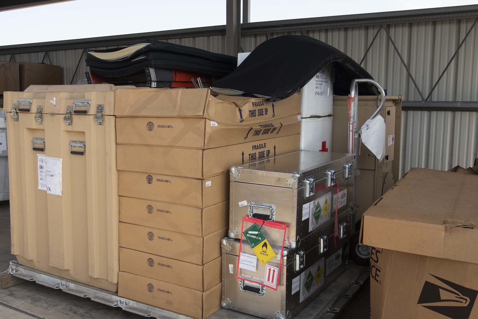 A pallet of medical equipment awaits distribution from the Defense Logistics Agency (DLA) at Camp Lemonnier, Djibouti, Apr. 22, 2020. The medical equipment is part of Combined Joint Task Force-Horn of Africa’s (CJTF-HOA) protective measures for COVID-19 to maintain the health of the force. (U.S. Air Force photo by Tech. Sgt. Ashley Nicole Taylor)