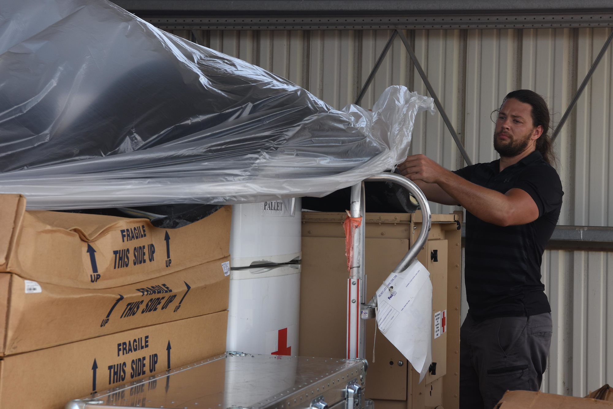 Brian Clark, a project supervisor for the Defense Logistics Agency (DLA), removes a cover from a pallet of medical equipment at Camp Lemonnier, Djibouti, Apr. 22, 2020. The medical equipment is part of Combined Joint Task Force-Horn of Africa’s (CJTF-HOA) protective measures for COVID-19 to maintain the health of the force. (U.S. Air Force photo by Tech. Sgt. Ashley Nicole Taylor)