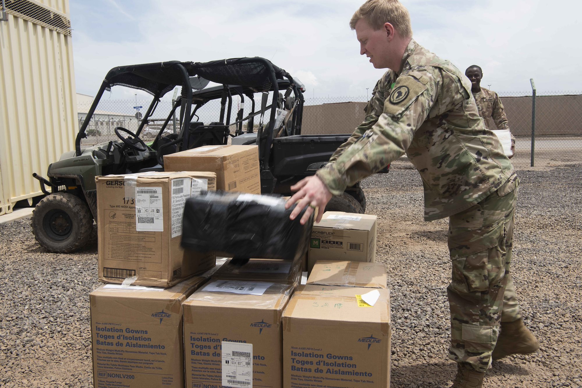 U.S. Army Sgt. Enock Langat, medical logistics (MEDLOG) noncommissioned officer for Combined Joint Task Force-Horn of Africa (CJTF-HOA), prepares a shipment of medical supplies at Camp Lemonnier, Djibouti, Apr. 24, 2020. Since the inception of the COVID-19 outbreak, the MEDLOG team has shipped more than 7,000 surgical masks (facemasks), including 5,000 N95 respirators; 2,500 surgical gowns; 150 pairs of reusable goggles; and 20,000 pairs of gloves to outstations throughout East Africa. (U.S. Air Force photo by Tech. Sgt. Ashley Nicole Taylor)