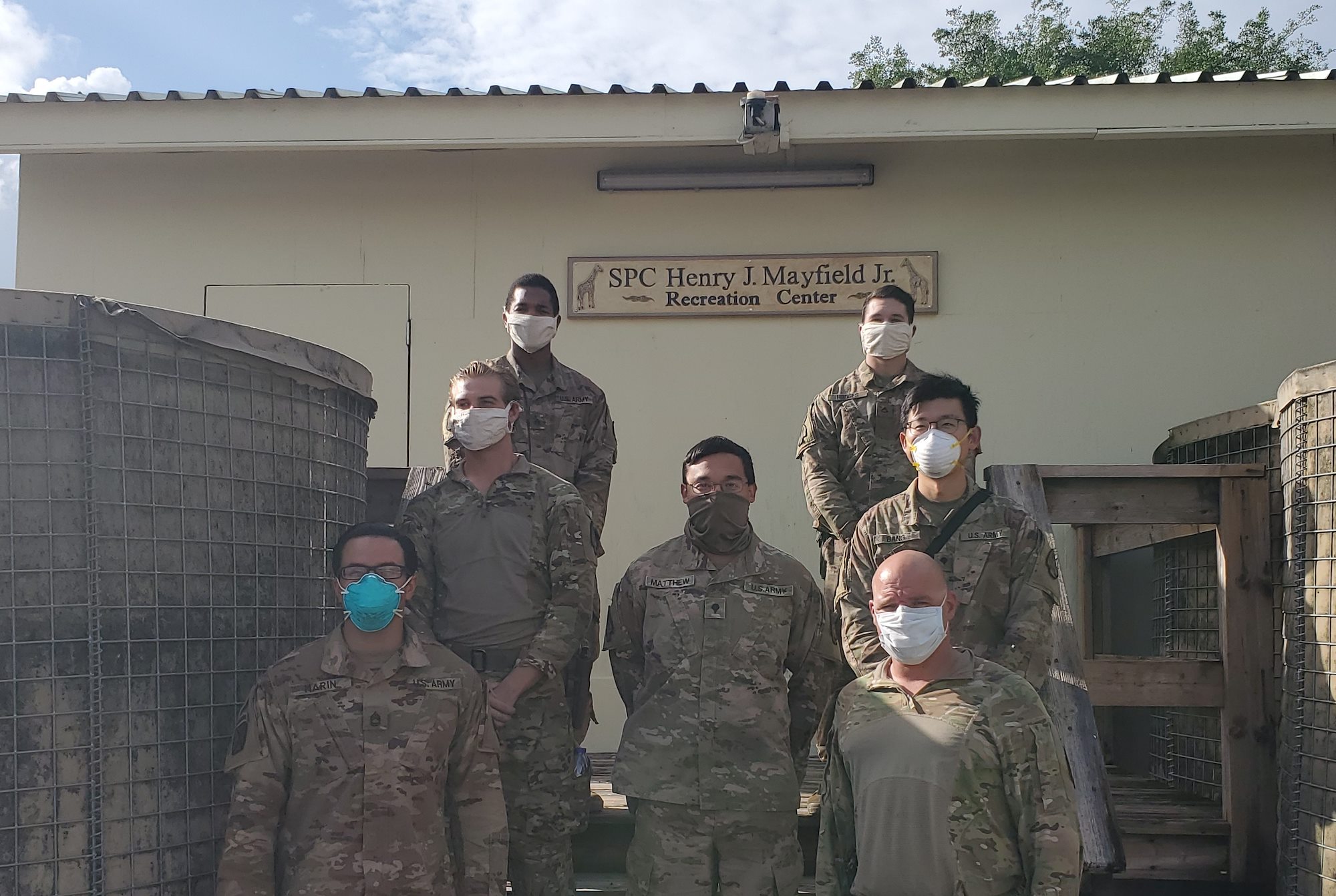 U.S. Army soldiers prepare to unveil the Henry Mayfield Jr. Dining Facility during the building’s grand opening and dedication ceremony at Baledogle Military Airfield (BMA), Somalia, May 1, 2020. The facility was named for U.S. Army Spc. Henry J. “Mitch” Mayfield Jr., who was killed in action Jan. 5, 2020, during an attack on Manda Bay Airfield, Kenya, by a terrorist organization. Mayfield, a Chicago native, was deployed to Kenya with the 1st Battalion, 58th Aviation Regiment, 164th Theater Airfield Operations Group, from Fort Rucker, Alabama. (U.S. Navy photo by Logistics Specialist 2nd Class Toniece Lurch)