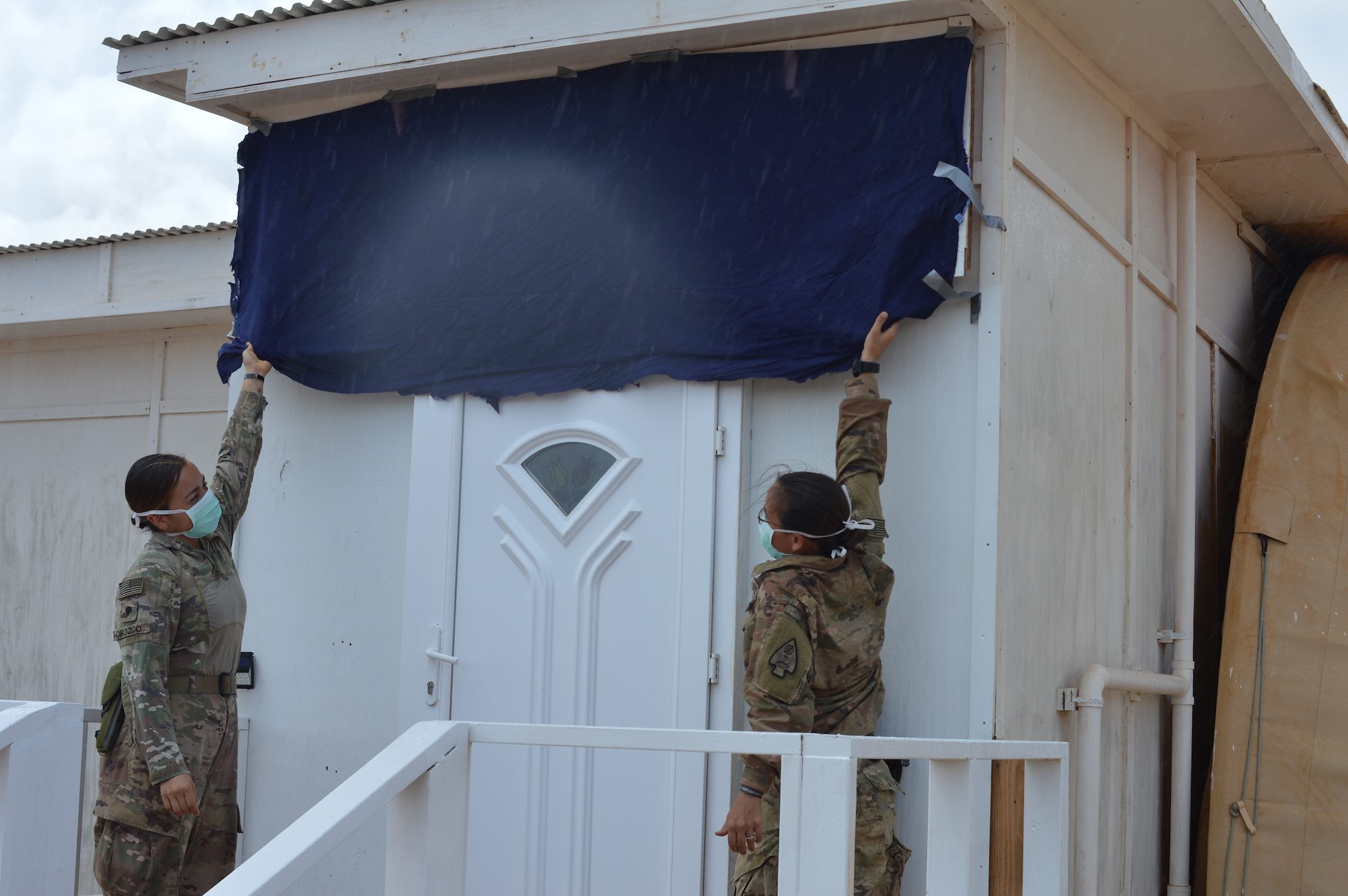 U.S. Army Sgt. Paul Ludowese (left) and Spc. Nabin Karki, vertical construction engineers, assigned to the 492nd Engineer Vertical Construction Company (EVCC), Combined Joint Task Force-Horn of Africa (CJTF-HOA), nail ceiling material during the construction of a new building within the Djibouti Base Cluster, Djibouti, May 8, 2020. The 492nd EVCC performs construction projects throughout East Africa in support of CJTF-HOA. (U.S. Air Force photo by Senior Airman Gage Daniel)