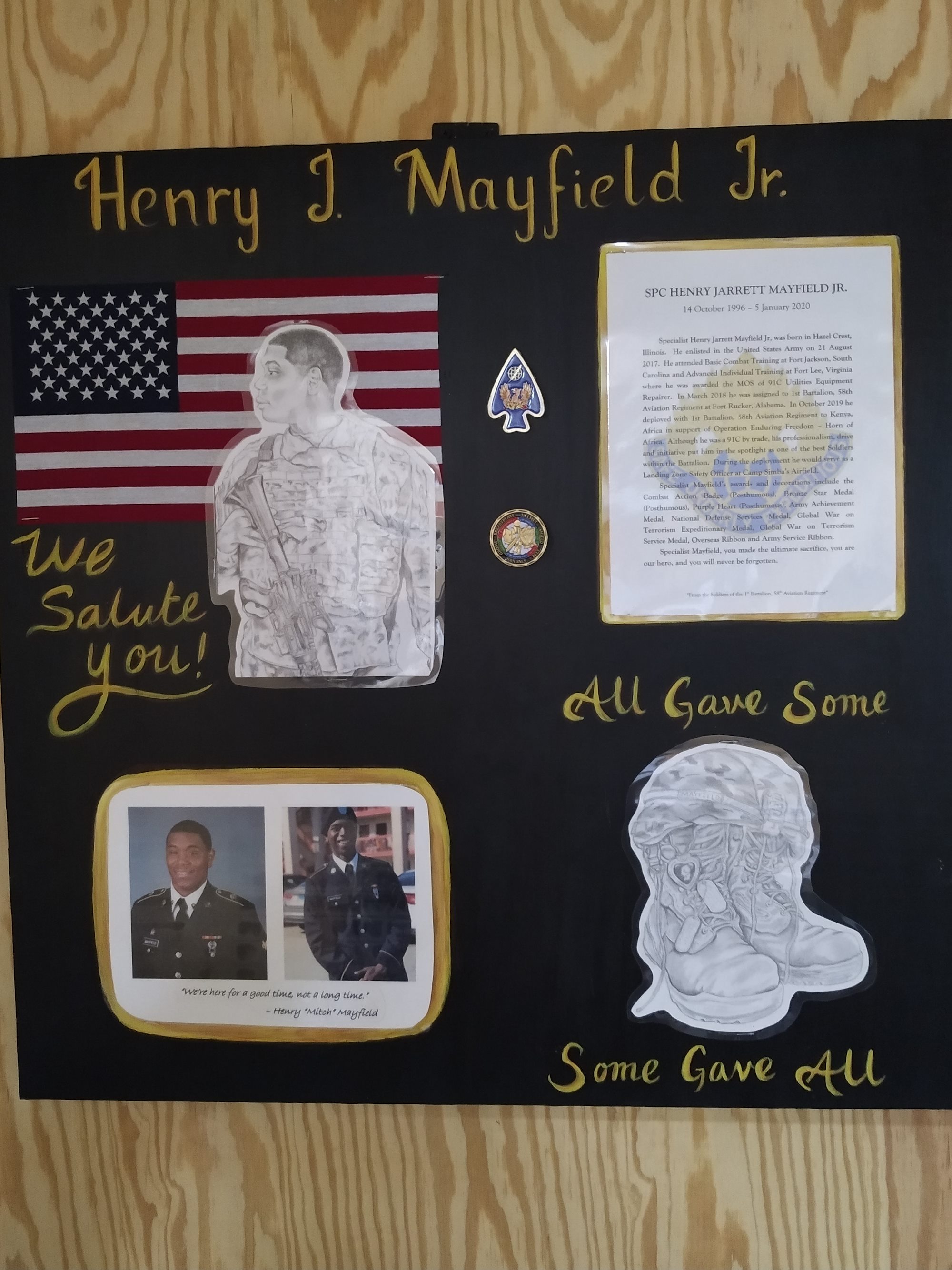 A memorial for U.S. Army Spc. Henry “Mitch” Mayfield, Jr. sits inside the Henry Mayfield Jr. Dining Facility at Baledogle Military Airfield (BMA), Somalia, May 1, 2020. The Henry Mayfield Jr. Dining Facility includes a hand-drawn portrait, as well as information about Mayfield’s military career. The facility, which had its grand opening and dedication ceremony May 1, was named in honor of Mayfield, who was killed in action Jan. 5, 2020, during an attack on Manda Bay Airfield, Kenya, by a terrorist organization. Mayfield, a Chicago native, was deployed to Kenya with the 1st Battalion, 58th Aviation Regiment, 164th Theater Airfield Operations Group, from Fort Rucker, Alabama. (U.S. Navy photo by Logistics Specialist 2nd Class Toniece Lurch)