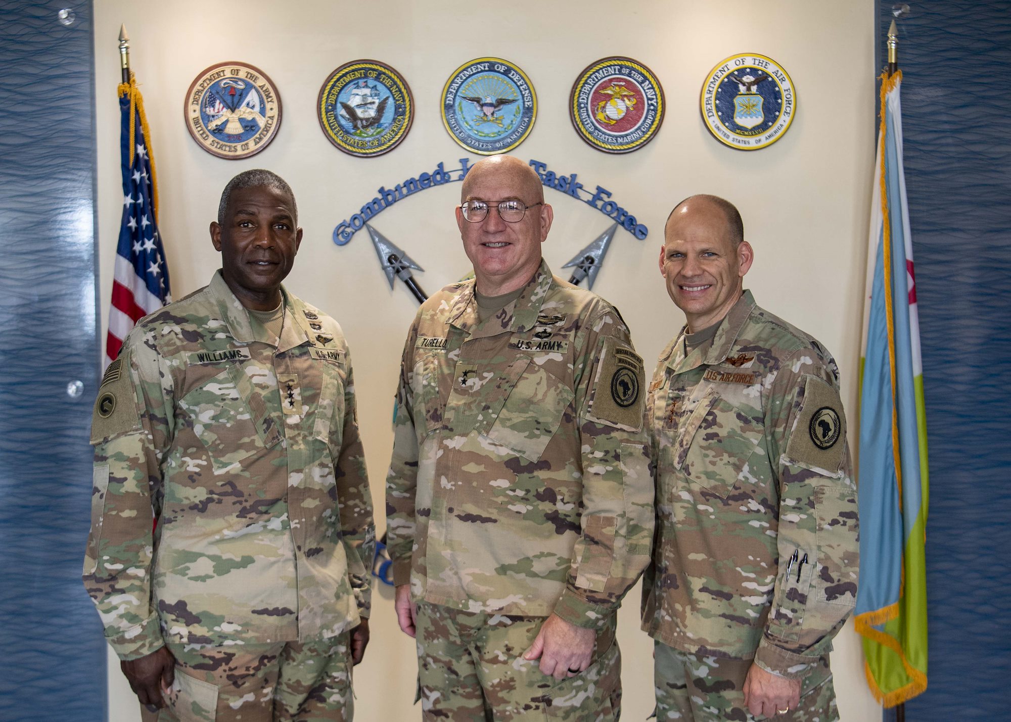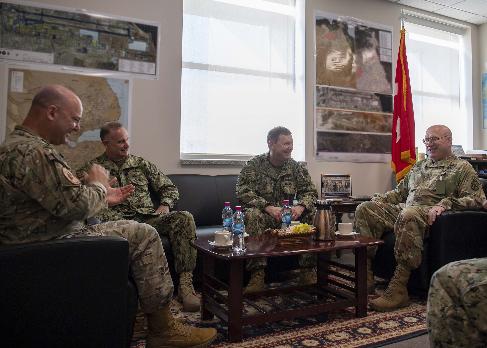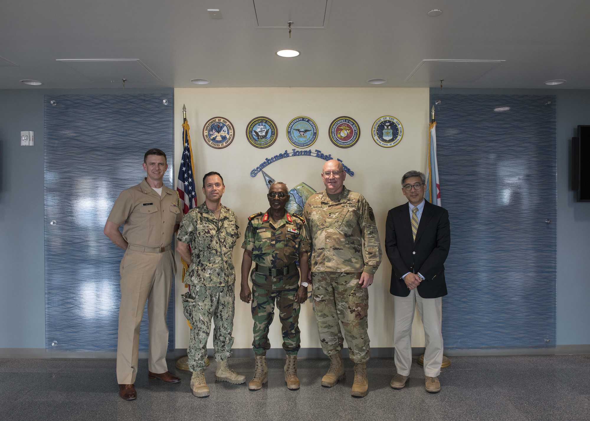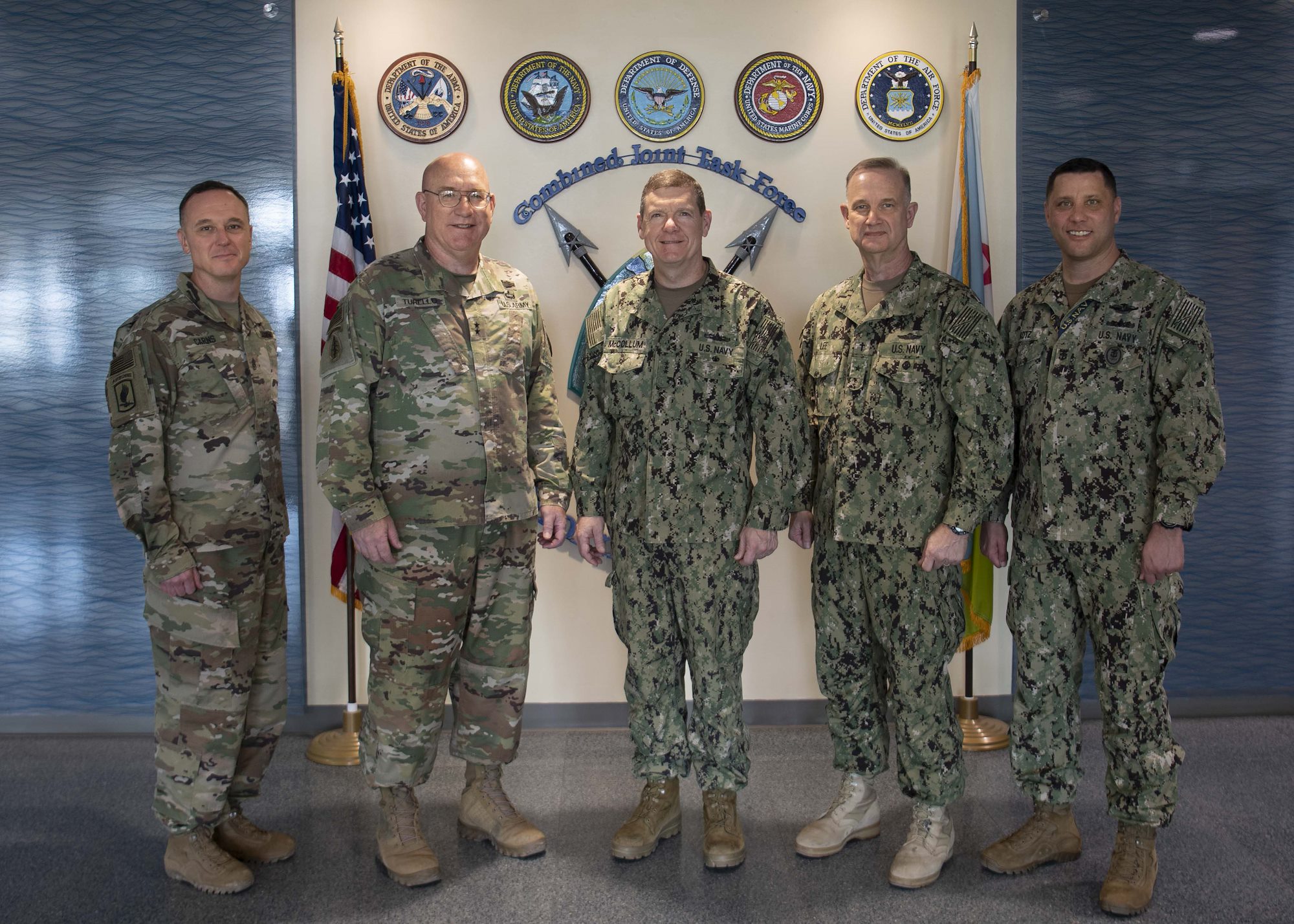 From left, U.S. Army Command Sgt. Maj. Shawn Carns, command senior enlisted leader (CSEL), Combined Joint Task Force-Horn of Africa (CJTF-HOA), U.S. Army Maj. Gen. Michael Turello, commanding general, CJTF-HOA, U.S. Navy Vice Adm. Luke McCollum, commander, Navy Reserve Force, chief, Navy Reserve, U.S. Navy Rear Adm. Endel Lee, deputy chief of chaplains, Reserve Matters, and U.S. Navy Master Chief Christopher Kotz, force master chief, Navy Reserve, pose for a group photo at Camp Lemonnier, Djibouti, Nov. 29, 2019. McCollum visited Camp Lemonnier to meet with deployed Navy Reserve sailors and other service members. (U.S. Air Force photo by Staff Sgt. J.D. Strong II)