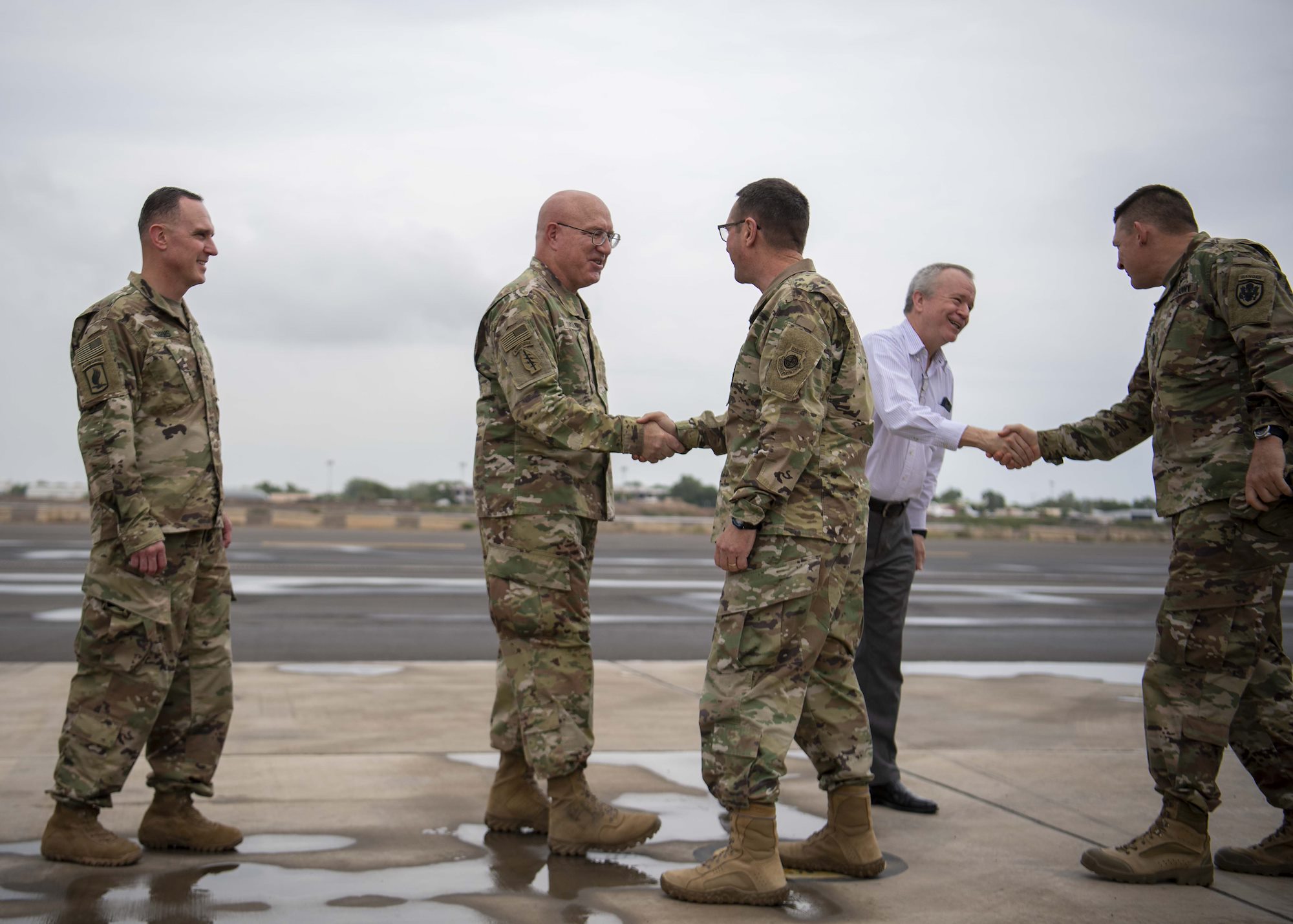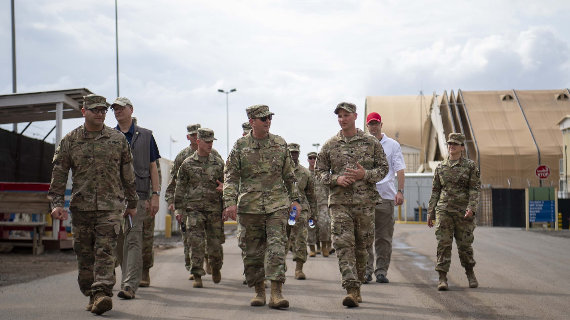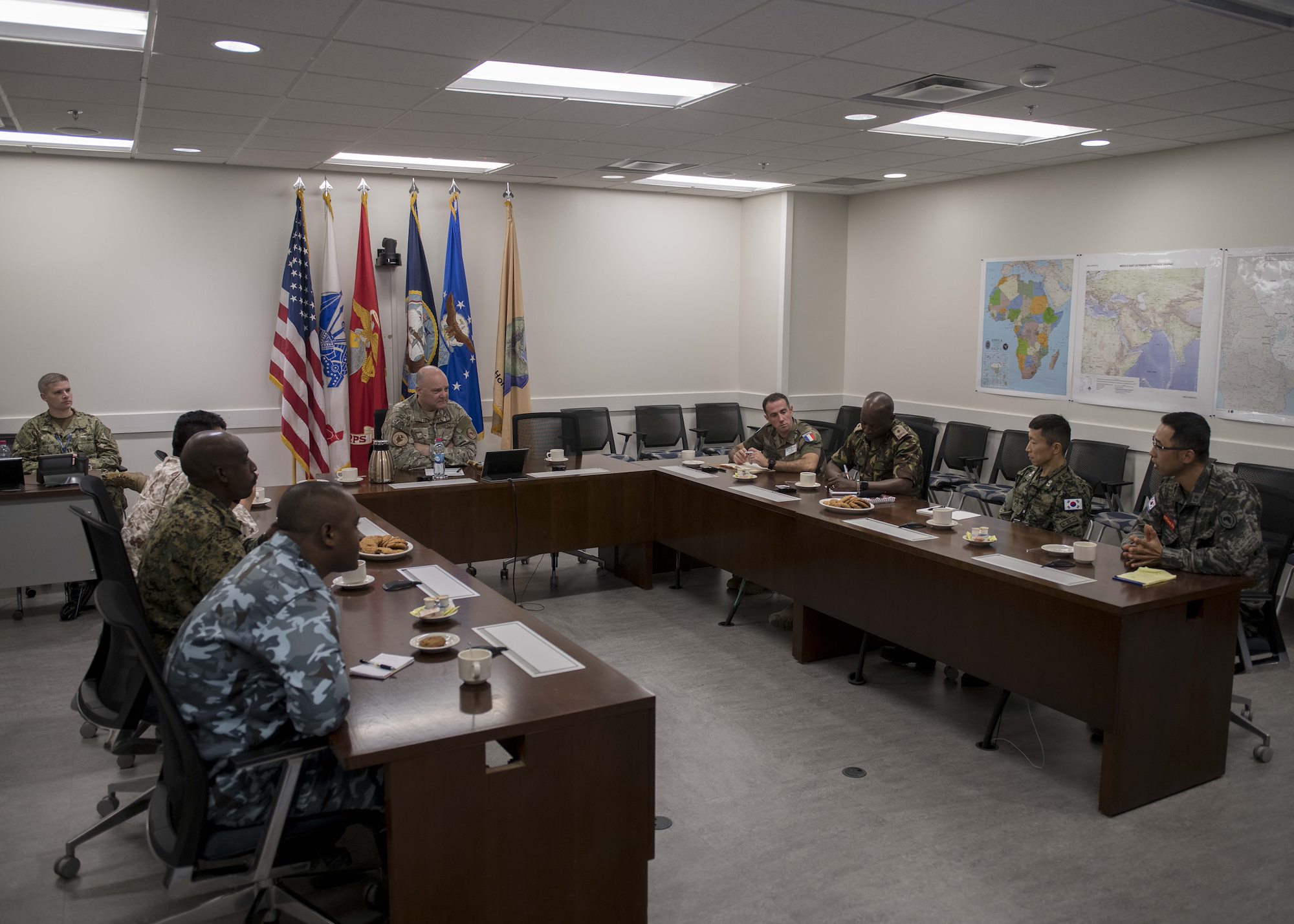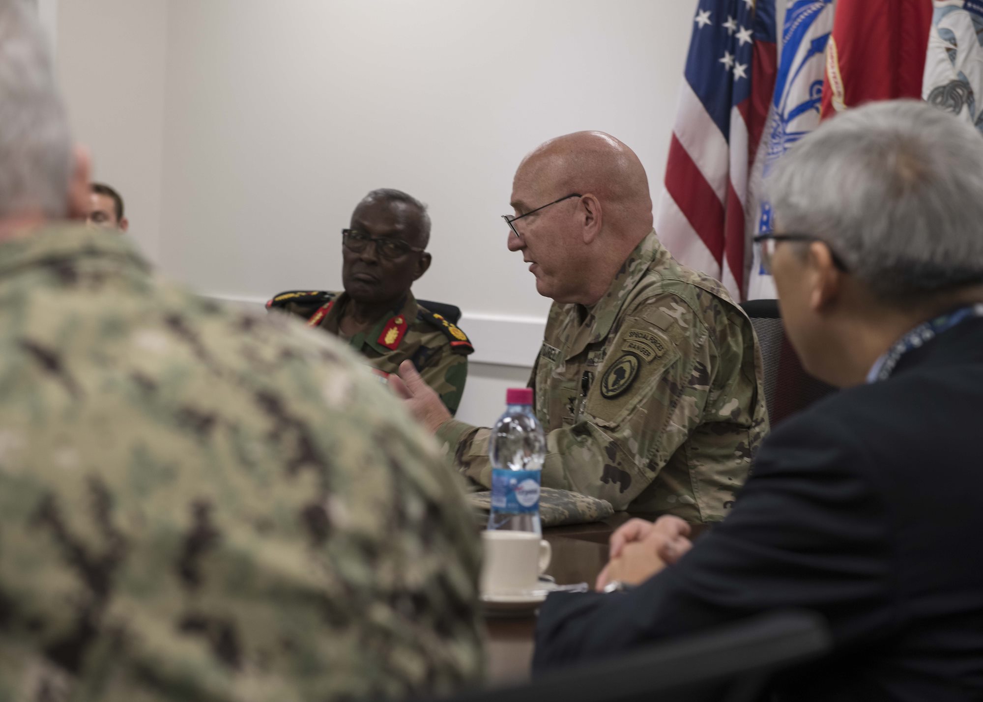 From left, U.S. Army Command Sgt. Maj. Shawn Carns, command senior enlisted leader (CSEL), Combined Joint Task Force-Horn of Africa (CJTF-HOA), U.S. Army Maj. Gen. Michael Turello, commanding general, CJTF-HOA, U.S. Navy Vice Adm. Luke McCollum, commander, Navy Reserve Force, chief, Navy Reserve, U.S. Navy Rear Adm. Endel Lee, deputy chief of chaplains, Reserve Matters, and U.S. Navy Master Chief Christopher Kotz, force master chief, Navy Reserve, pose for a group photo at Camp Lemonnier, Djibouti, Nov. 29, 2019. McCollum visited Camp Lemonnier to meet with deployed Navy Reserve sailors and other service members. (U.S. Air Force photo by Staff Sgt. J.D. Strong II)