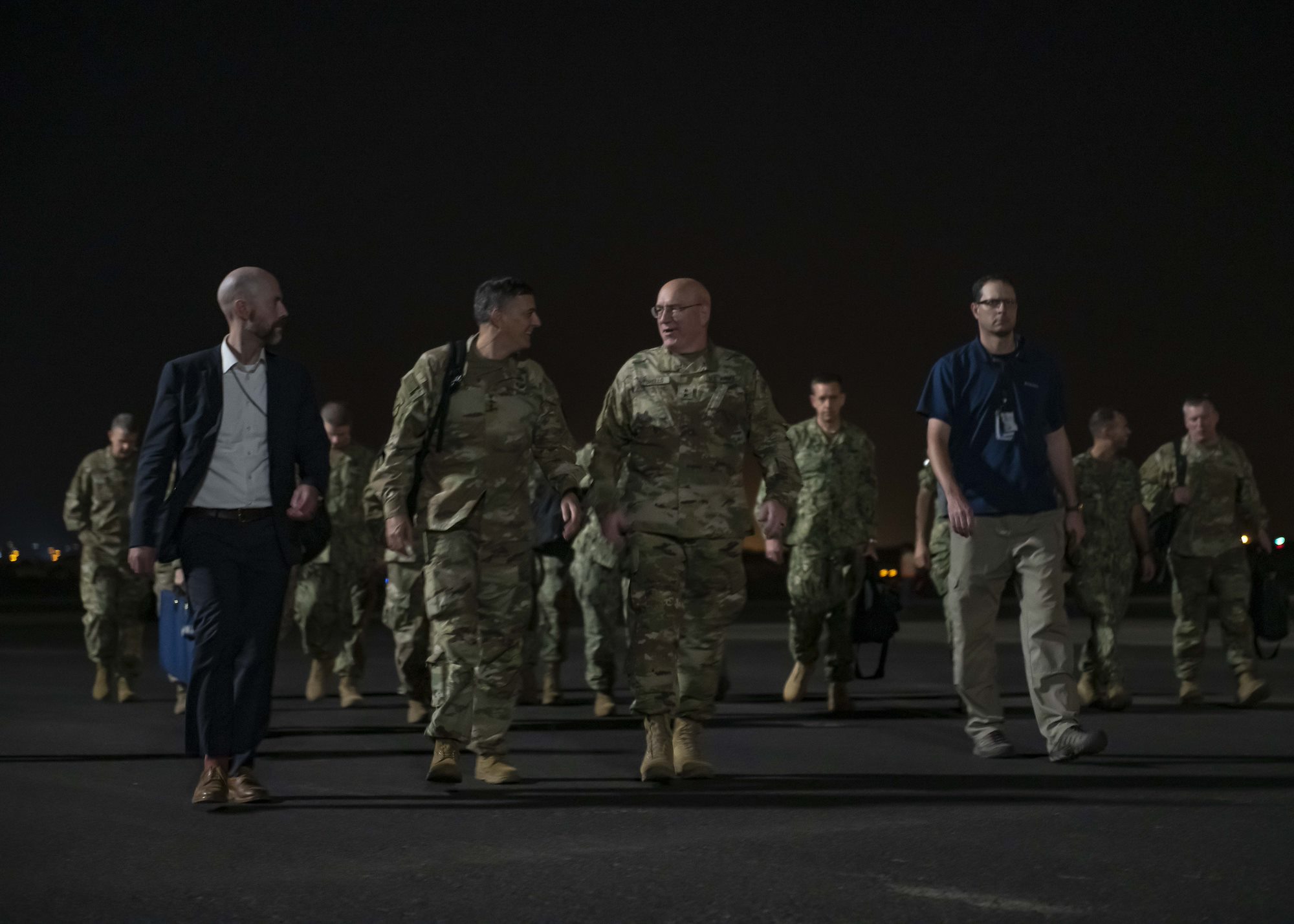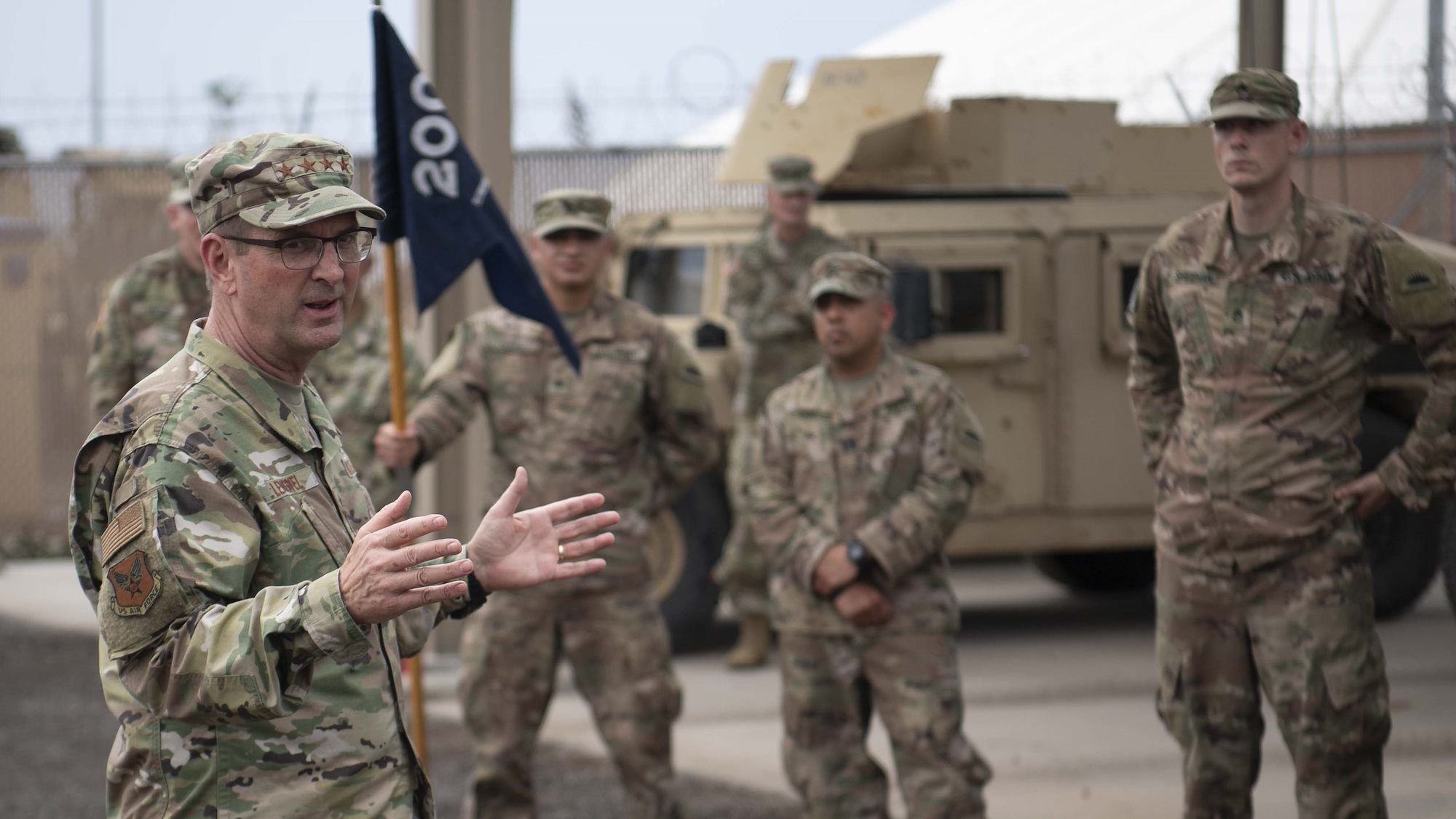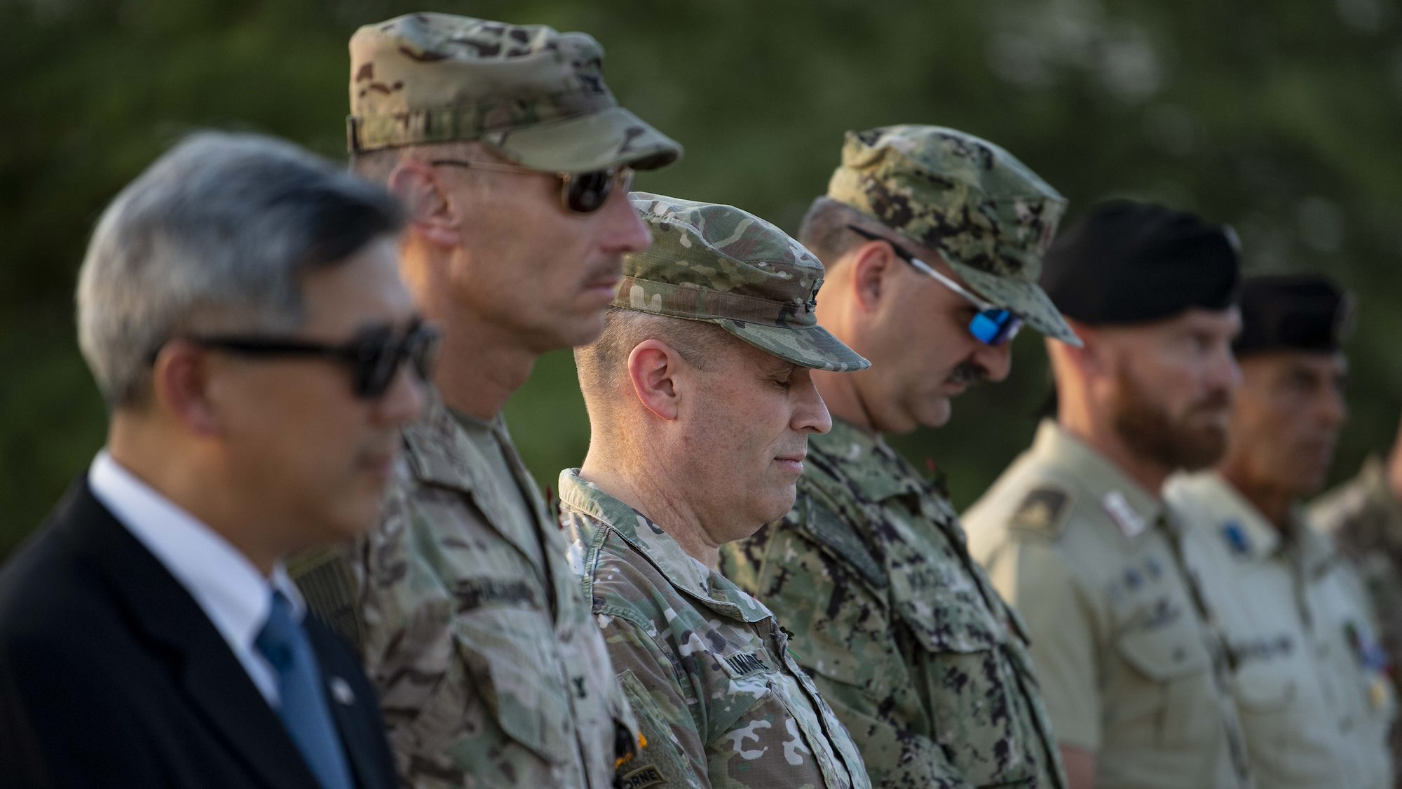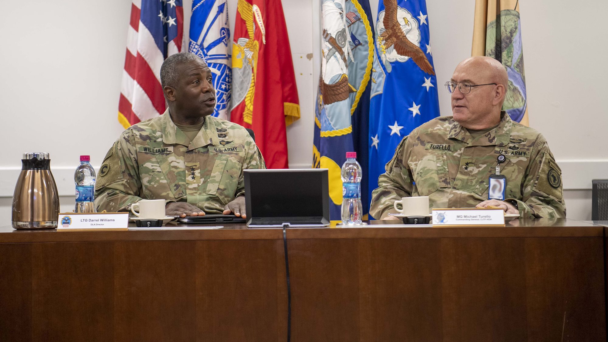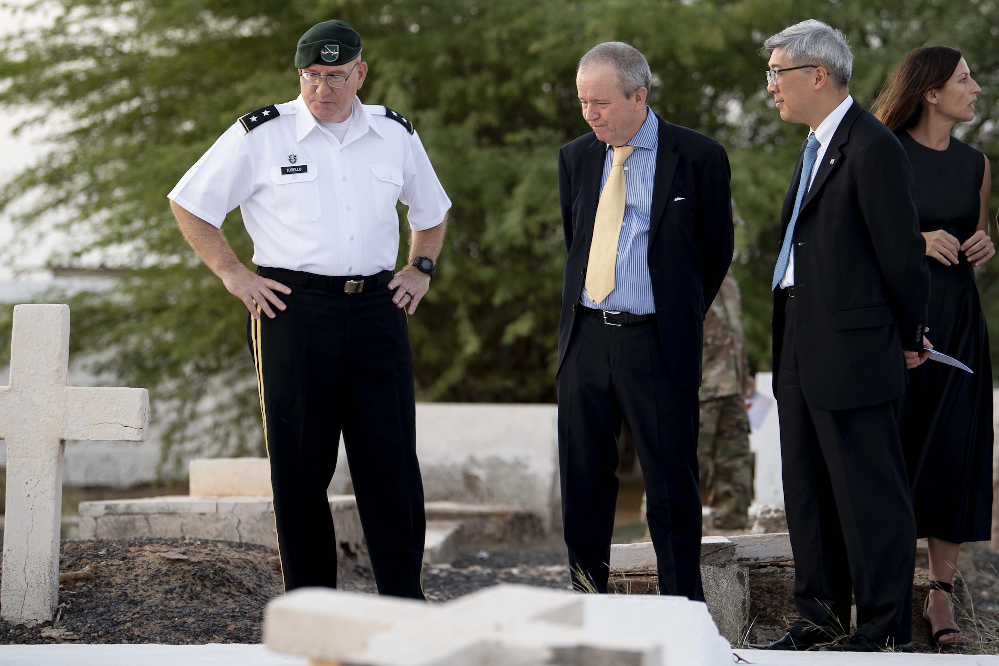 From left, U.S. Army Command Sgt. Maj. Shawn Carns, command senior enlisted leader (CSEL), Combined Joint Task Force-Horn of Africa (CJTF-HOA), U.S. Army Maj. Gen. Michael Turello, commanding general, CJTF-HOA, U.S. Navy Vice Adm. Luke McCollum, commander, Navy Reserve Force, chief, Navy Reserve, U.S. Navy Rear Adm. Endel Lee, deputy chief of chaplains, Reserve Matters, and U.S. Navy Master Chief Christopher Kotz, force master chief, Navy Reserve, pose for a group photo at Camp Lemonnier, Djibouti, Nov. 29, 2019. McCollum visited Camp Lemonnier to meet with deployed Navy Reserve sailors and other service members. (U.S. Air Force photo by Staff Sgt. J.D. Strong II)