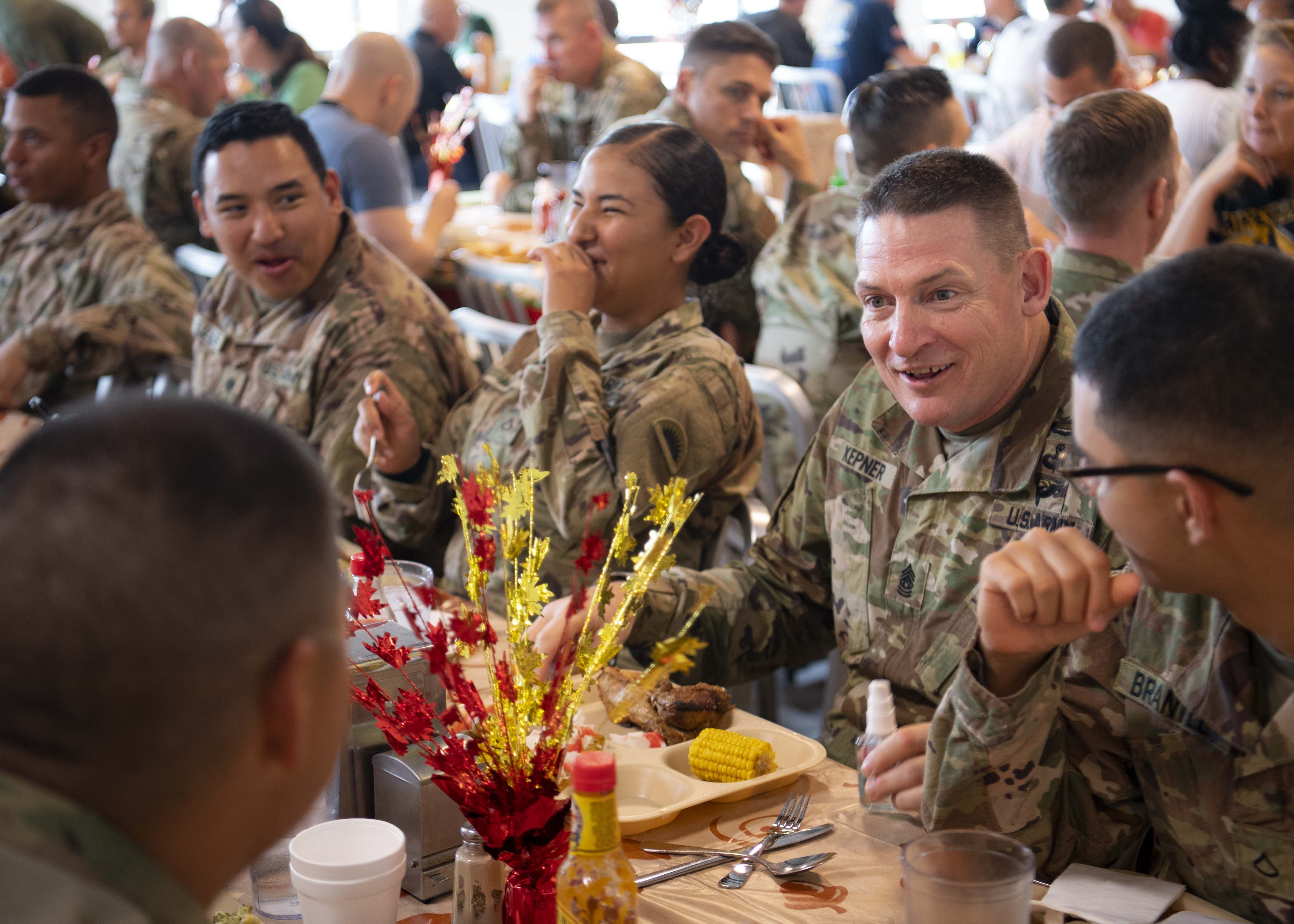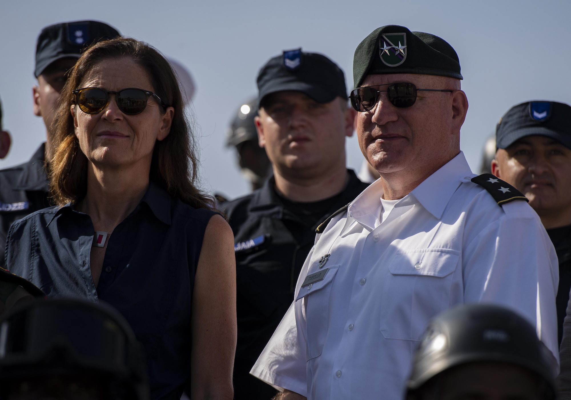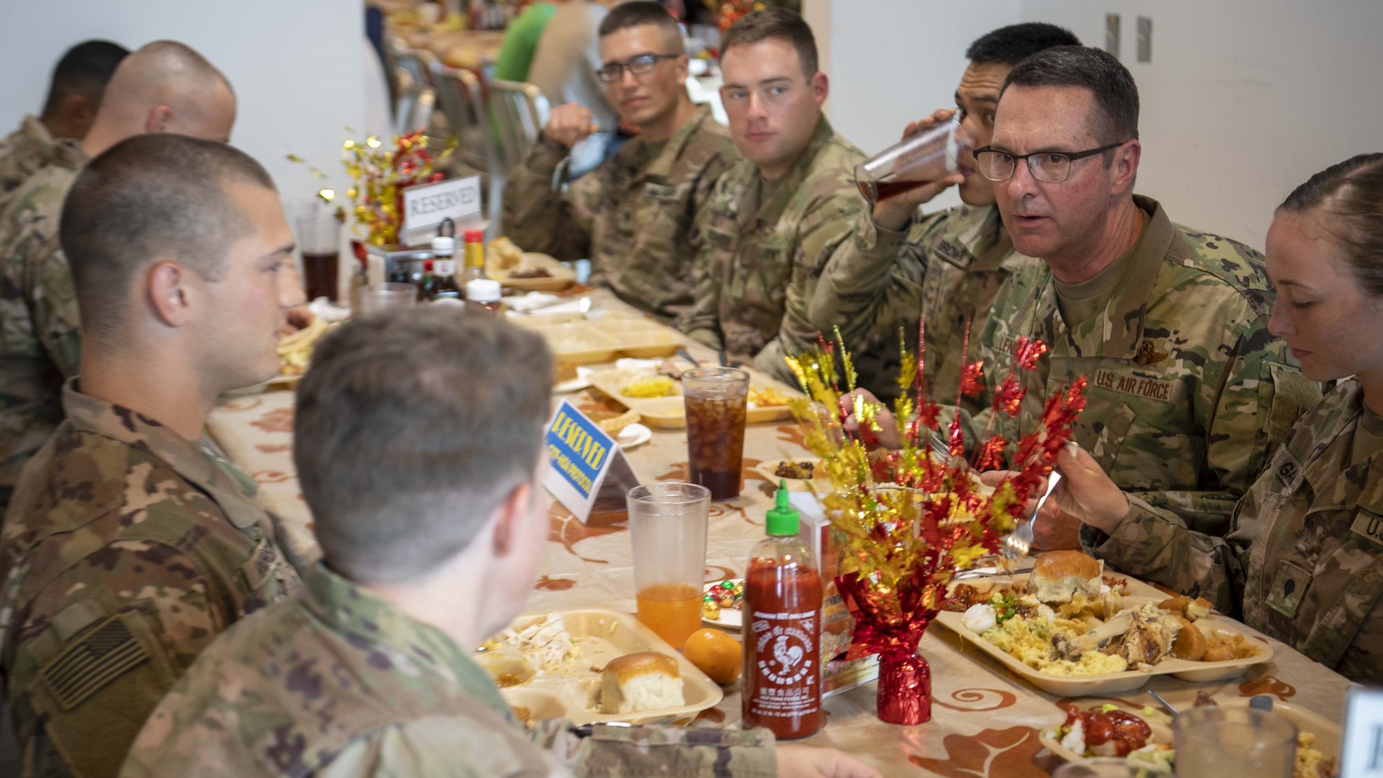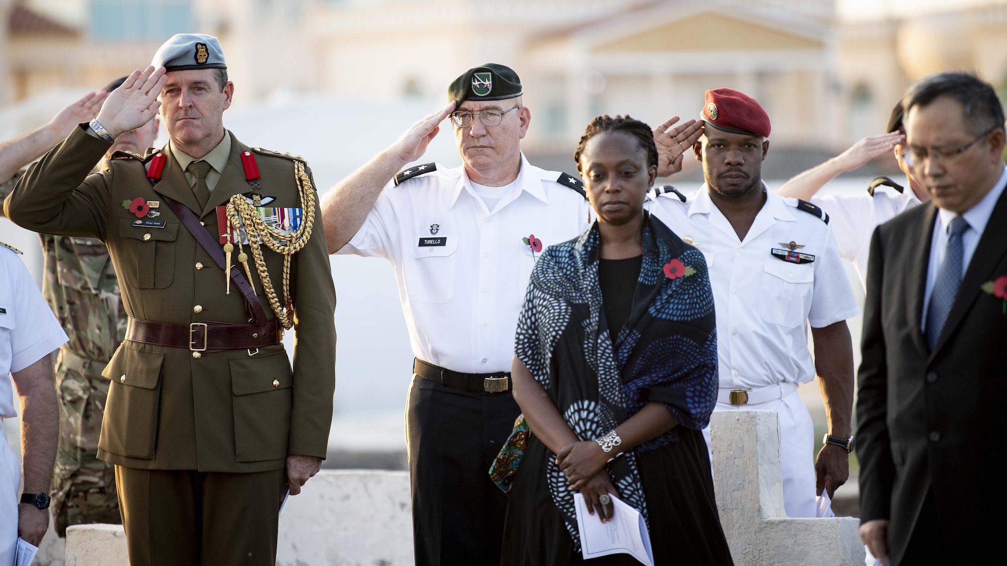 From left, U.S. Army Command Sgt. Maj. Shawn Carns, command senior enlisted leader (CSEL), Combined Joint Task Force-Horn of Africa (CJTF-HOA), U.S. Army Maj. Gen. Michael Turello, commanding general, CJTF-HOA, U.S. Navy Vice Adm. Luke McCollum, commander, Navy Reserve Force, chief, Navy Reserve, U.S. Navy Rear Adm. Endel Lee, deputy chief of chaplains, Reserve Matters, and U.S. Navy Master Chief Christopher Kotz, force master chief, Navy Reserve, pose for a group photo at Camp Lemonnier, Djibouti, Nov. 29, 2019. McCollum visited Camp Lemonnier to meet with deployed Navy Reserve sailors and other service members. (U.S. Air Force photo by Staff Sgt. J.D. Strong II)