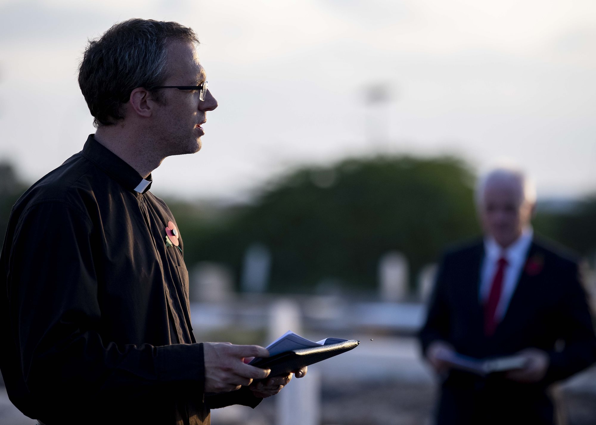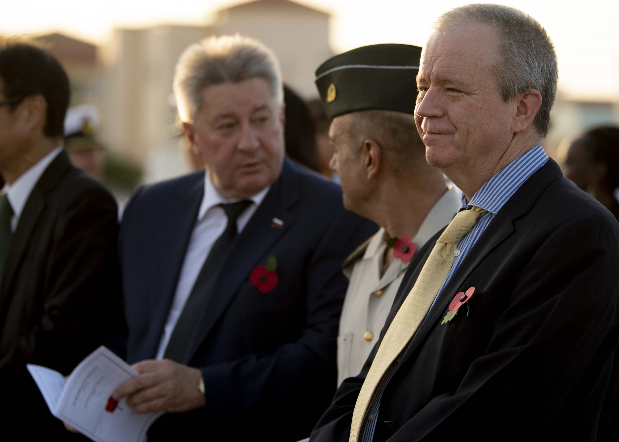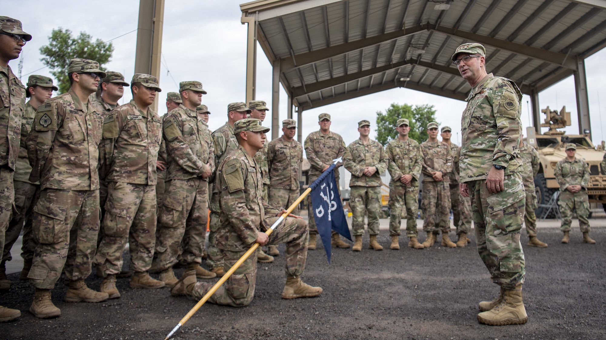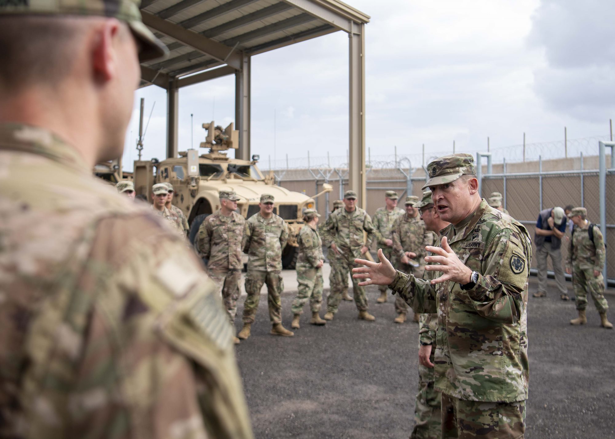 From left, U.S. Army Command Sgt. Maj. Shawn Carns, command senior enlisted leader (CSEL), Combined Joint Task Force-Horn of Africa (CJTF-HOA), U.S. Army Maj. Gen. Michael Turello, commanding general, CJTF-HOA, U.S. Navy Vice Adm. Luke McCollum, commander, Navy Reserve Force, chief, Navy Reserve, U.S. Navy Rear Adm. Endel Lee, deputy chief of chaplains, Reserve Matters, and U.S. Navy Master Chief Christopher Kotz, force master chief, Navy Reserve, pose for a group photo at Camp Lemonnier, Djibouti, Nov. 29, 2019. McCollum visited Camp Lemonnier to meet with deployed Navy Reserve sailors and other service members. (U.S. Air Force photo by Staff Sgt. J.D. Strong II)