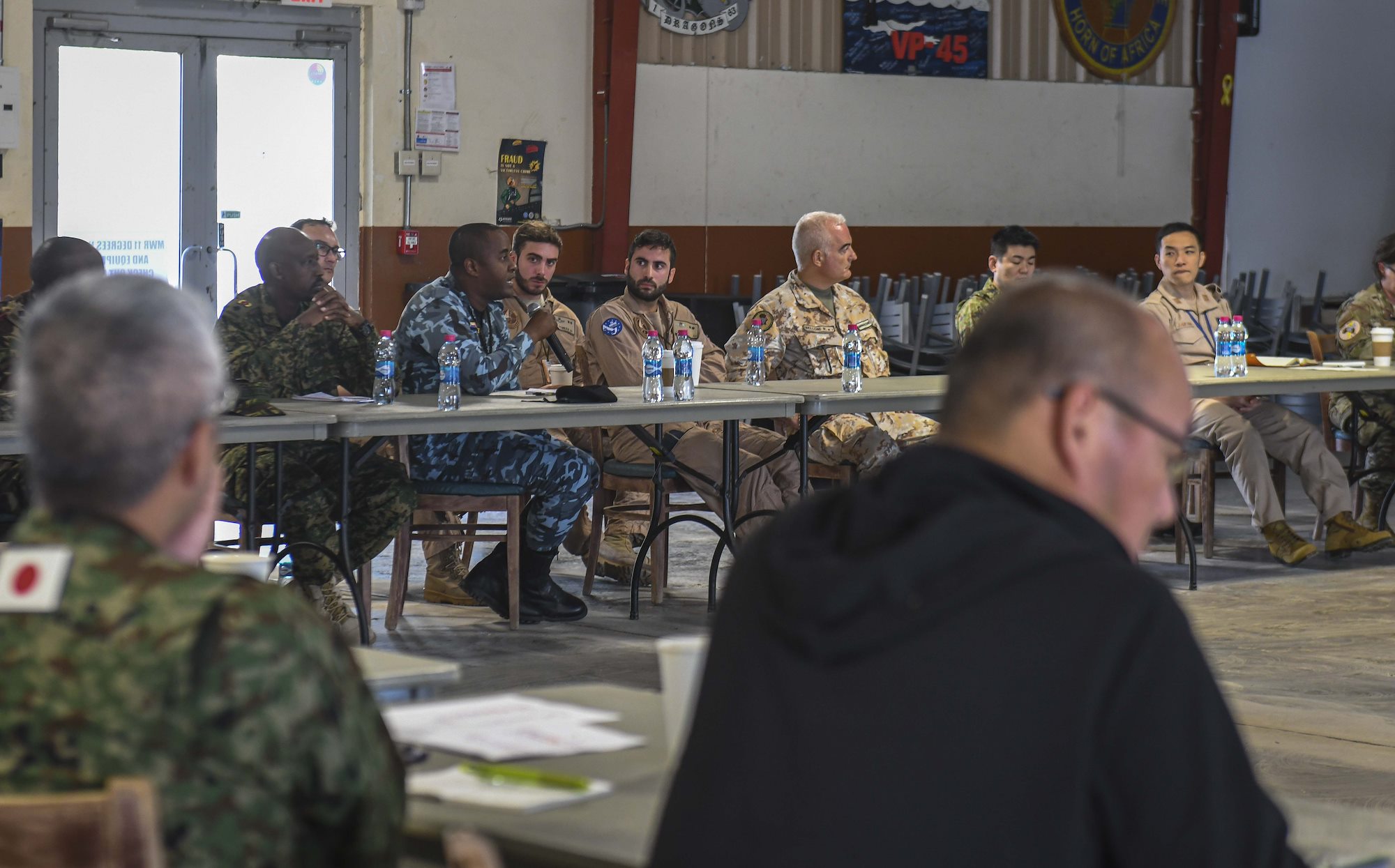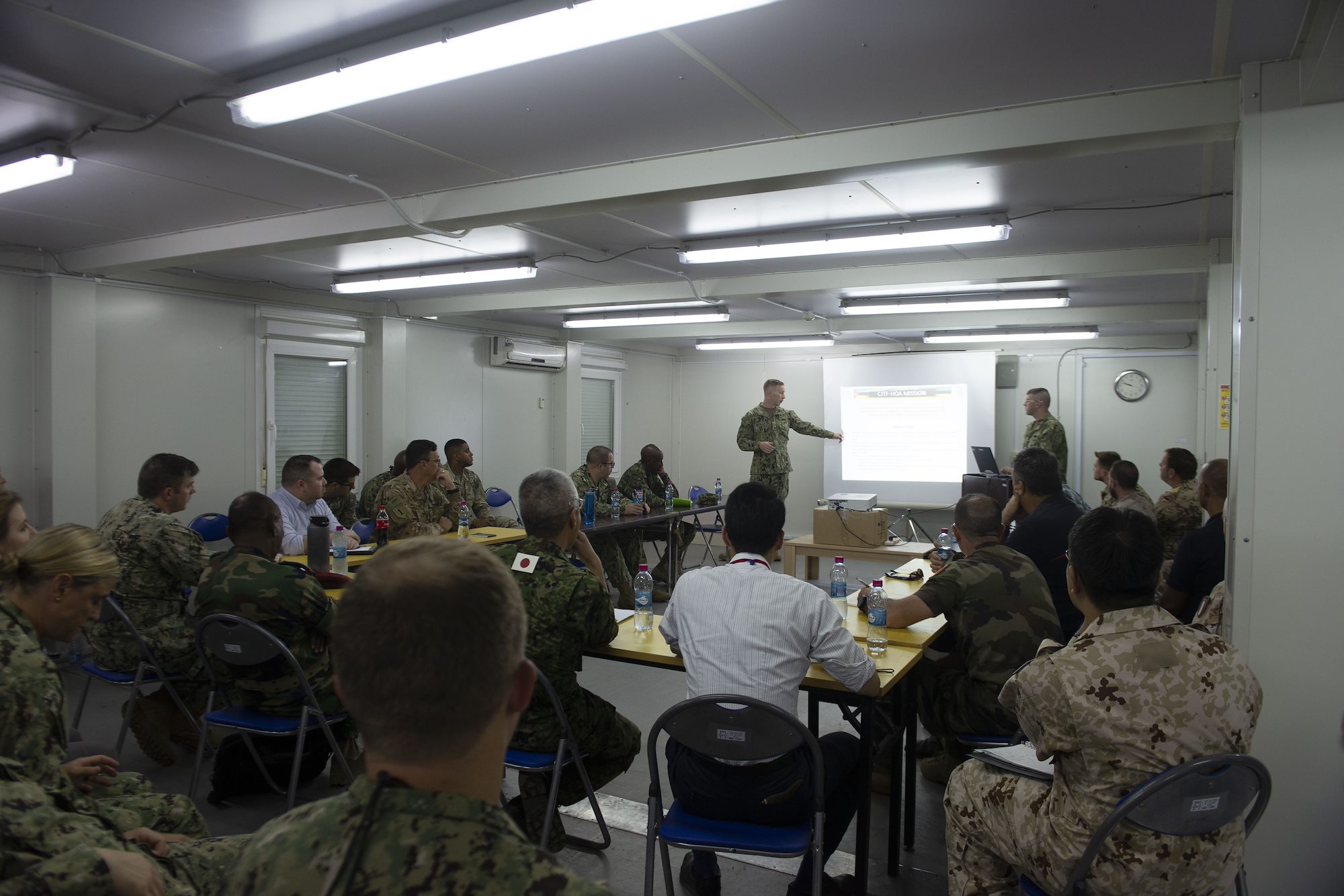 Multinational service members and representatives take part in a tabletop discussion during an annual noncombatant evacuation operation (NEO) exercise held at Camp Lemonnier, Djibouti, Oct. 4, 2019. Service members assigned to Combined Joint Task Force-Horn of Africa (CJTF-HOA) worked together with the Japan Self-Defense Force (JSDF) to share capabilities during the multi-day event, which was held from Oct. 1-4. (U.S. Air Force photo by Senior Airman Gabrielle Spalding)