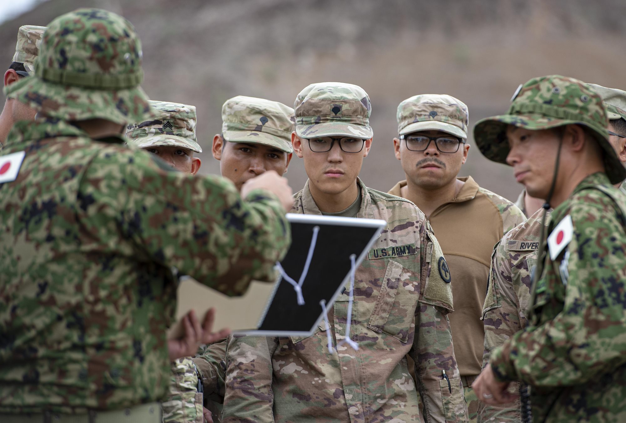 U.S. Army soldiers assigned to Combined Joint Task Force-Horn of Africa (CJTF-HOA) listen to a Japanese service member go over operation plans during a bilateral field training exercise in Djibouti, Africa, Oct. 2, 2019. The field training exercise related to military response of a mock explosion of an improvised explosive device (IED) during a convoy operation, as well as a response to a complex attack. (U.S. Air Force photo by Senior Airman Gabrielle Spalding)