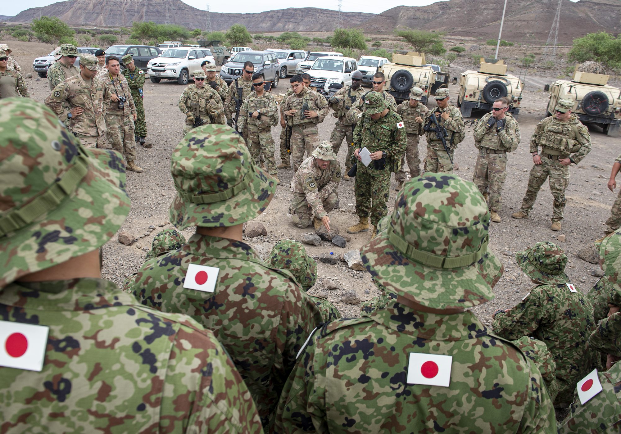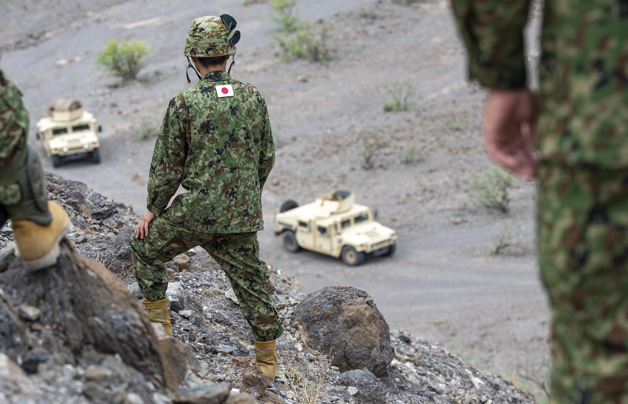 A Japanese service member watches U.S. Army High Mobility Multipurpose Wheeled Vehicles (HMMWV) during a bilateral field training exercise in Djibouti, Africa, Oct. 2, 2019. The training was part of a multi-day exercise with Combined Joint Task Force-Horn of Africa (CJTF-HOA) and Japanese service members, during which multinational discussions, NEO tracking system demonstrations, and tabletop exercises were conducted. (U.S. Air Force photo by Senior Airman Gabrielle Spalding)