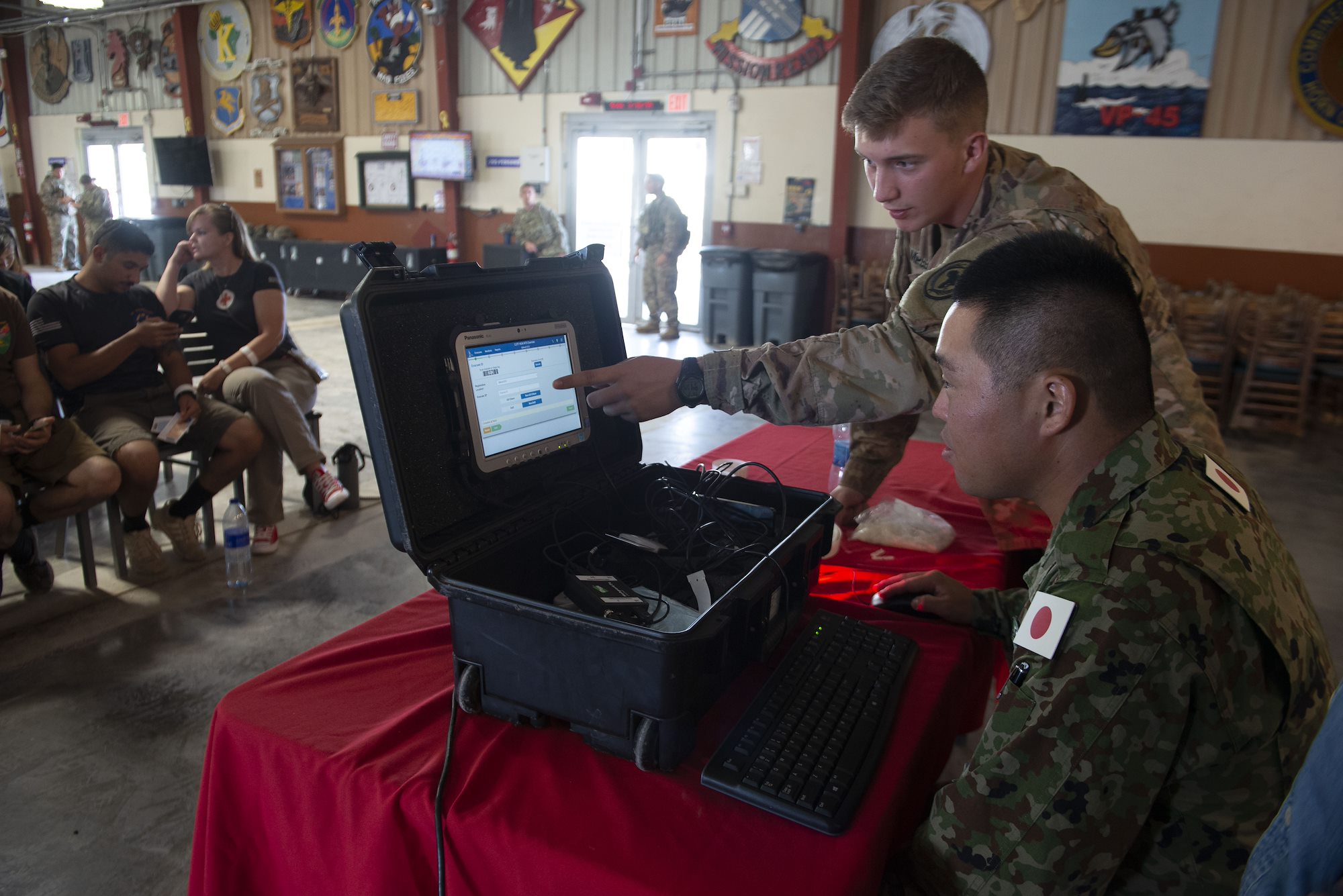 U.S. Army Sgt. Alexander Campbell, joint reception center non-commissioned officer in charge (NCOIC), assigned to Combined Joint Task Force-Horn of Africa (CJTF-HOA), enters evacuees into the noncombatant tracking system (NTS) at Camp Lemonnier, Djibouti, Oct.3, 2019. This demonstration was part of a multi-day exercise with CJTF-HOA and Japanese military members in which multinational discussions, bilateral field training, and tabletop exercises were conducted. (U.S. Air Force photo by Senior Airman Gabrielle Spalding)