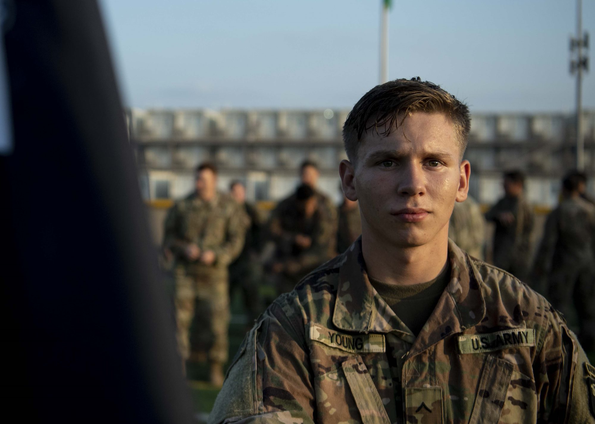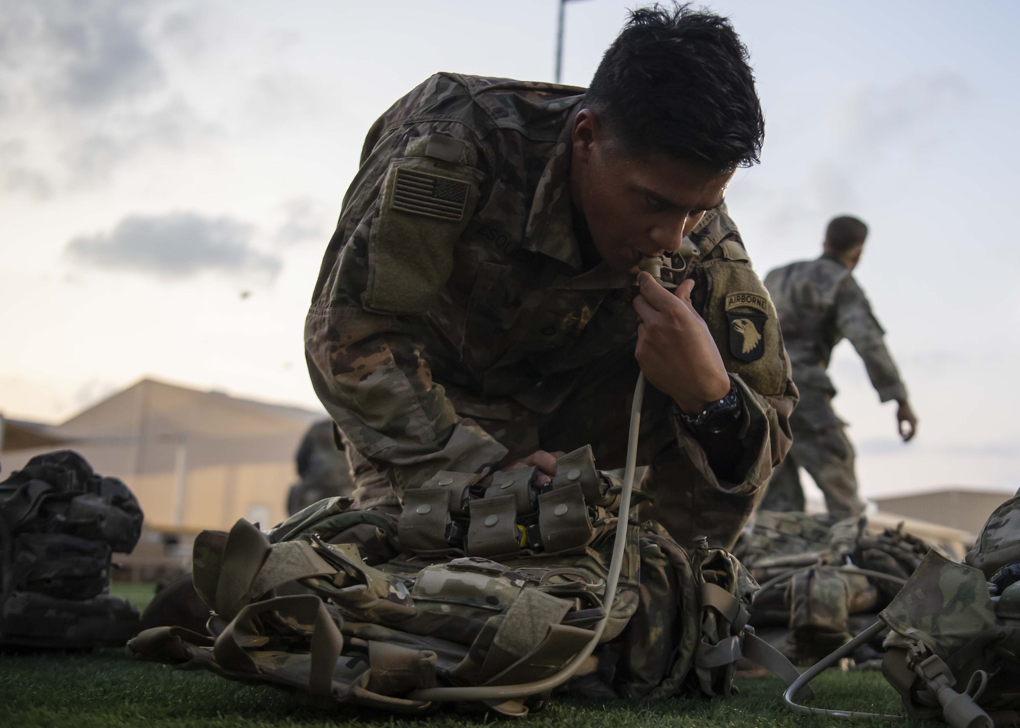 A U.S. Army Soldier from the 101st Division, 2nd Battalion, 506th Infantry Regiment, East African Response Force (EARF), hydrates after an event during the EARF’s best platoon competition at Camp Lemonnier, Djibouti, Oct. 25, 2019. During the competition Soldiers completed a two-mile run, 25 meters of lunges, burpee long jumps and high crawls before finishing with 10 eight-count push-ups. (U.S. Air Force photo by Staff Sgt. J.D. Strong II)