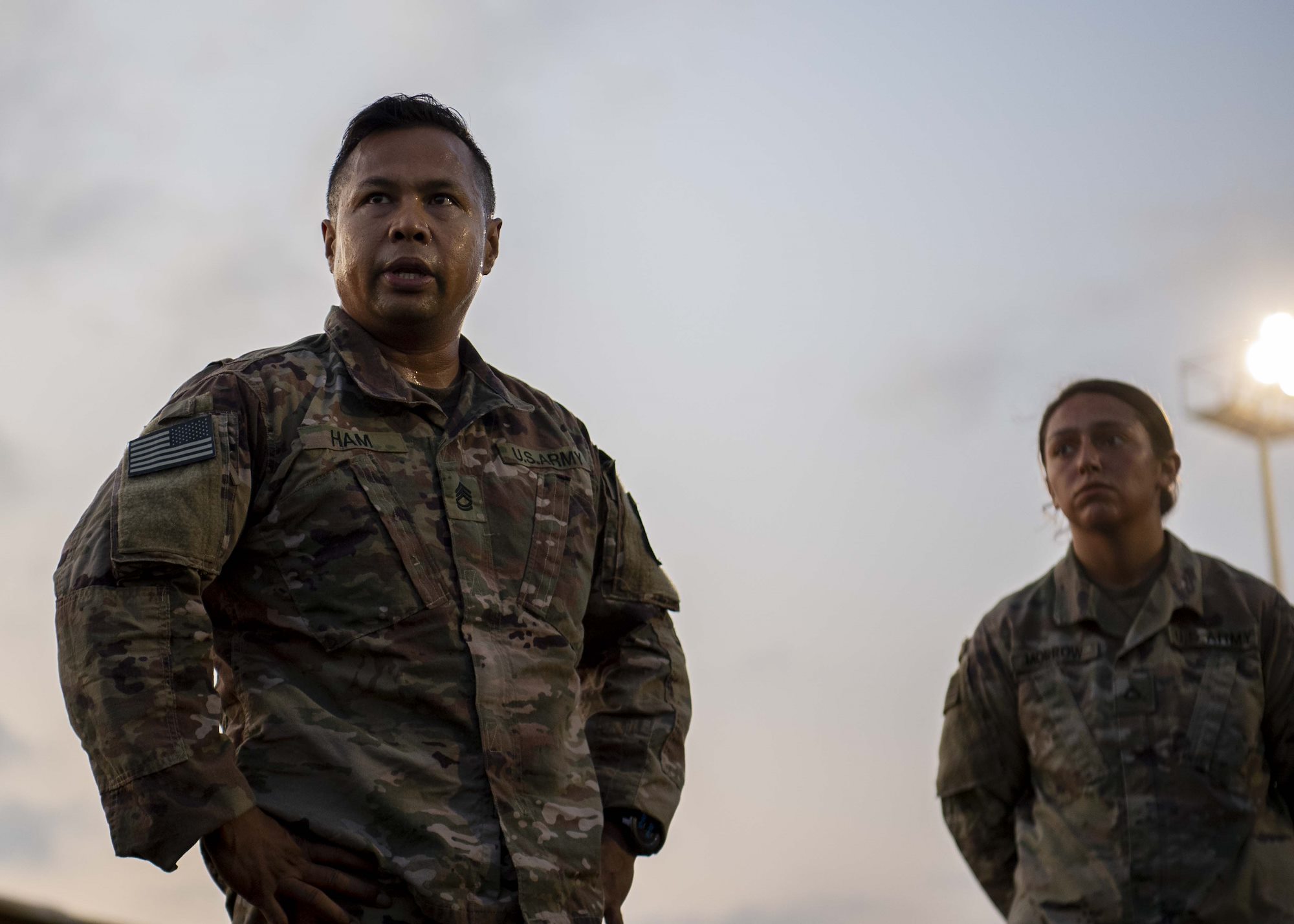 U.S. Army Sergeant First Class Vuthy Ham, NCOIC, 101st Division, 2nd Battalion, 506th Infantry Regiment, East African Response Force (EARF), motivates the 4th platoon Soldiers during the EARF’s best platoon competition at Camp Lemonnier, Djibouti, Oct. 25, 2019. 4th Platoon was the winner of the EARF’s best platoon competition. (U.S. Air Force photo by Staff Sgt. J.D. Strong II)