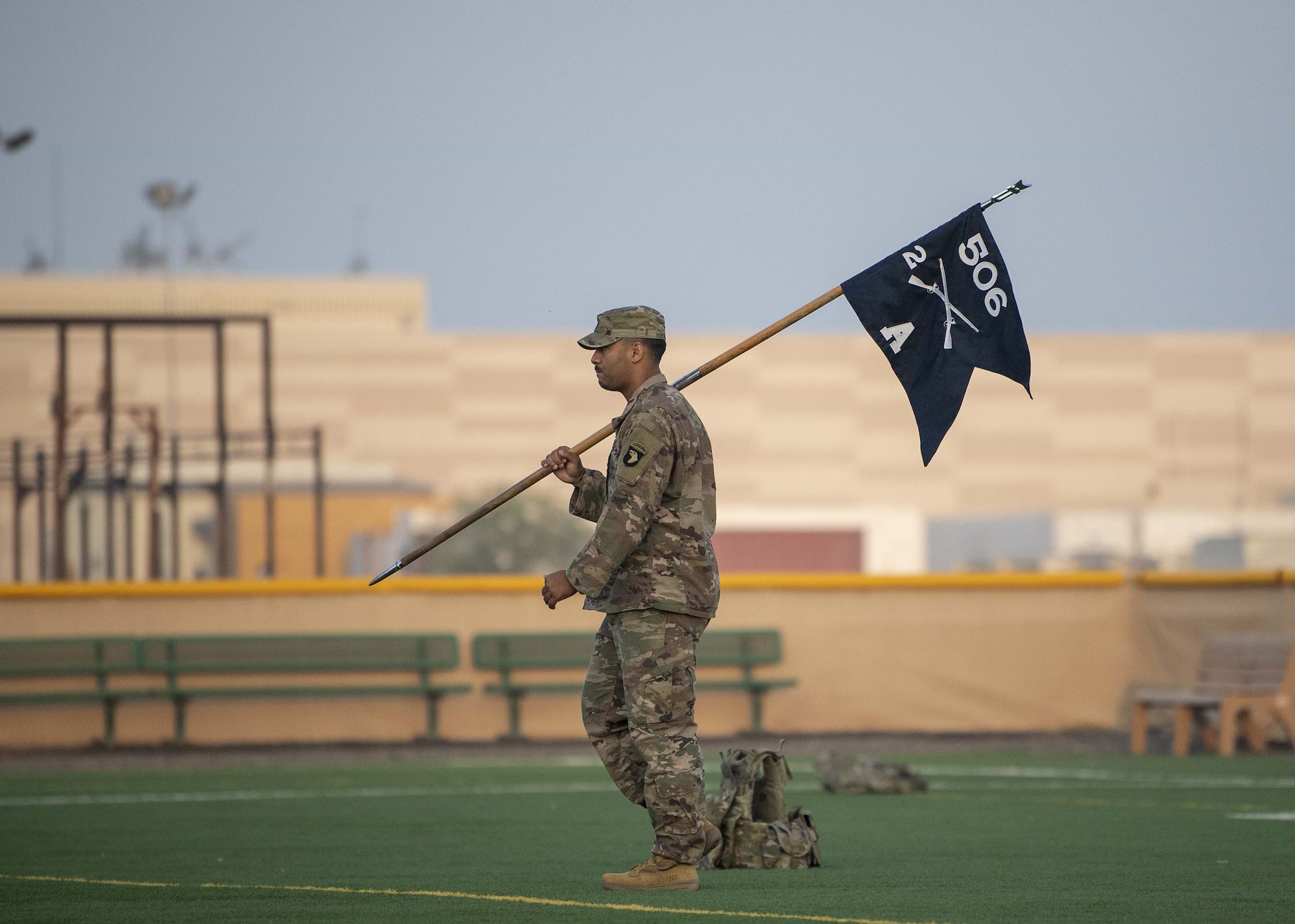 A U.S. Army Soldier from the 101st Division, 2nd Battalion, 506th Infantry Regiment, East African Response Force (EARF), walks with his battalion guideon during the EARF’s best platoon competition at Camp Lemonnier, Djibouti, Oct. 25, 2019. During the competition Soldiers completed a two-mile run, 25 meters of lunges, burpee long jumps and high crawls before finishing with 10 eight-count push-ups. (U.S. Air Force photo by Staff Sgt. J.D. Strong II)