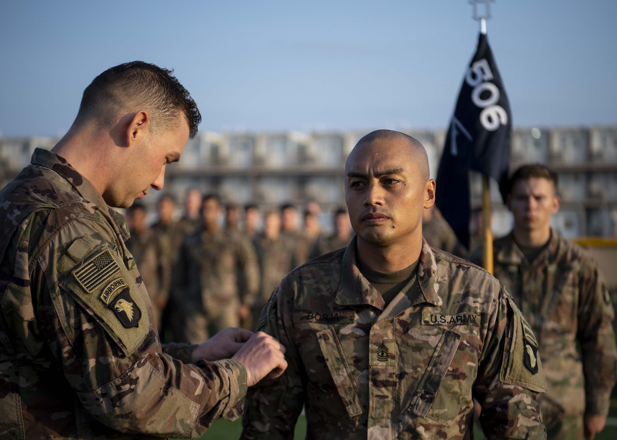 U.S. Army Capt. Christopher Baer, company commander, 101st Division, 2nd Battalion, 506th Infantry Regiment, East African Response Force (EARF), presents U.S. Army 1SG Zachary Borja, first sergeant, 101st Division, 2nd Battalion, 506th Infantry Regiment, EARF, with his deployment patch during a patching ceremony at Camp Lemonnier, Djibouti, Oct. 25, 2019. Army combat patches signify a Soldier’s service in a combat zone and represent service in a member’s current, or prior, unit. (U.S. Air Force photo by Staff Sgt. J.D. Strong II)