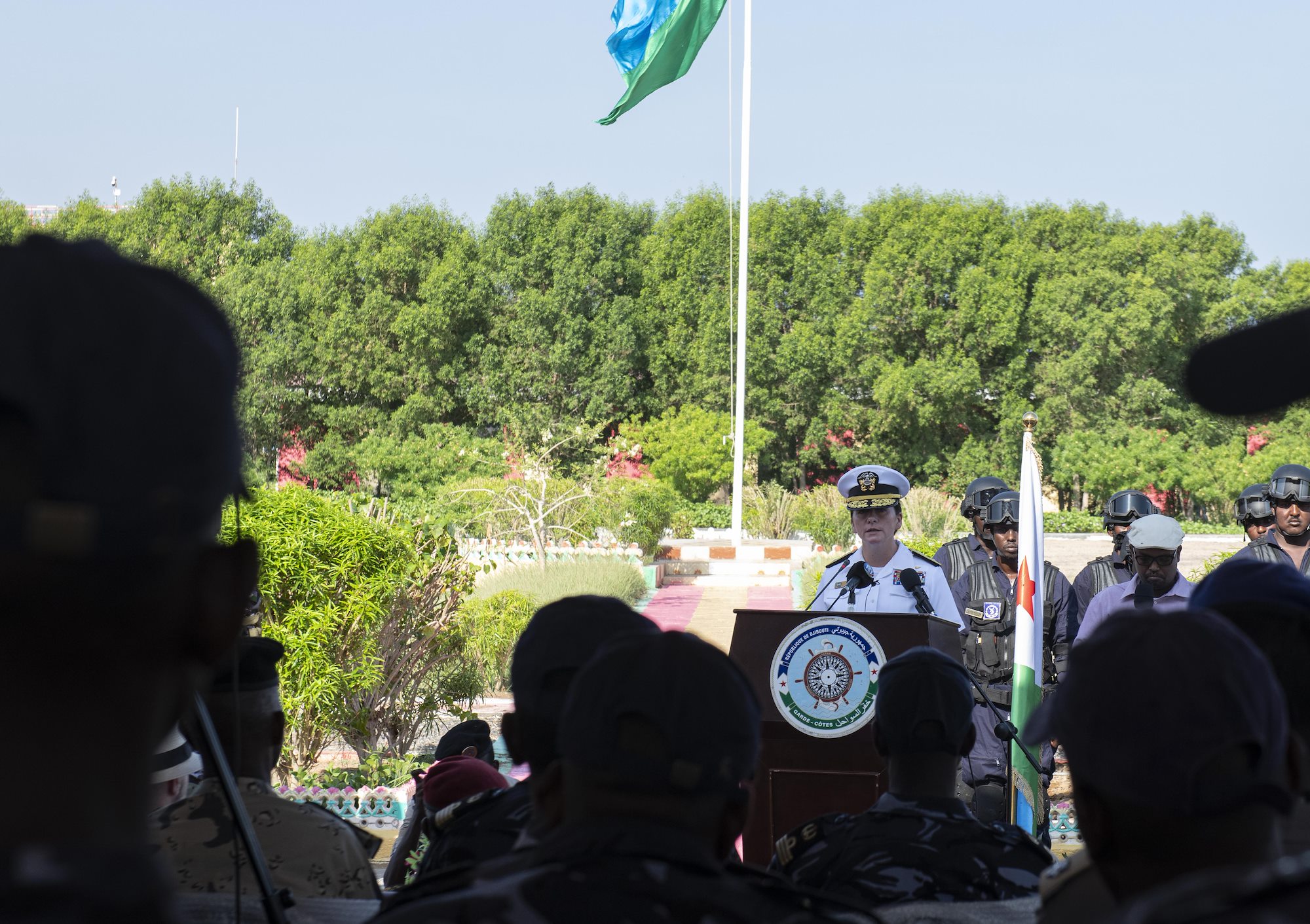 Rear Adm. Nancy Lacore, vice commander, U.S. Sixth Fleet, and director, Maritime Partner Programs, U.S. Naval Forces Europe-Africa, speaks to attendees of the multinational maritime exercise Cutlass Express 2019.2 (CE 19.2) during the opening ceremony held at the Doraleh Coast Guard Training Center in Djibouti, Oct. 28, 2019. Cutlass Express is designed to improve regional cooperation, maritime domain awareness and information sharing practices to increase capabilities among the U.S., East African and Western Indian Ocean nations to counter illicit maritime activity. (U.S. Air Force photo by Senior Airman Gabrielle Spalding)