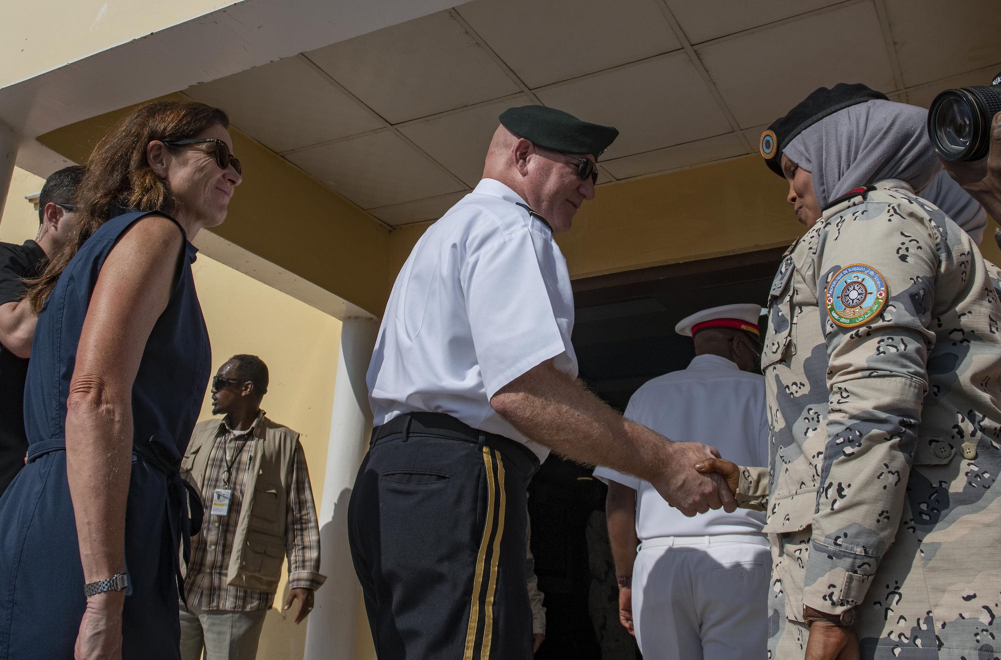 U.S. Army Maj. Gen. Michael D. Turello, commanding general, Combined Joint Task Force–Horn of Africa (CJTF-HOA) (center), shakes hands with a Djiboutian military member following the opening ceremony of the multinational maritime exercise Cutlass Express 2019.2 (CE 19.2) held at the Doraleh Coast Guard Training Center in Djibouti, Oct. 28, 2019. Cutlass Express is designed to improve regional cooperation, maritime domain awareness and information sharing practices to increase capabilities among the U.S., East African and Western Indian Ocean nations to counter illicit maritime activity. (U.S. Air Force photo by Senior Airman Gabrielle Spalding)