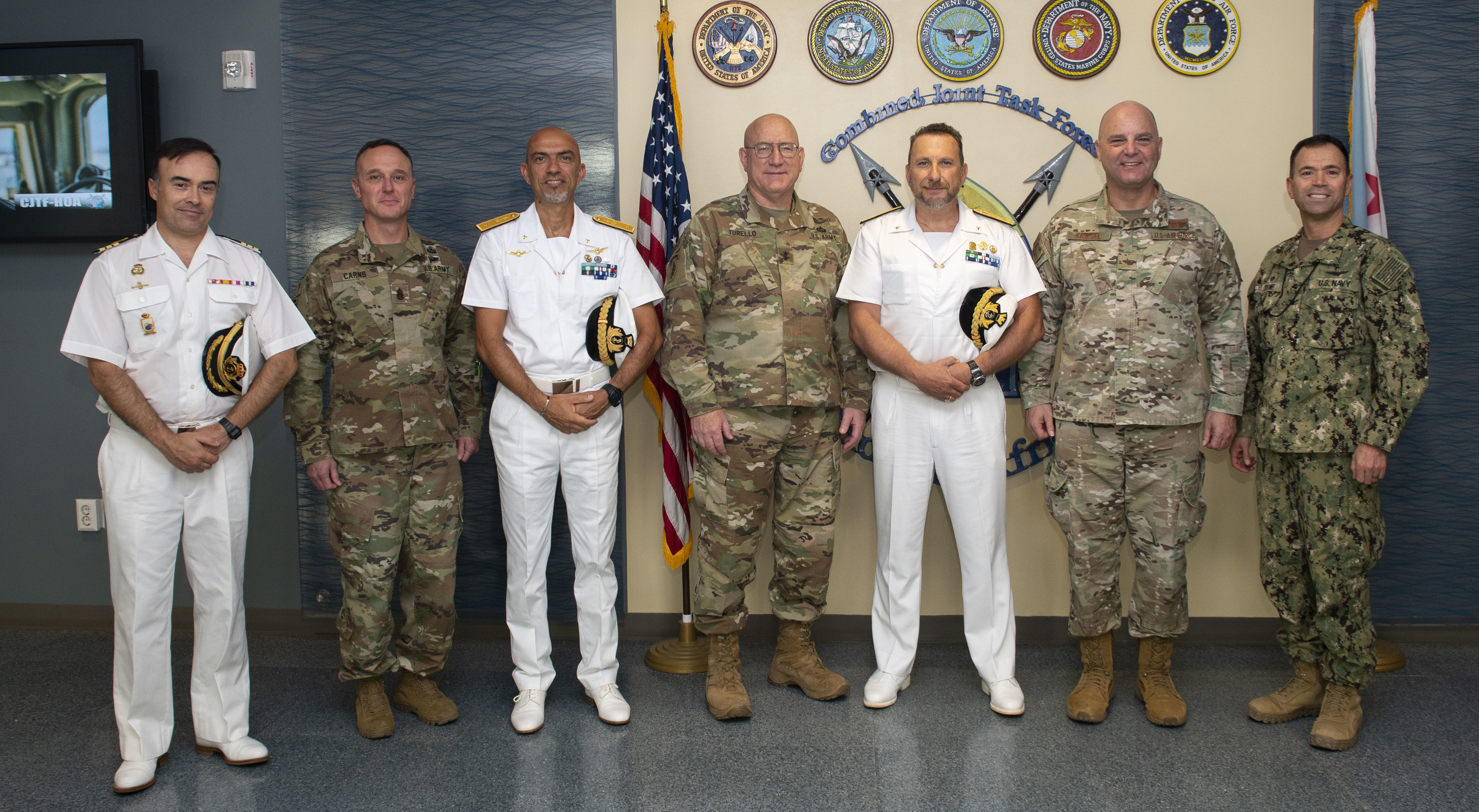 U.S. Army Maj. Gen. Michael Turello, commanding general, Combined Joint Task Force-Horn of Africa (CJTF-HOA), center, poses for a photo with Italian Rear Adm. Giovanni Piegaja, deputy operation commander, Operation Atalanta, center right, and other service members from CJTF-HOA, Camp Lemonnier and Operation Atalanta at Camp Lemonnier, Djibouti, July 21, 2019. Piegaja and members of his staff visited CJTF-HOA to discuss the Atalanta mission and strengthen the partnership between CJTF-HOA and Operation Atalanta. (U.S. Air Force photo by Senior Airman Gabrielle Spalding)
