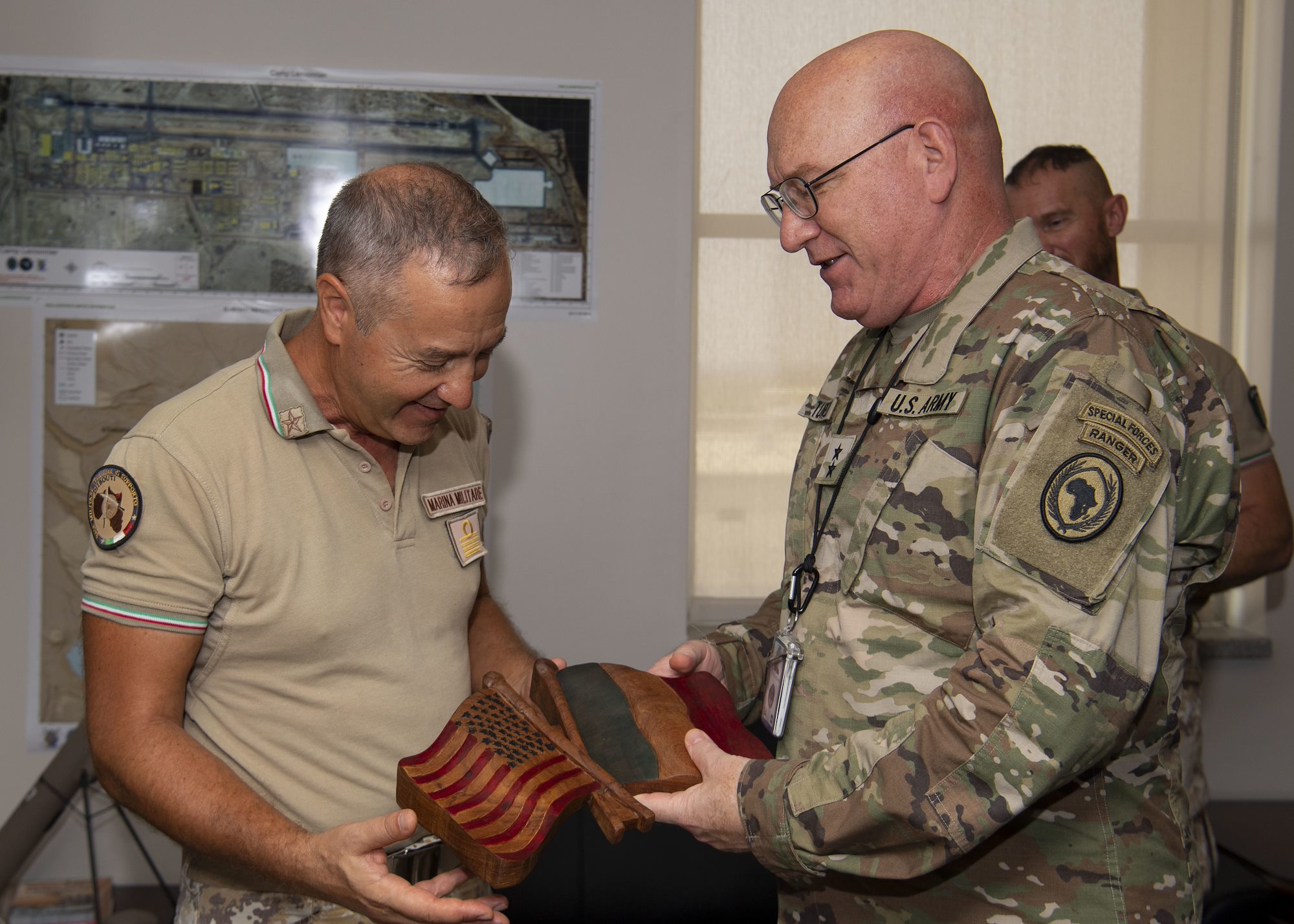 U.S. Army Maj. Gen. Michael D. Turello, commanding general, Combined Joint Task Force-Horn of Africa (CJTF-HOA), right, presents Italian navy Capt. Liborio Palombella, deputy commander, Italian Navy Training Center, left, with a gift after his visit to Camp Lemonnier, Djibouti, July 15, 2019. Palombella visited Camp Lemonnier to learn about the CJTF-HOA mission and its contributions to East Africa. (U.S. Air Force photo by Staff Sgt. J.D. Strong II)