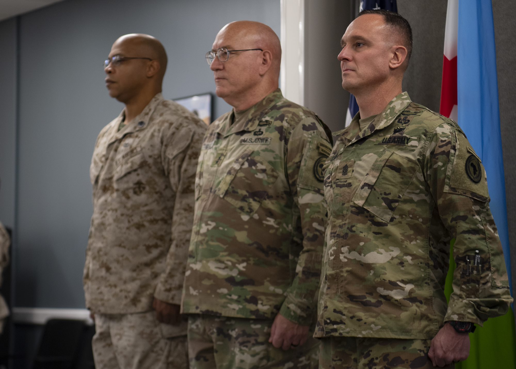 U.S. Army Maj. Gen. Michael Turello, commanding general, Combined Joint Task Force-Horn of Africa (CJTF-HOA), center, presides over the change of responsibility ceremony between incoming CJTF-HOA command senior enlisted leader, U.S. Army Command Sgt. Maj. Shawn Carns, and outgoing CSEL, U.S. Marine Corps Master Gunnery Sgt. Vito Harris, at Camp Lemonnier, Djibouti, July 22, 2019. The CSEL is the principal advisor to the commander and bears the special responsibility of guardianship for all. (U.S. Air Force photo by Staff Sgt. J.D. Strong II)