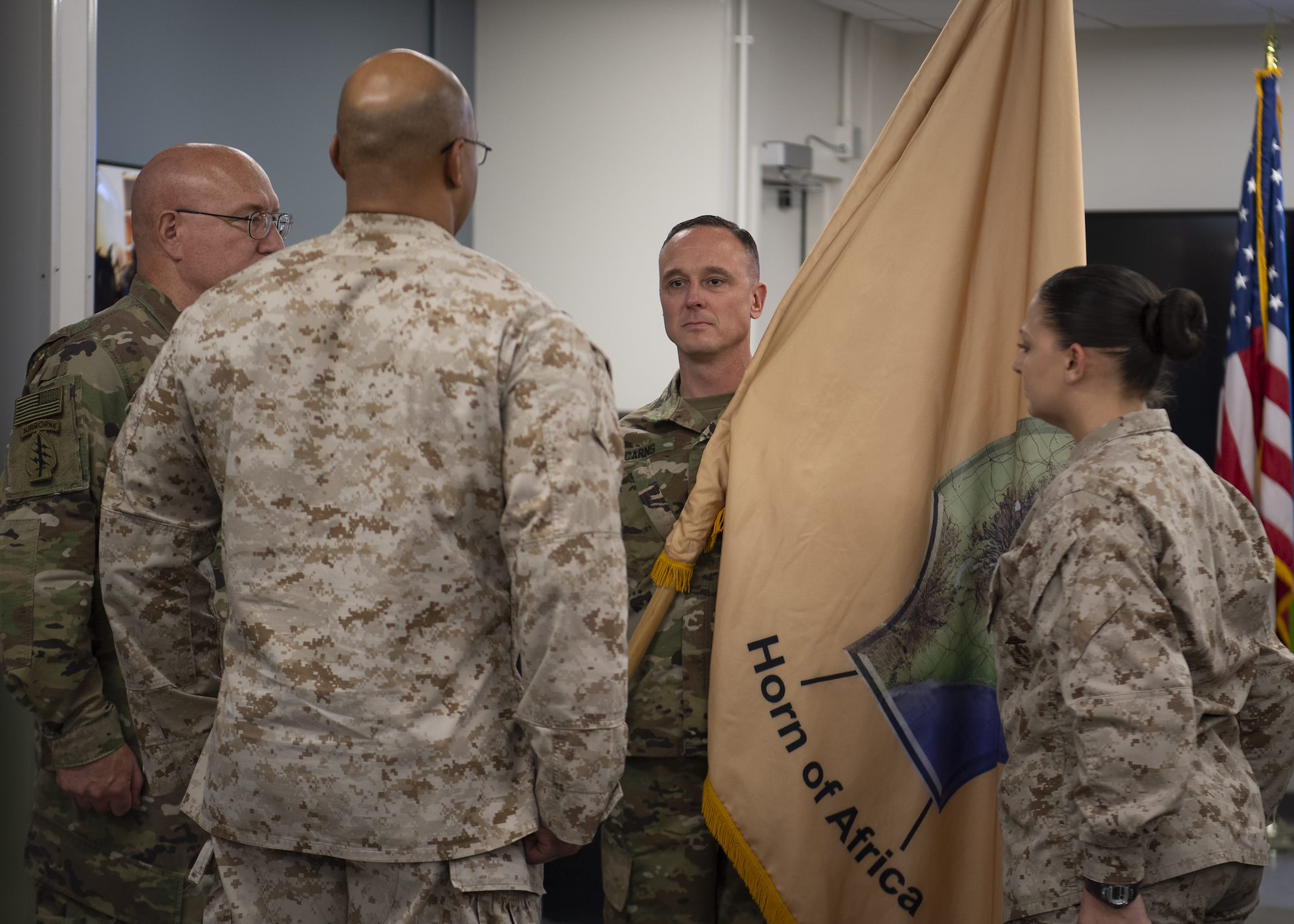 U.S. Army Command Sgt. Maj. Shawn Carns, incoming command senior enlisted leader (CSEL), Combined Joint Task Force-Horn of Africa (CJTF-HOA), assumes responsibility as CSEL by accepting the unit colors from U.S. Army Maj. Gen. Michael Turello, commanding general, CJTF-HOA, at Camp Lemonnier, Djibouti, July 22, 2019. The passing of the colors symbolizes the transfer of responsibility and authority from outgoing CSEL U.S. Marine Corps Master Gunnery Sgt. Vito Harris, to incoming CSEL, Carns. (U.S. Air Force Staff Sgt. J.D. Strong II)