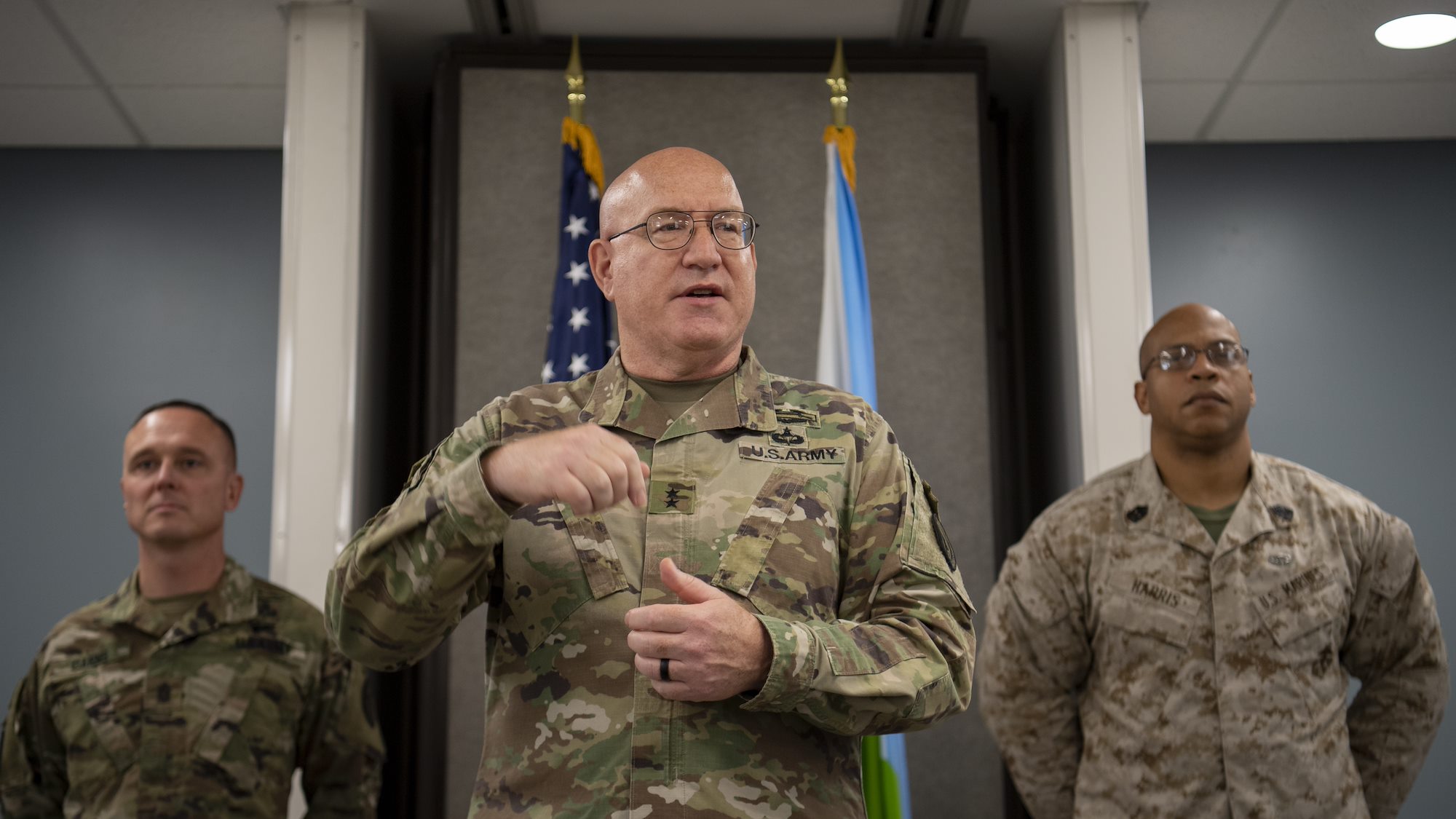 U.S. Army Maj. Gen. Michael Turello, commanding general, Combined Joint Task Force—Horn of Africa (CJTF-HOA), provides comments during a change of responsibility at Camp Lemonnier, Djibouti, July 22, 2019. As the commander of CJTF-HOA, Turello officiated the ceremony. (U.S. Air Force Staff Sgt. J.D. Strong II)