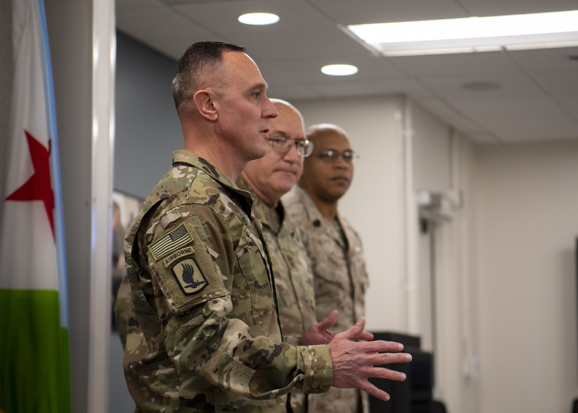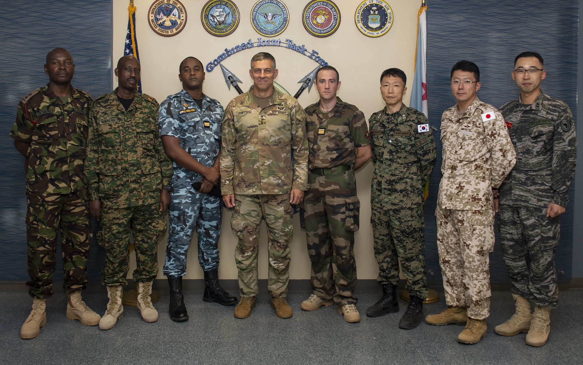 U.S. Army Gen. Stephen J. Townsend, commander, U.S. Africa Command (AFRICOM), center left, meets with foreign liaison officers assigned to Combined Joint Task Force-Horn of Africa (CJTF-HOA), during a visit to Camp Lemonnier, Djibouti (CLDJ), Aug. 6, 2019. Townsend visited CLDJ to familiarize himself with CJTF-HOA personnel and mission. AFRICOM is responsible for building defense capabilities, responding to crises, deterring and defeating transnational threats in order to advance U.S. national interests and promote regional security, stability, and prosperity, all in concert with interagency and international partners. (U.S. Air Force photo by Senior Airman Gabrielle Spalding)