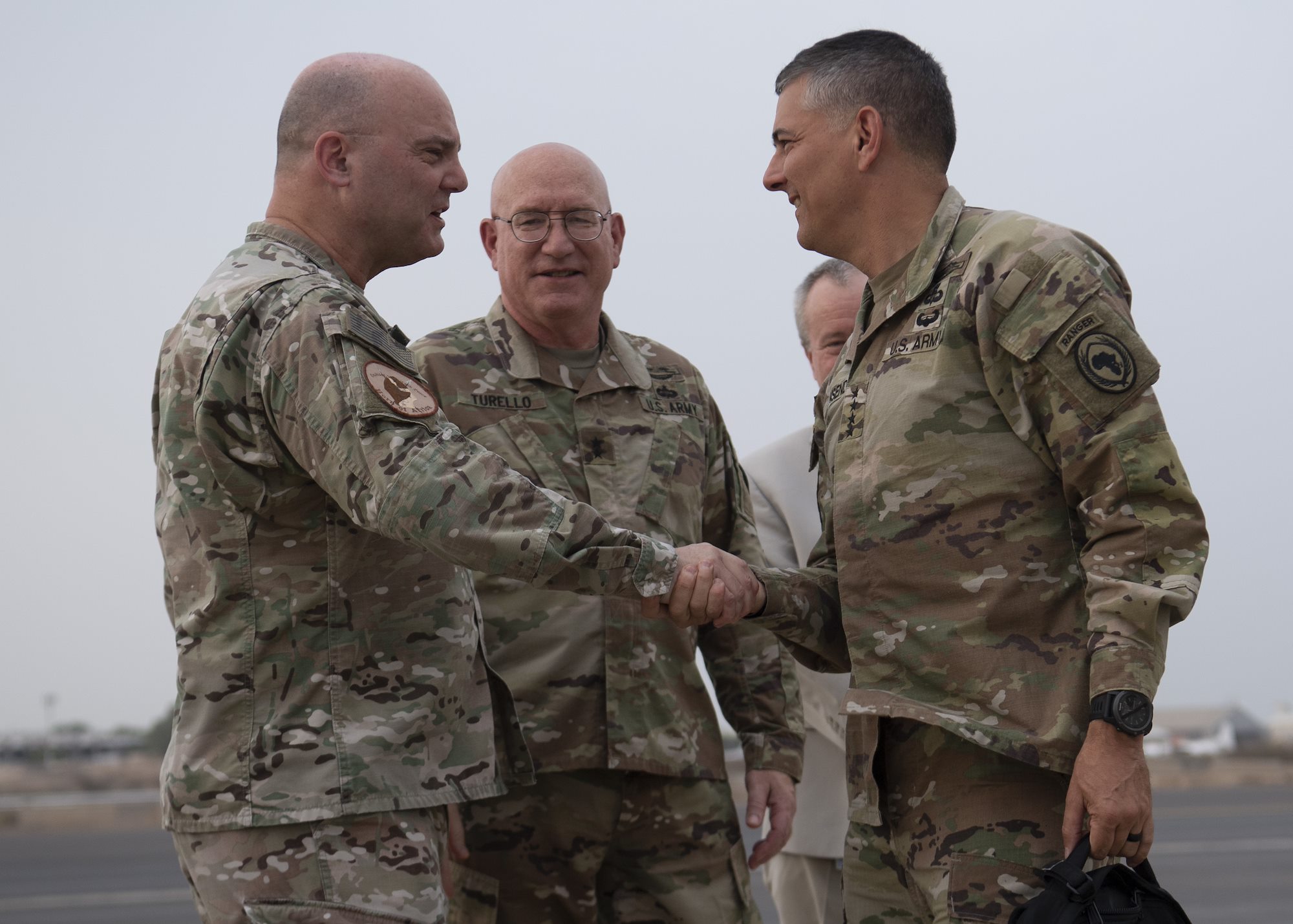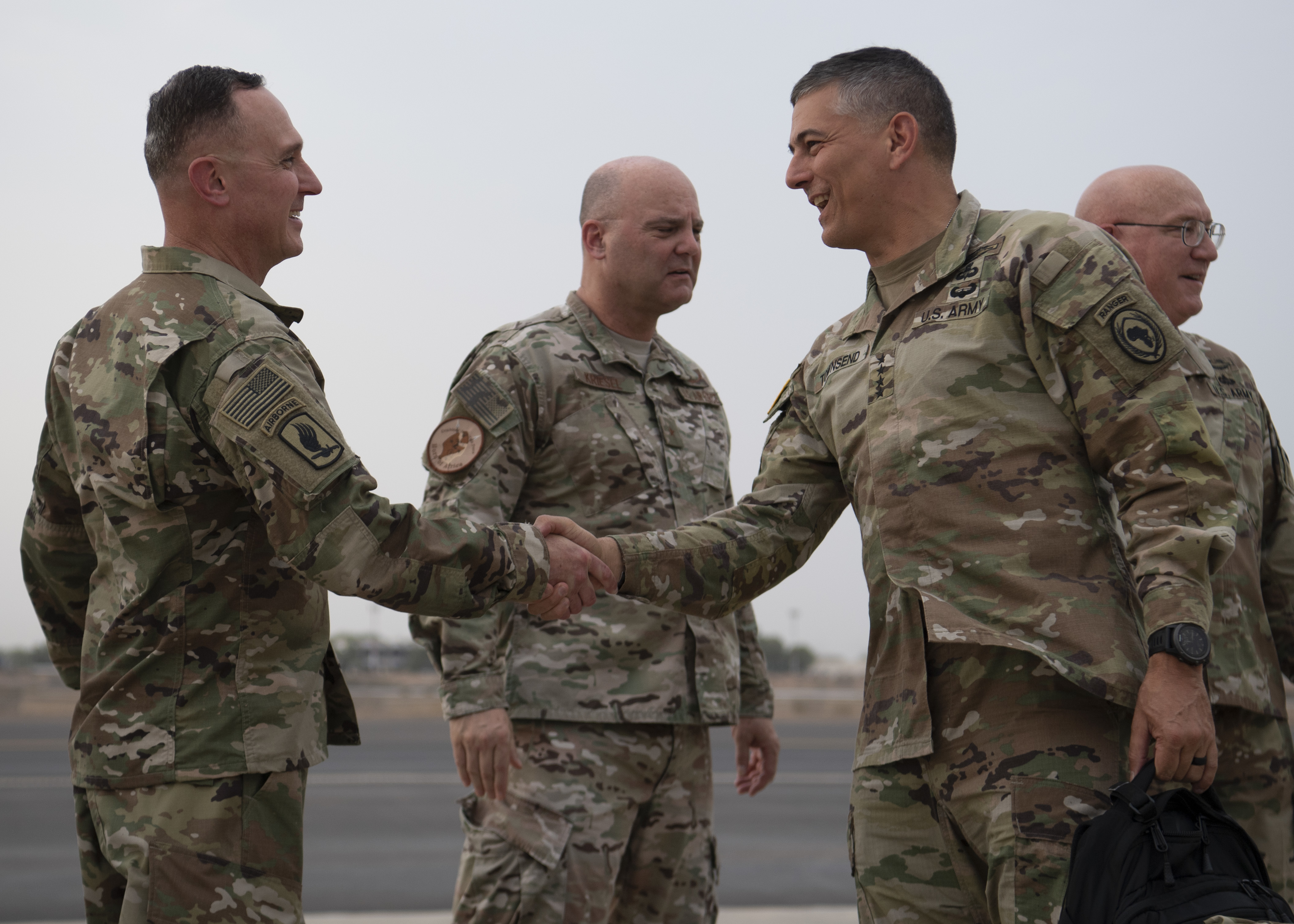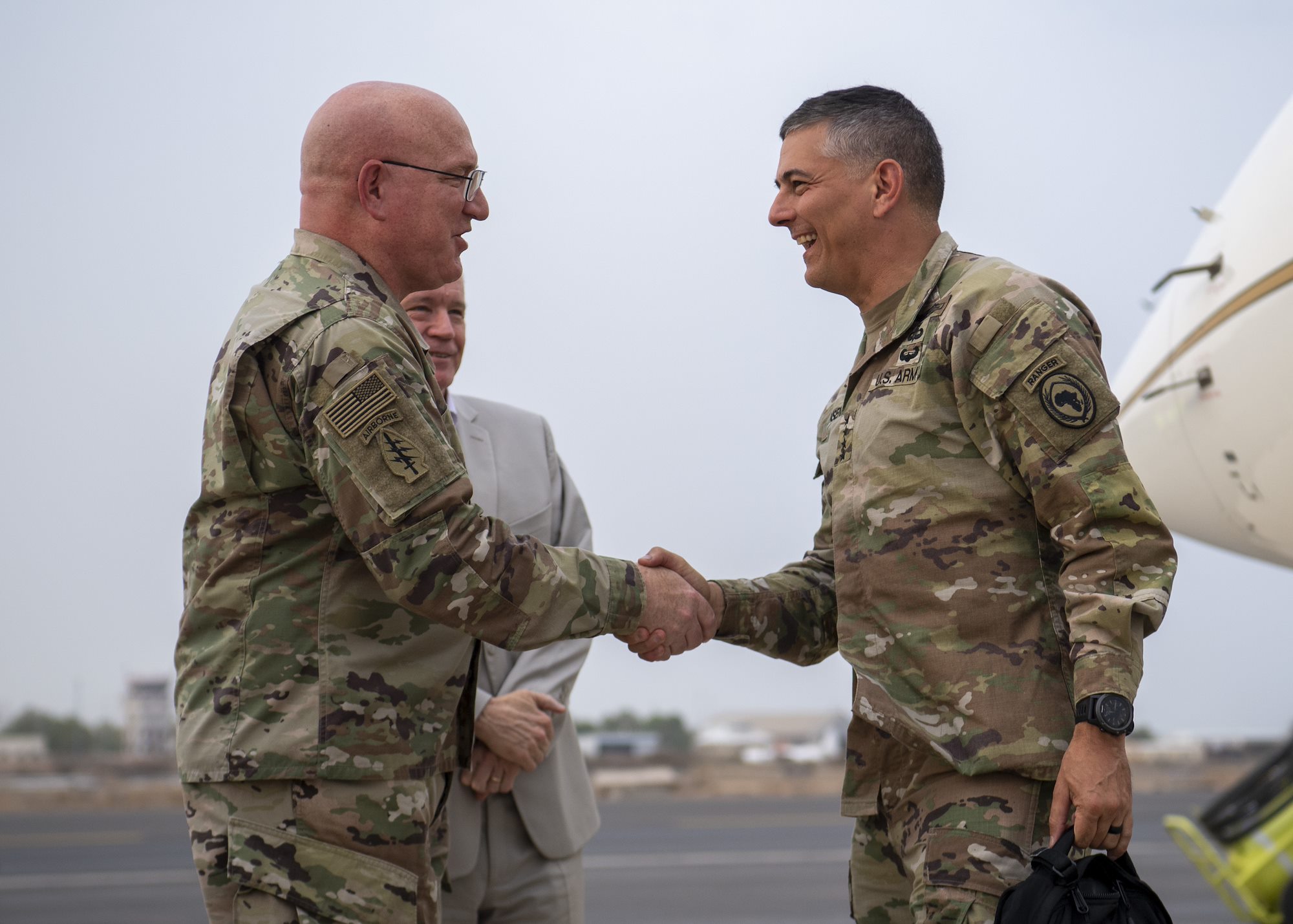 U.S. Army Gen. Stephen J. Townsend, commander, U.S. Africa Command (AFRICOM), right, is greeted by U.S. Army Command Sgt. Maj. Shawn Carns, command senior enlisted leader, Combined Joint Task Force-Horn of Africa (CJTF-HOA), at Camp Lemonnier, Djibouti, August 5, 2019. As commander of AFRICOM Townsend is in charge of military relations with African nations, the African Union and African regional security organizations. Townsend visited Djibouti as part of his familiarization of CJTF-HOA. (U.S. Air Force photo by Staff Sgt. J.D. Strong II) (U.S. Air Force photo by Staff Sgt. J.D. Strong II)